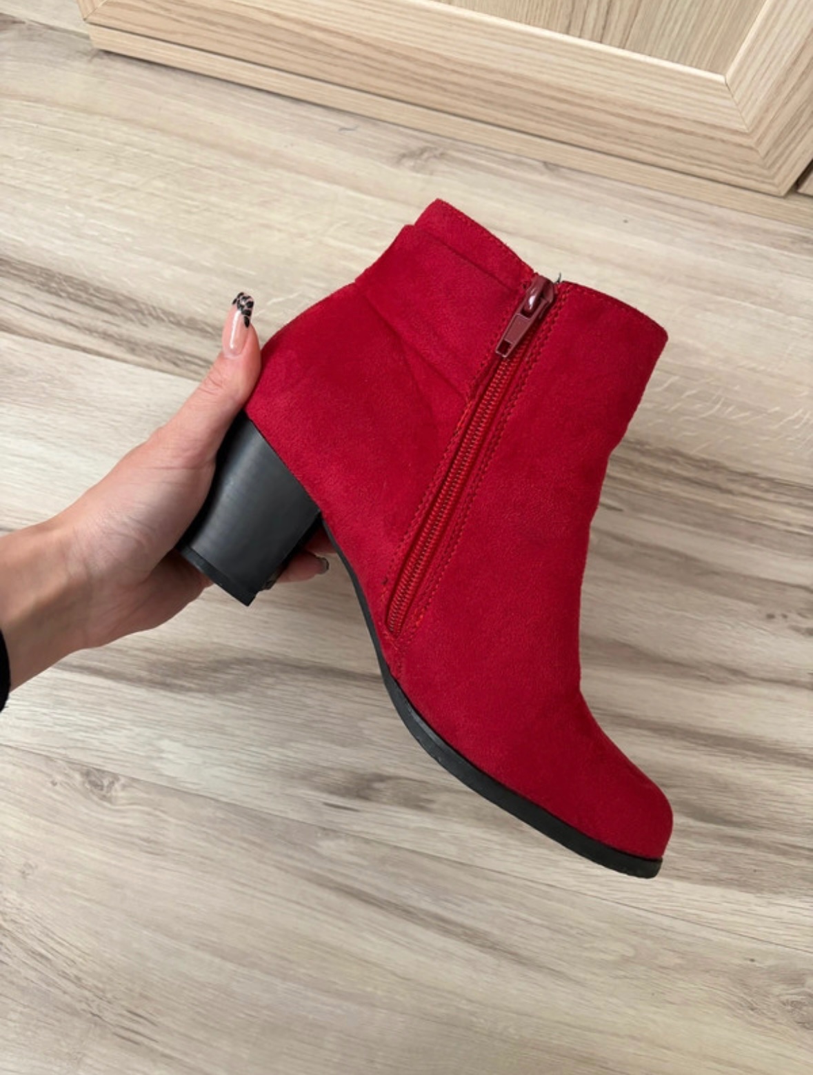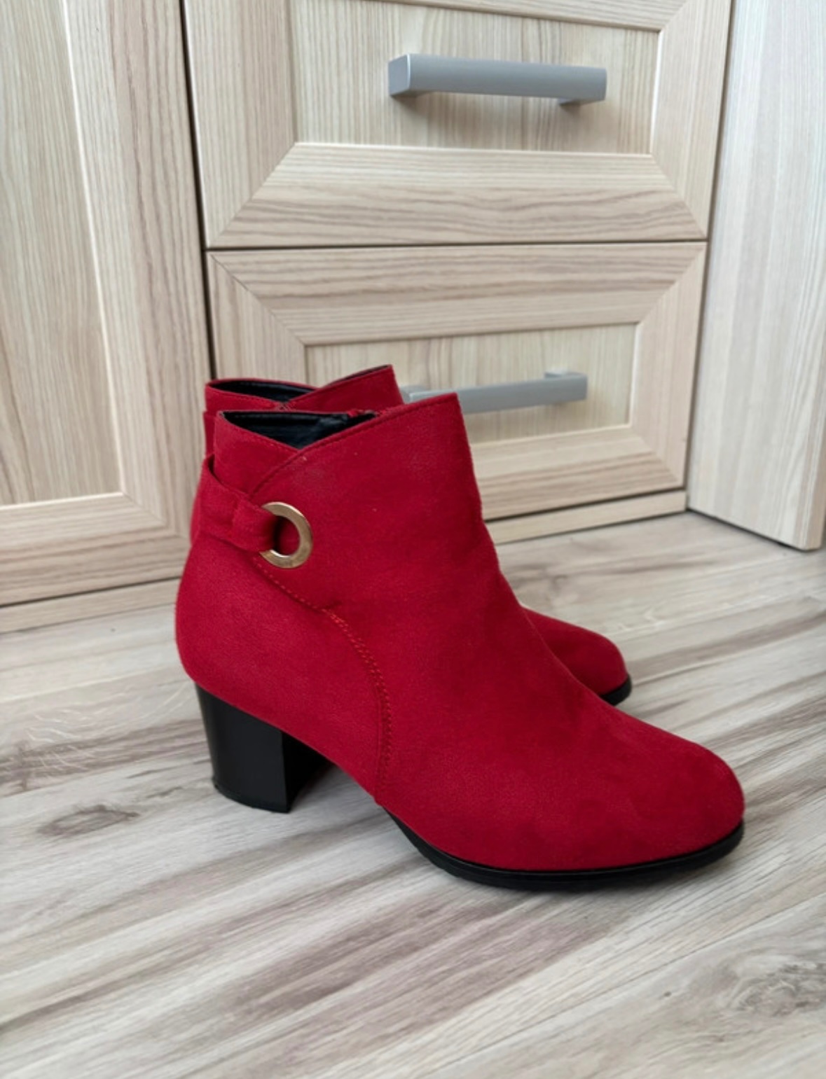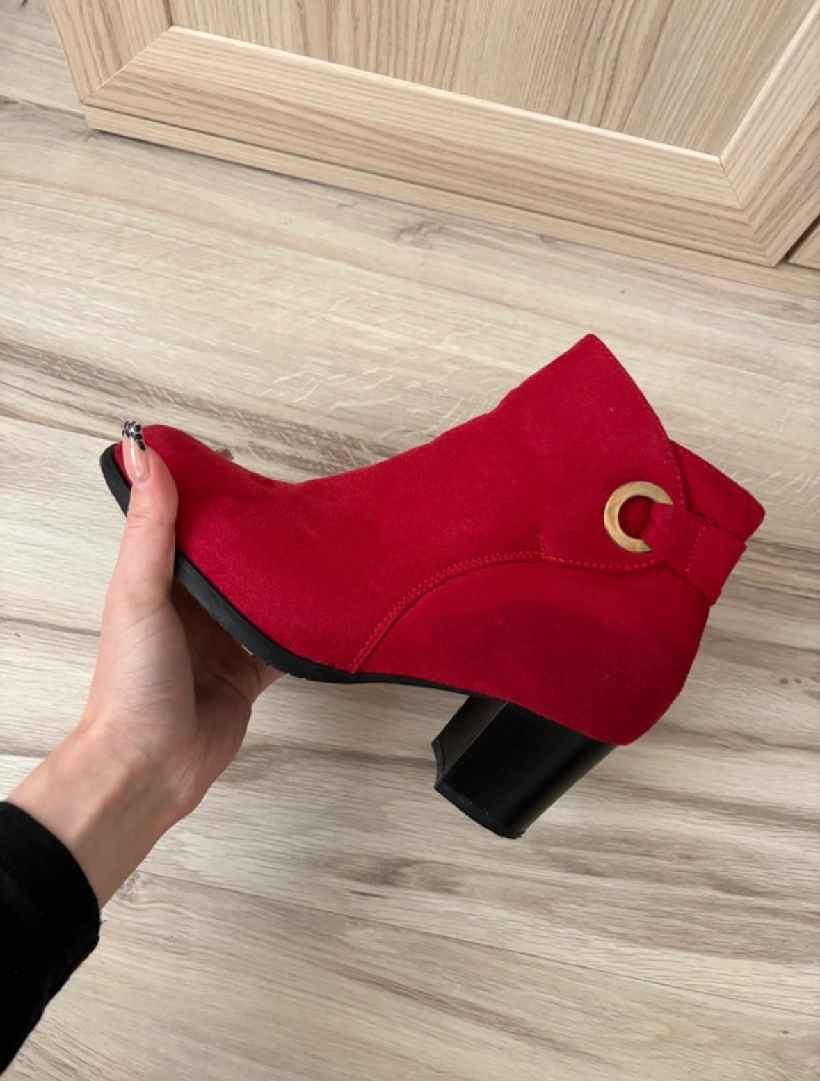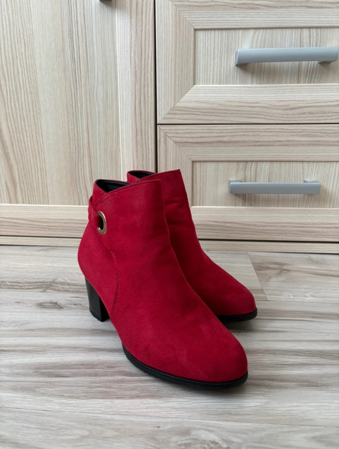Kvalitné luxusné semišové čižmičky v žiarivej červenej farbe. Boli raz použité na večernú akciu - iba na koberci, nemajú žiadne známky použitia, bez defektov. Vyska opätku 9 cm PC 210 Eur