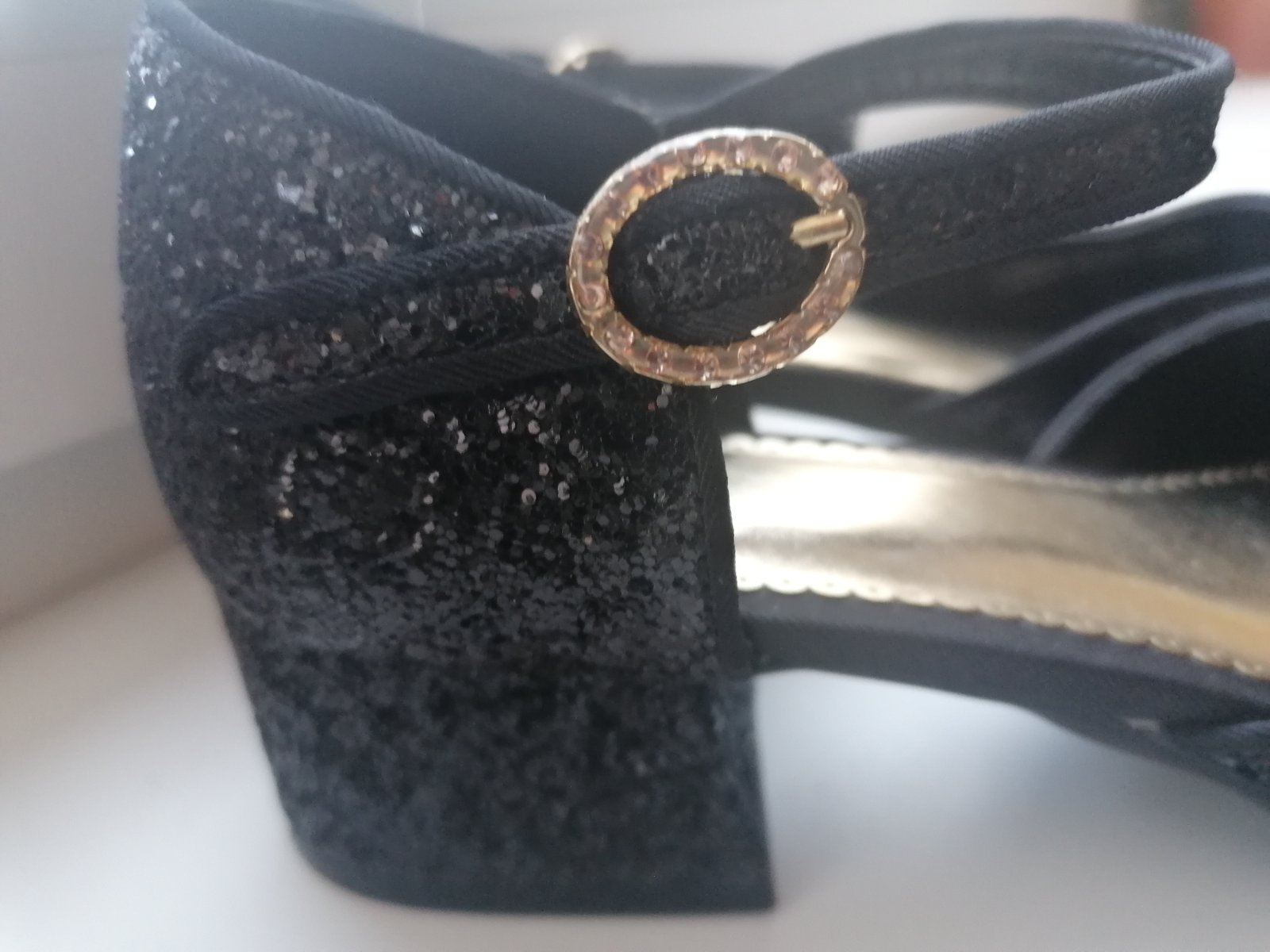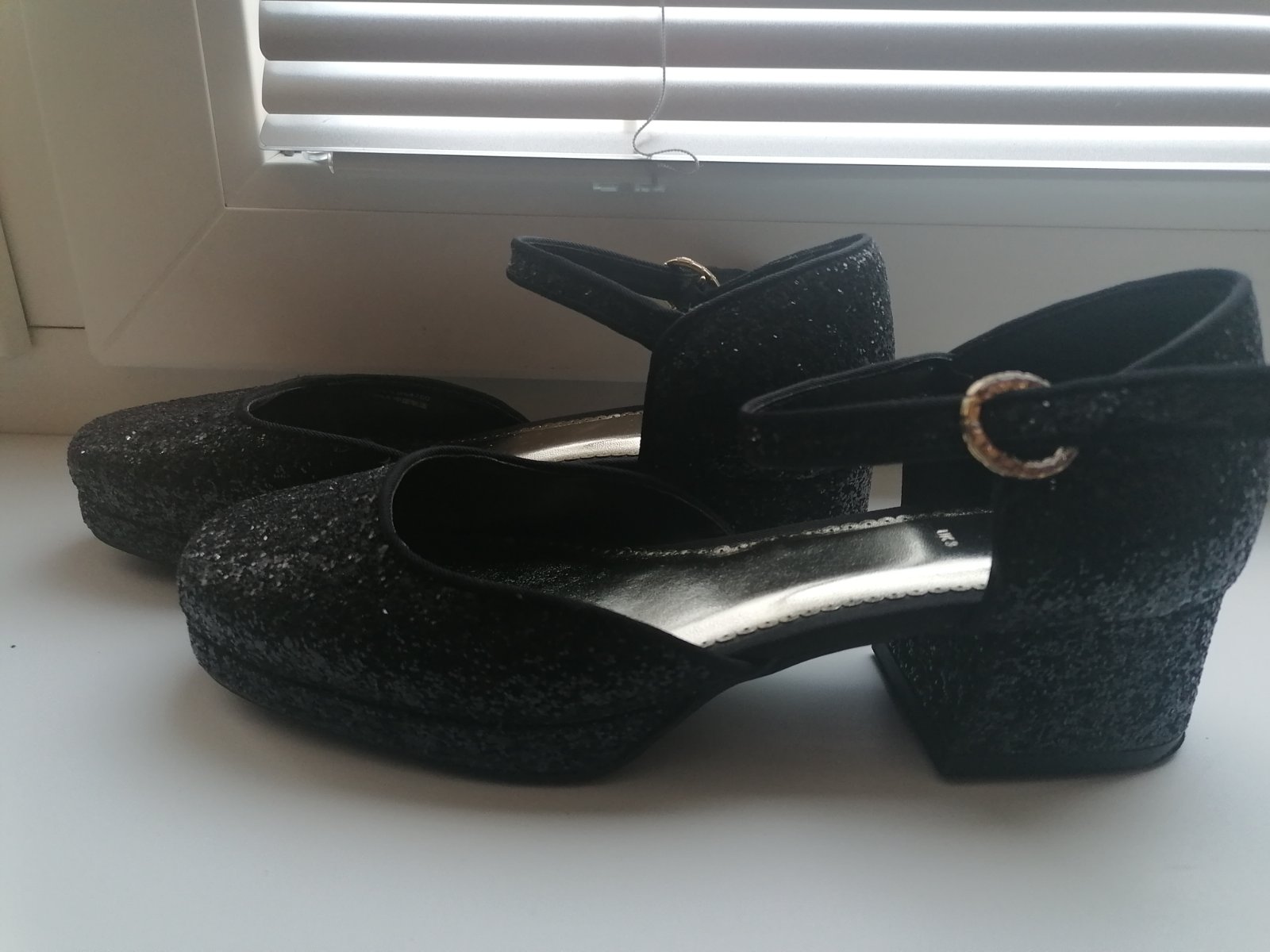 Krásne spoločenské topánky/sa šálky čierne s trblietkami. Obuté jeden krát, ako nové. Veľkosť je 3, naša 35, vnútorná dĺžka je 22,5 cm.