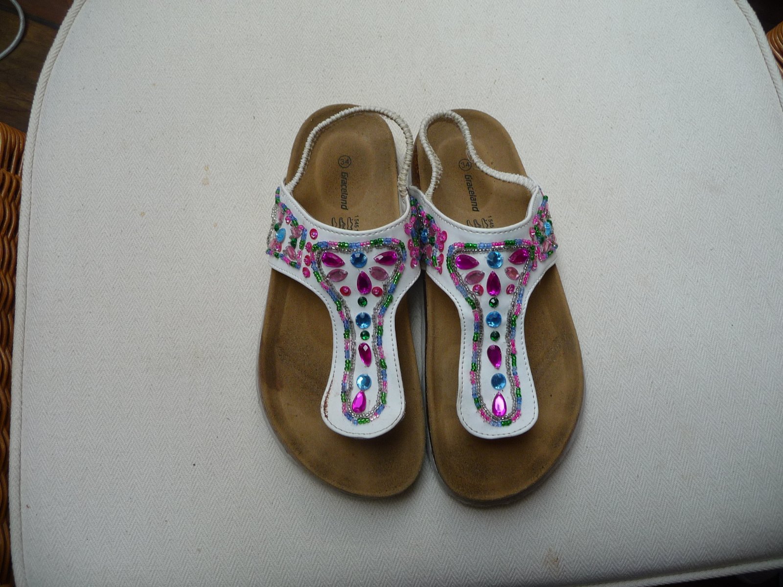 Predám krásne šľapky zn. Graceland. Vo veľmi dobrom stave. Málo nosené. Podrážka nie je schodena. S našitými farebnými kamienkami a korálkami. Žiadny nechýba. Veľkosť 34.