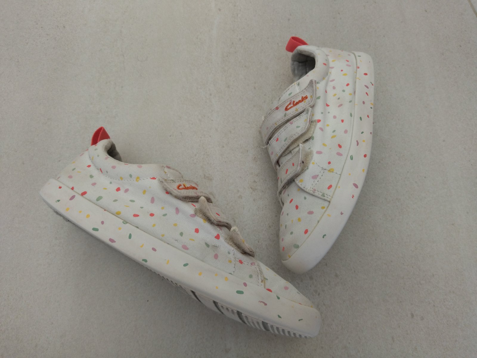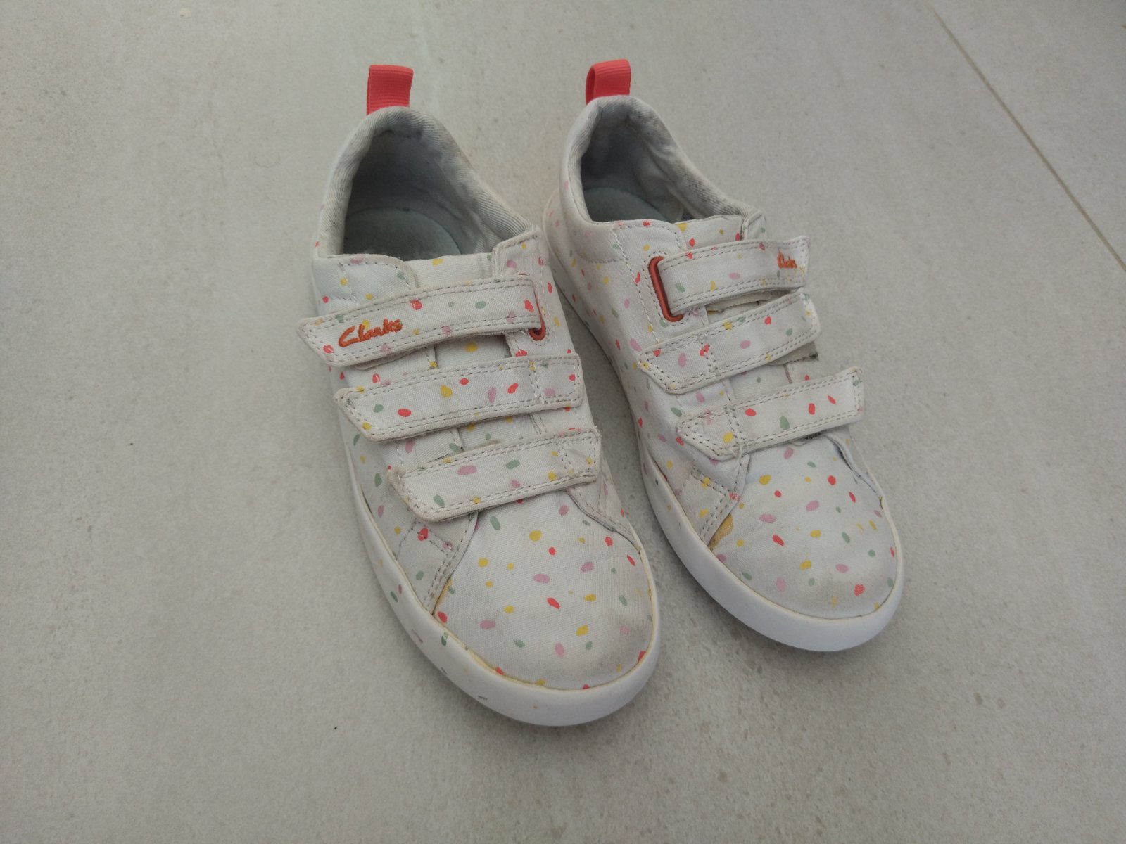 Predám málo nosené plátenky zn. Clarks. Po jednom dieťati. Nosené len na telesnú. Vo veľmi dobrom stave bez poškodení. Podrážka mierne osuchana - viď foto - nie je predrata. Možné prať v práčke na 30 stupňov. Veľkosť EU 33.5; UK 1.5. Zapínanie na 3x suchý zips.