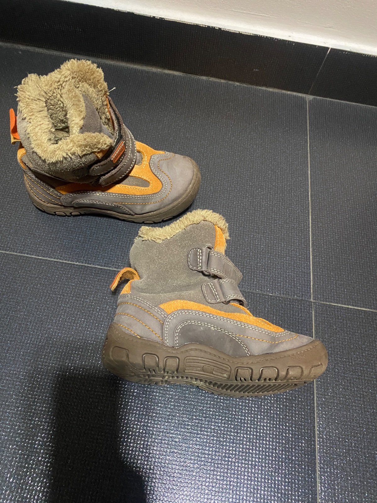 Predám zimné čižmičky skôr na suchú zimu i keď nikdy nepremokli ani na snehu..Šedá farba sa zpredu vyšuchala ale napriek tomu stále veľmi pekné. Vnút. dĺžka 16,5cm na doraz.