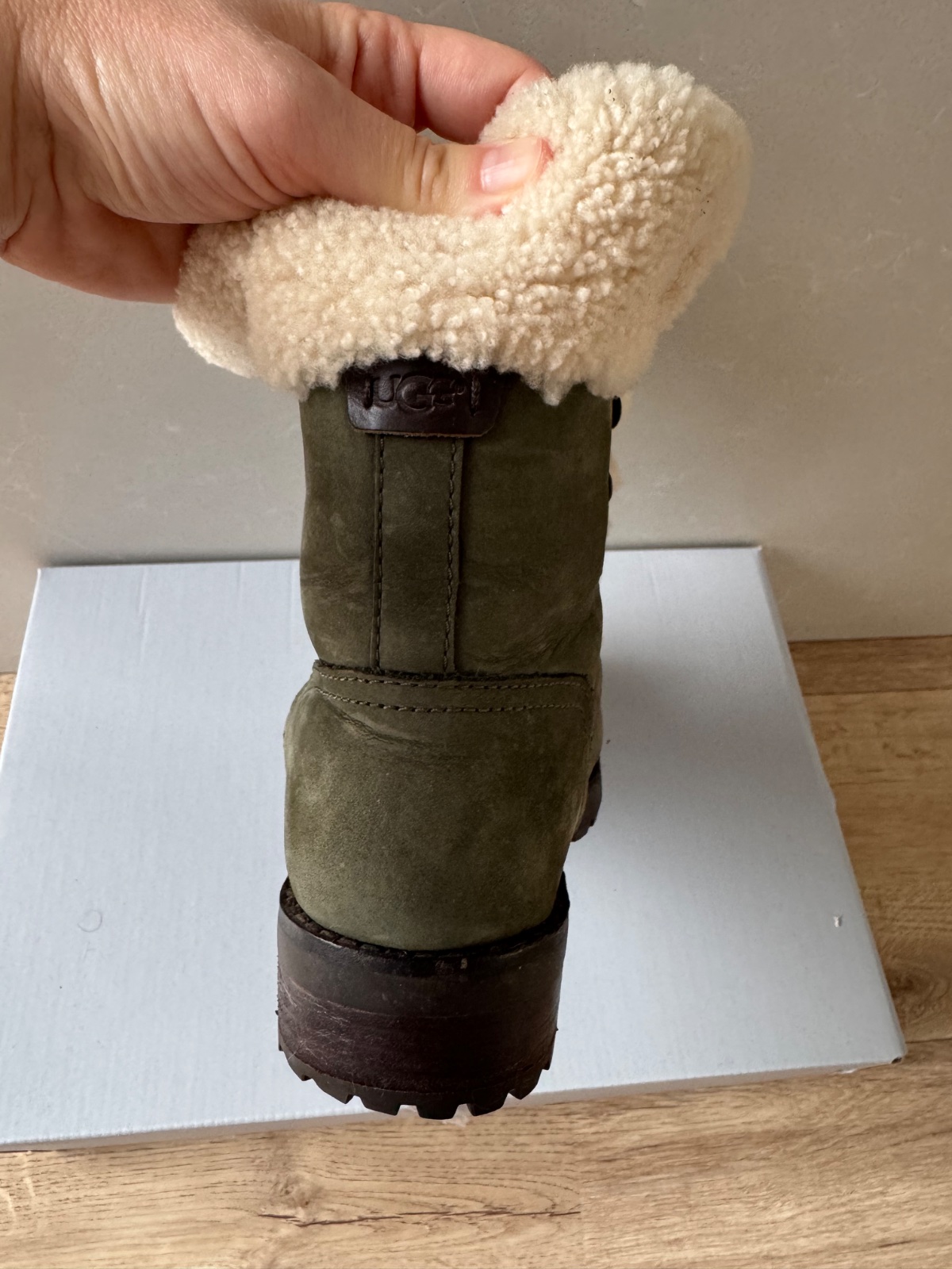 Predam damske / dievcenske cizmy original znacka UGG. Velkost je pisana 36.5, ale sedia skor na 36 vzhladom na uzsi tvar topanky. Cizmy su vo velmi dobrom stave, nosene minimalne. Prava cizma ma trosku osuchnuty vonkajsi material na spici - vidno to len pri detailnom pohlade.