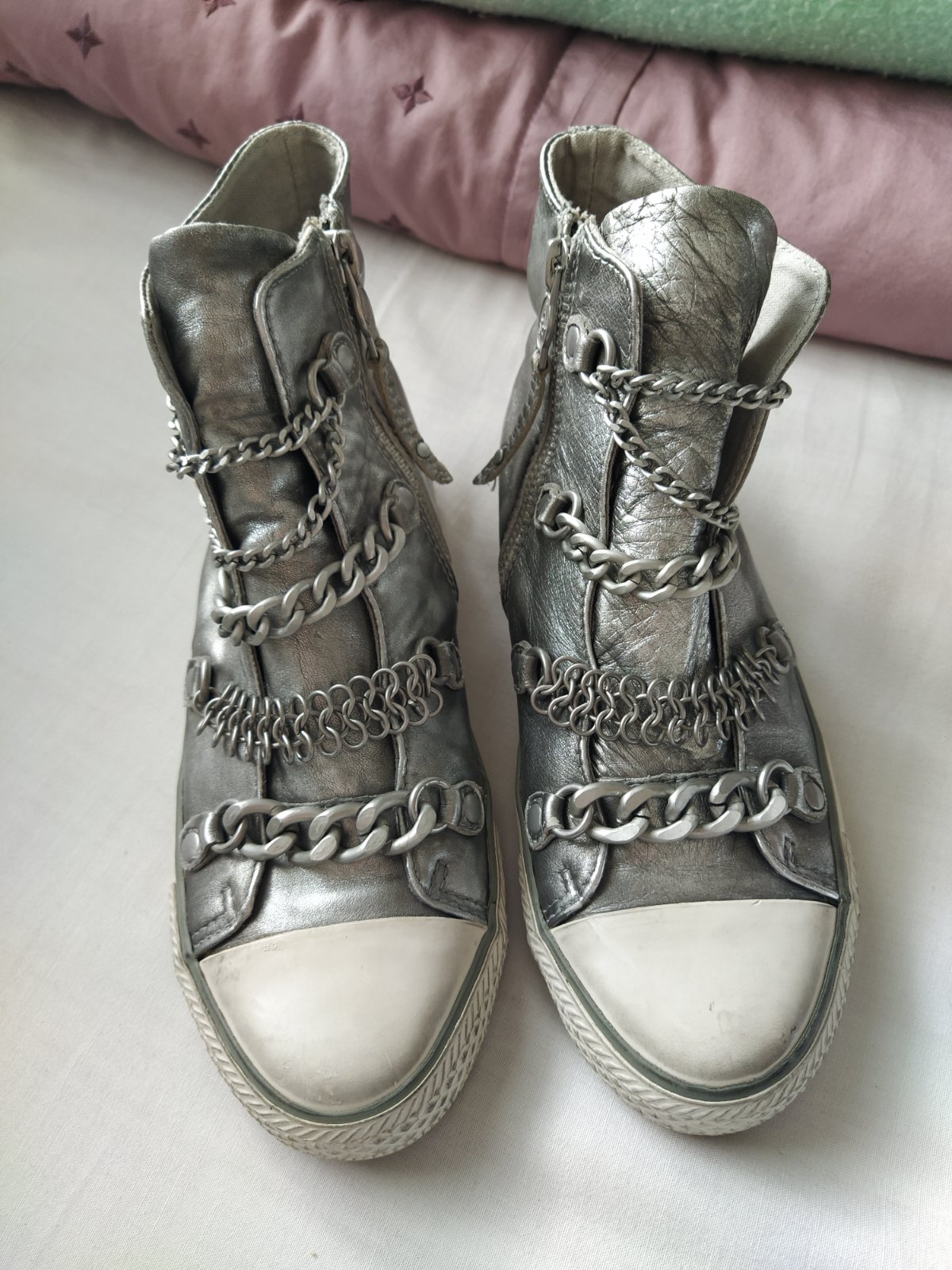 Tenisky z jemnej kože značky Ash, po mojej dcére, veľkosť 37 sedí na nohe, dĺžka vložky nameraná ako na fotke 24,5. Sú neschodene, cena+pošta strieborná farba všade pekné drží nič nezosuchane.