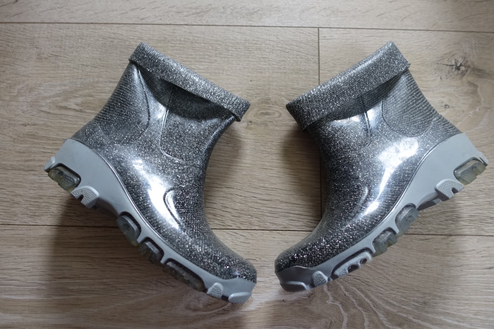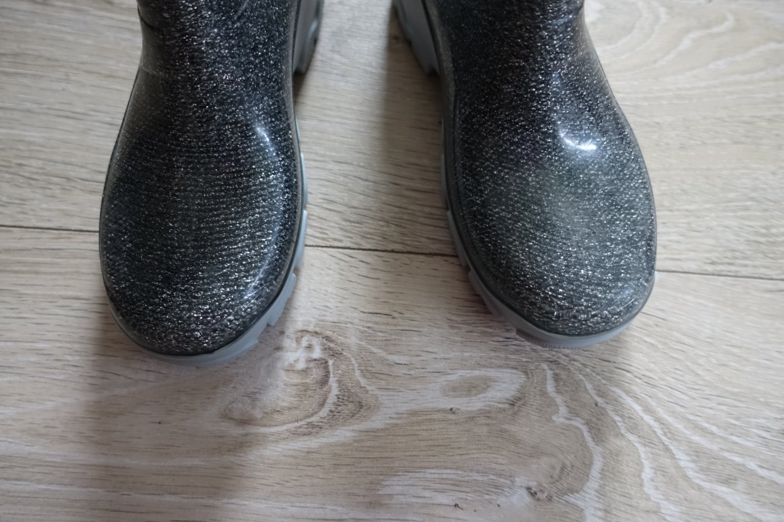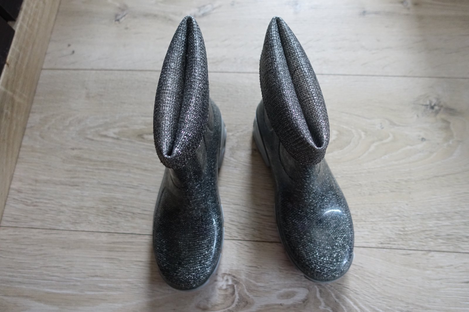 Predám prekrásne gumáčiky vo veľkosti 35/36. Čižmičky sú nezateplené. Farba je tmavošedá so striebornými trblietkami. Úžasné. Boli nosené mojou dcérkou, ale sú v krásnom stave. Kupované v CCC. Vonkajšia podrážka má celkovú dĺžku 24 cm. Vo vnútri som namerala 22,5 cm-23 cm, veľmi zle sa merajú. Ale skôr tých 22,5 cm. Výška meraná od päty po vrch je 17 cm.