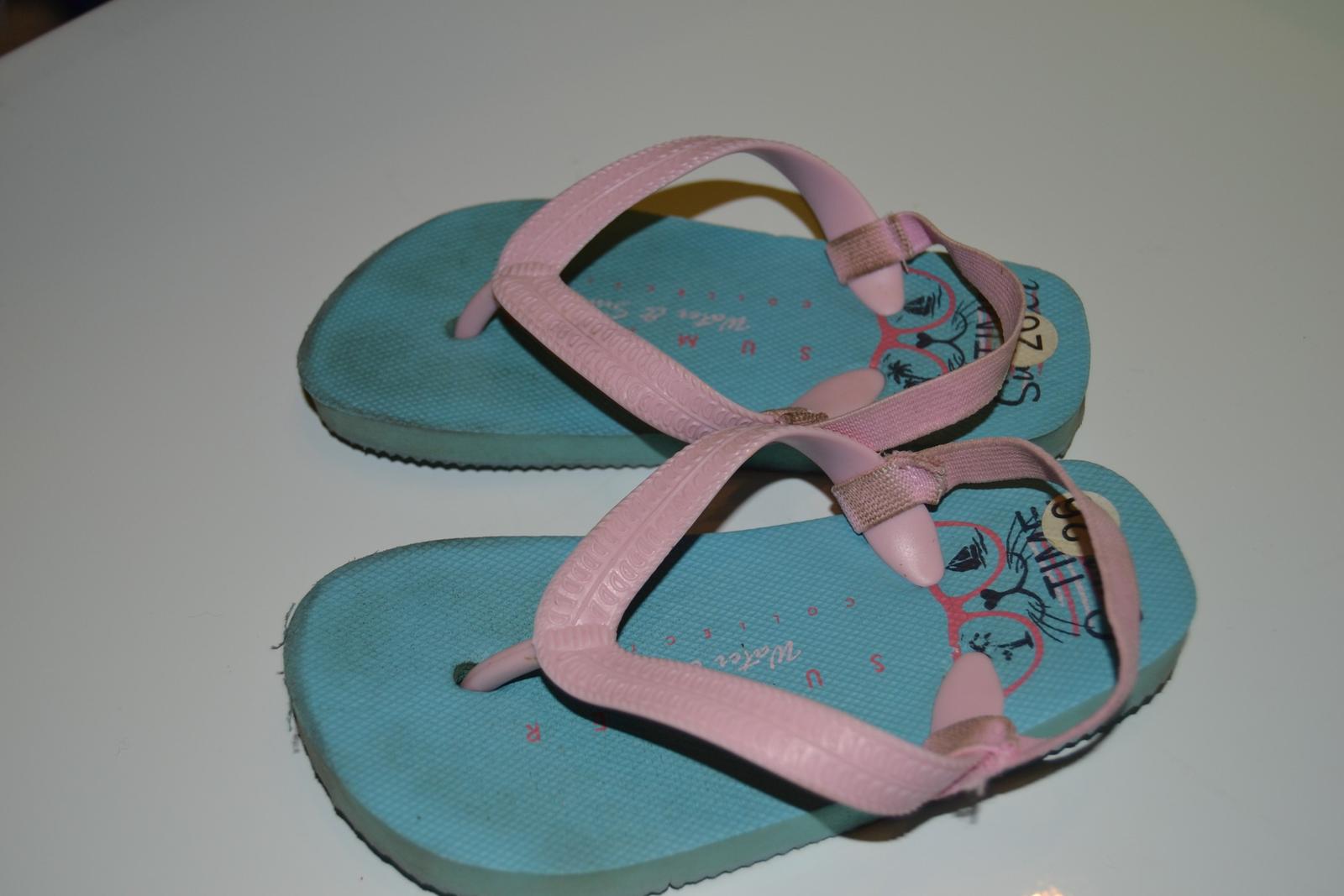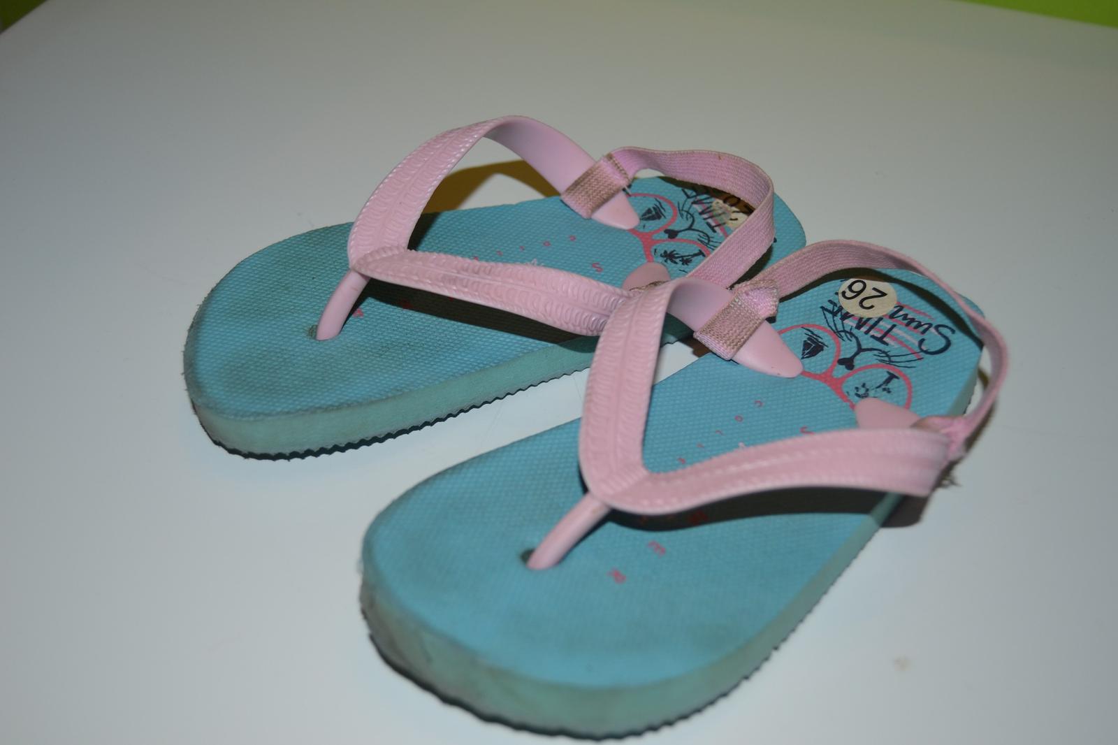 Dievčenské modré žabky, vzadu majú gumičku, pár krát obuté. Veľkosť 26, dĺžka 16,5 cm.