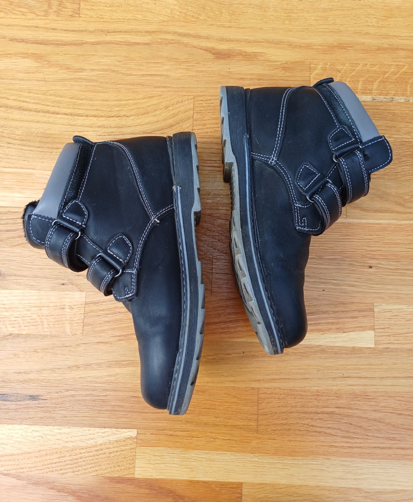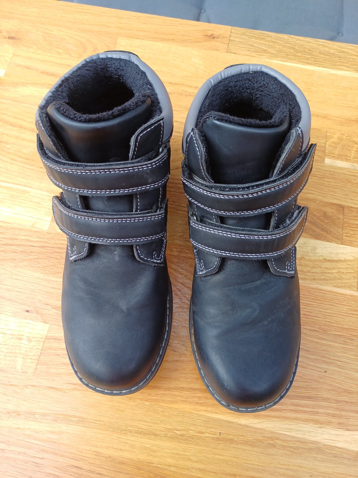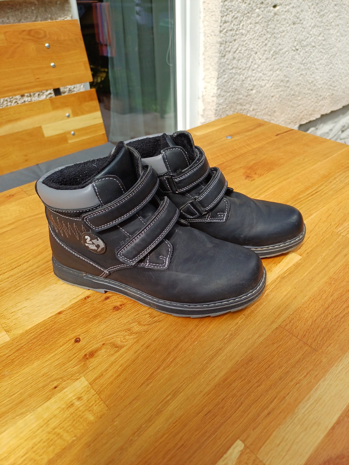 Minimálne nosené členkové čižmy na suchý zips (stále pevne držiace), nepoškodené, výborný stav, ideálne na prechod a miernu zimu, hrejivé kožušinové vnútro, vnútorná dĺžka vložky 23,5 cm.