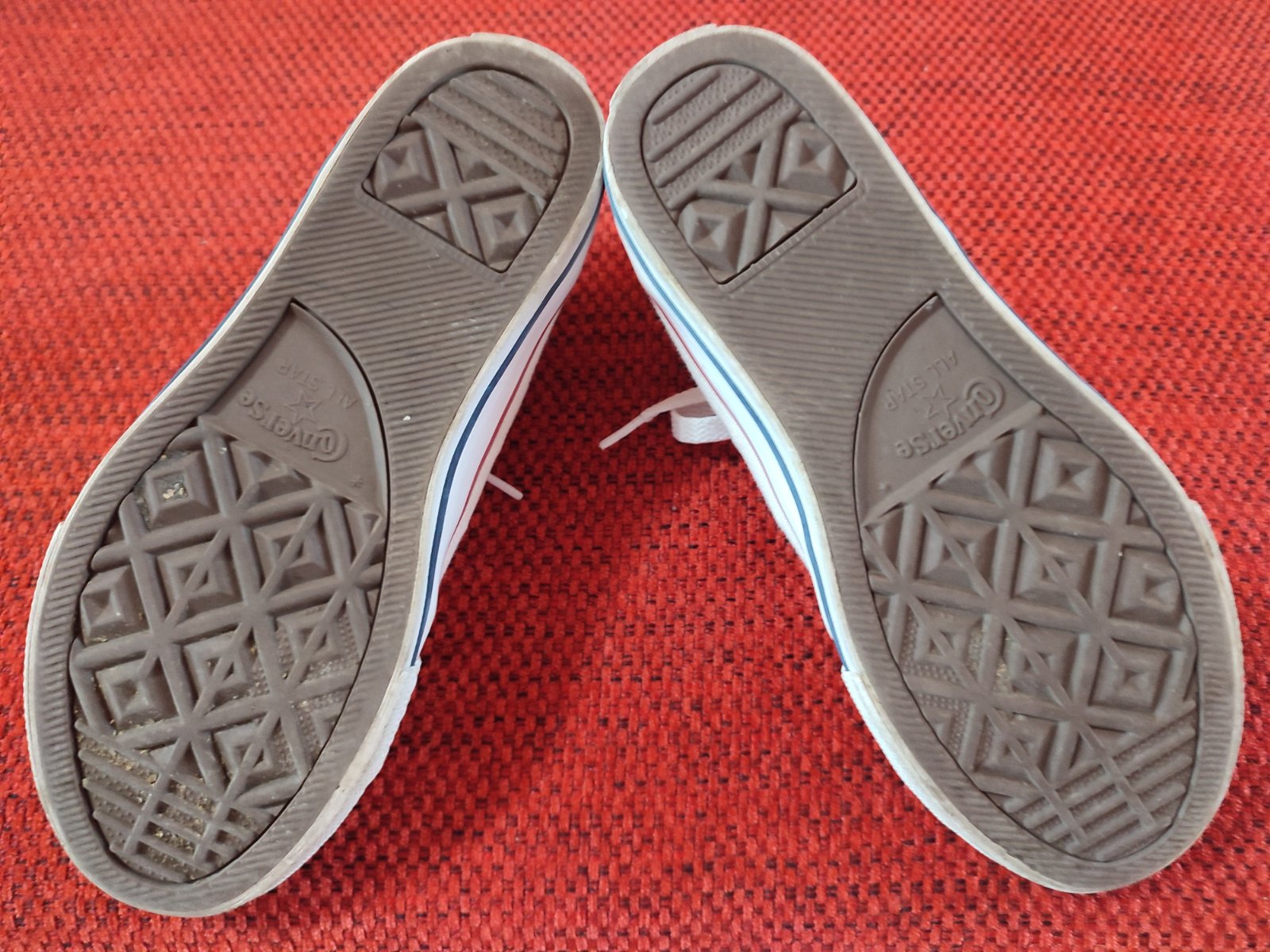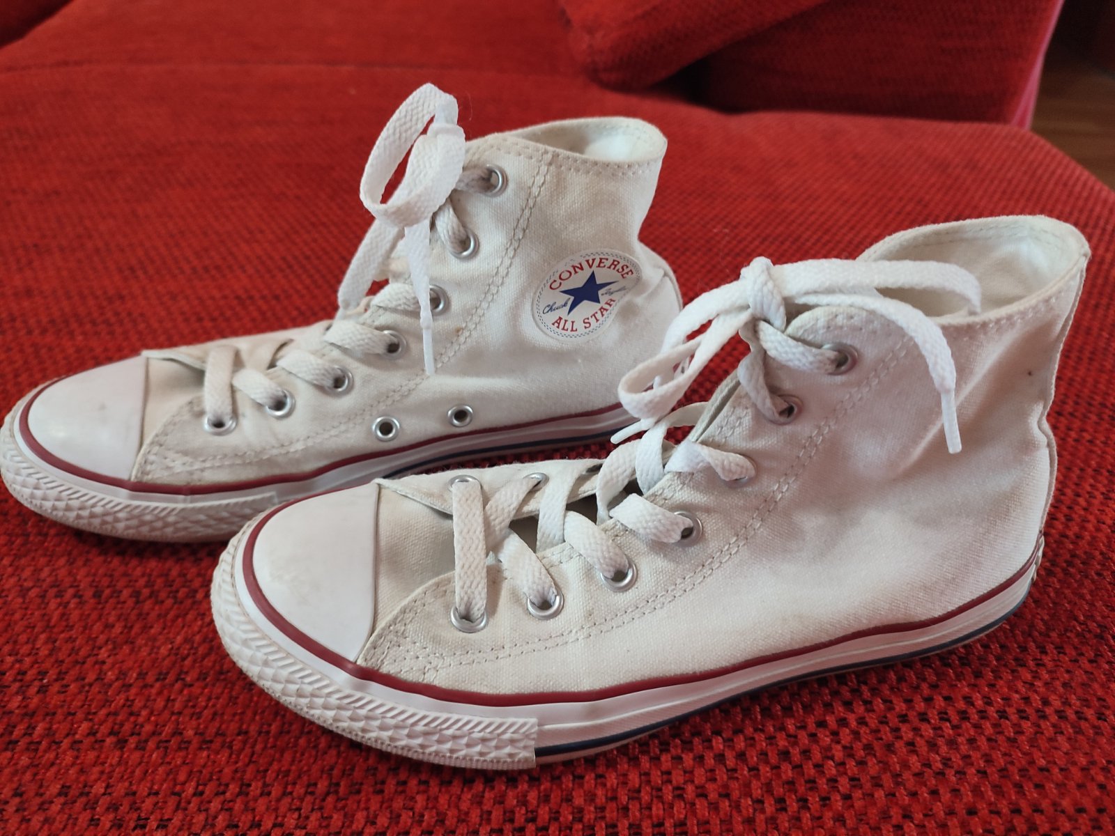 Predám platené tenisky Converse, zachovalé, malo nosené, hoci by sa zišlo už oprať. Vnútorná dĺžka premerana 22 cm, na štítku uvedena 21,5 cm, asi kvôli úzkej špičke, aby mala noha viac priestoru. Vhodné na užšie nohy.