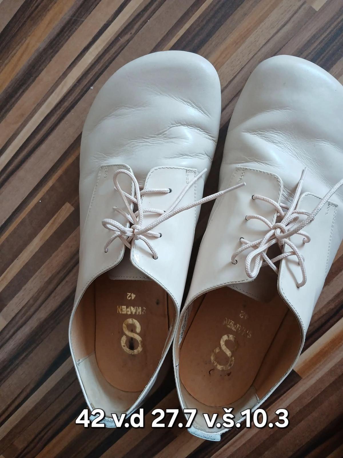Posuniem dvakrát obuté celokožené topánky značky Shapen, sú mi veľké. Dajú sa skvele kombinovať k športovému aj elegantnému oblečeniu. Vnútorná dĺžka je 27,3 cm. Nové stoja okolo 140€.