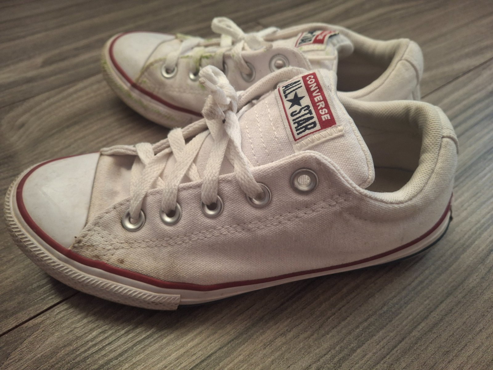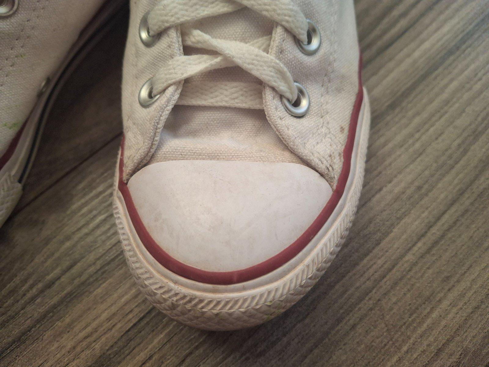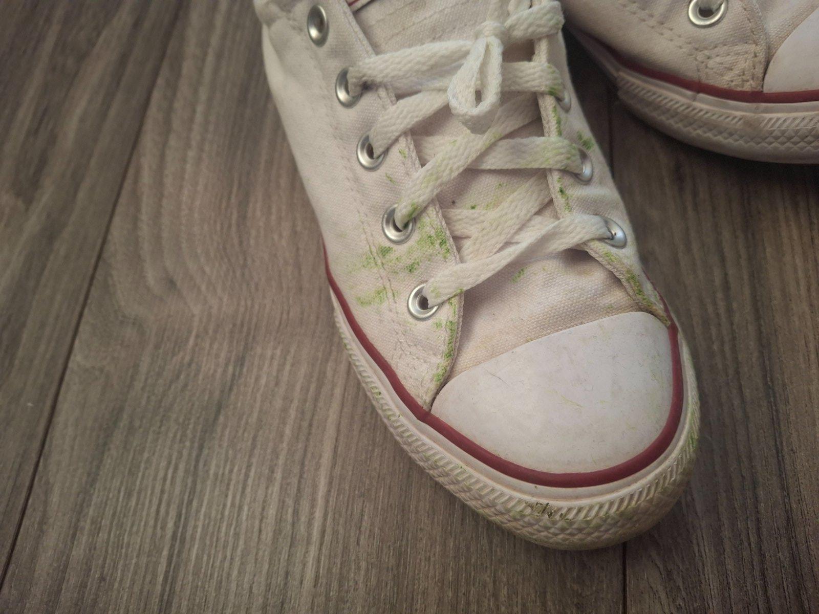Nosené ale nepoškodené nízke tenisky Converse. Prava topánka je od trávy. Neboli prané. Cena prispôsobená.