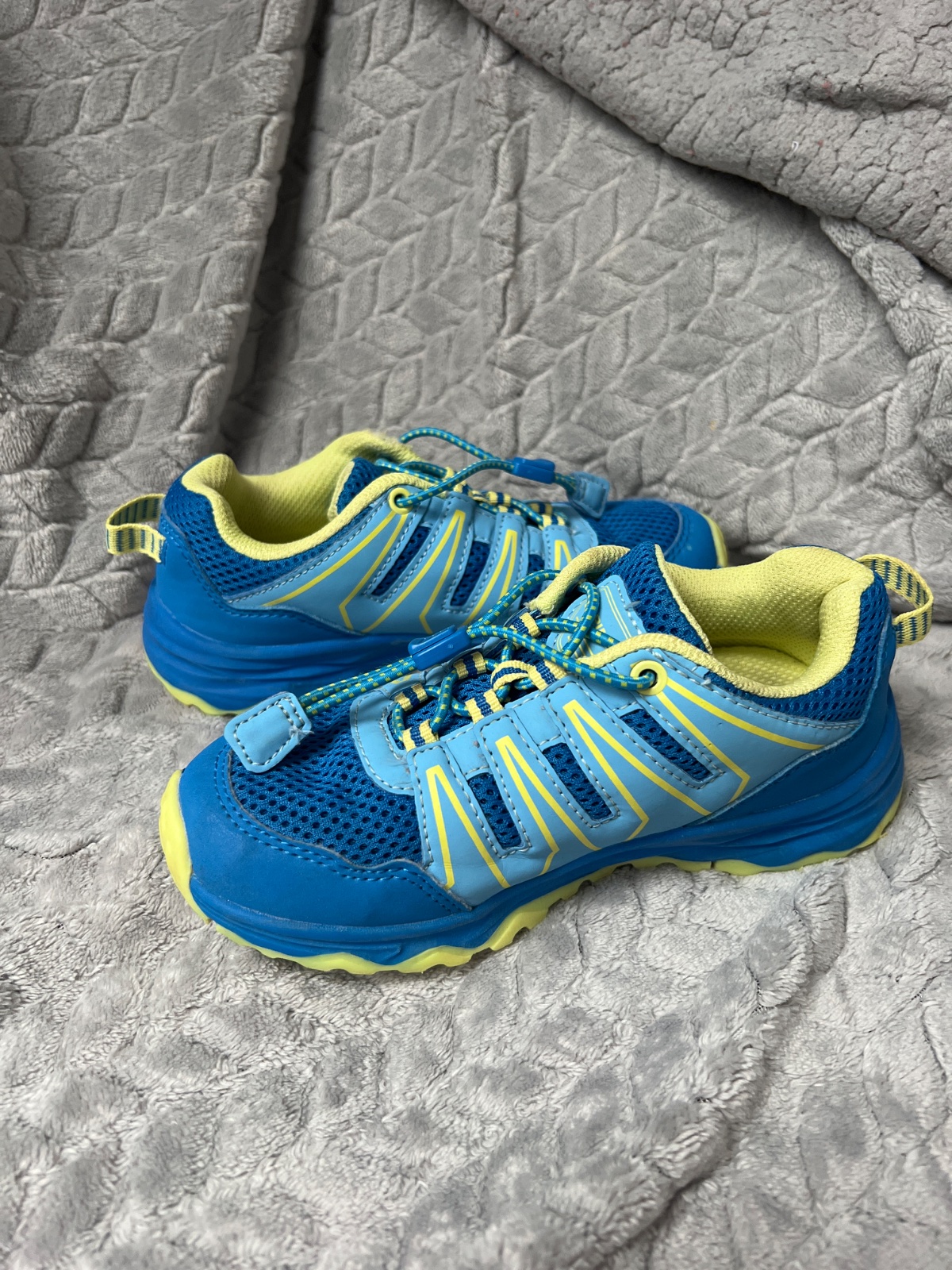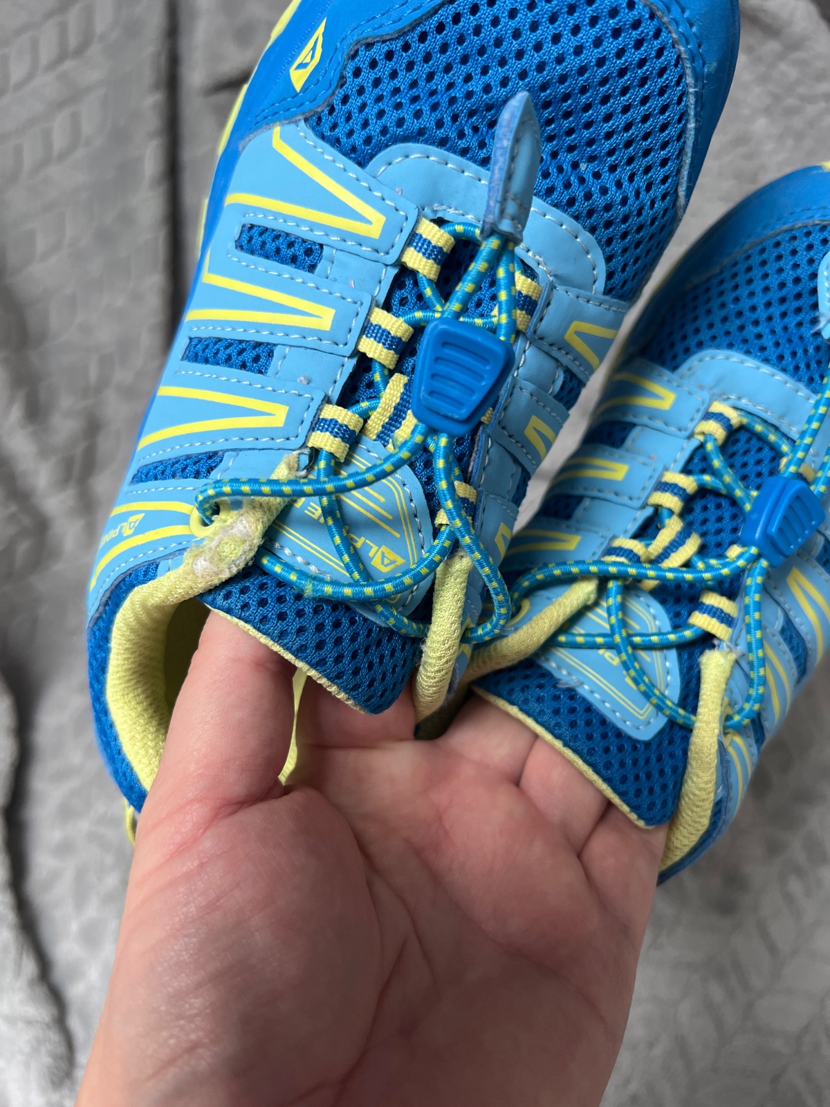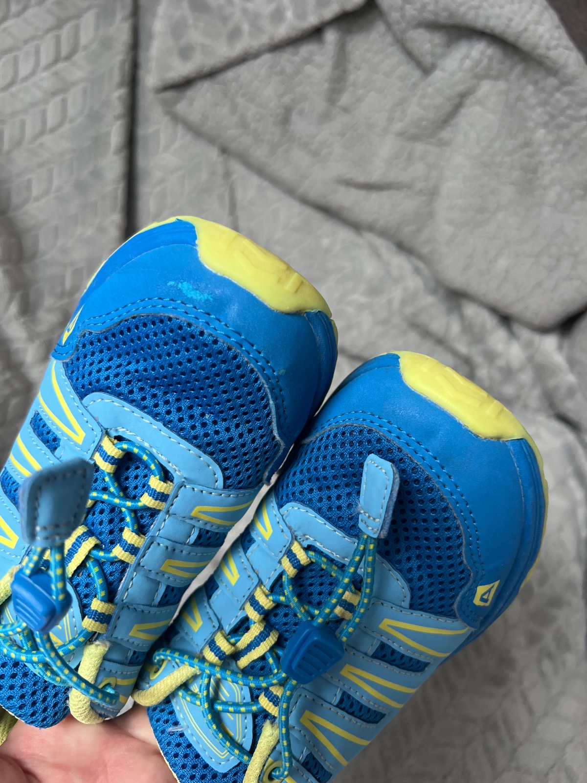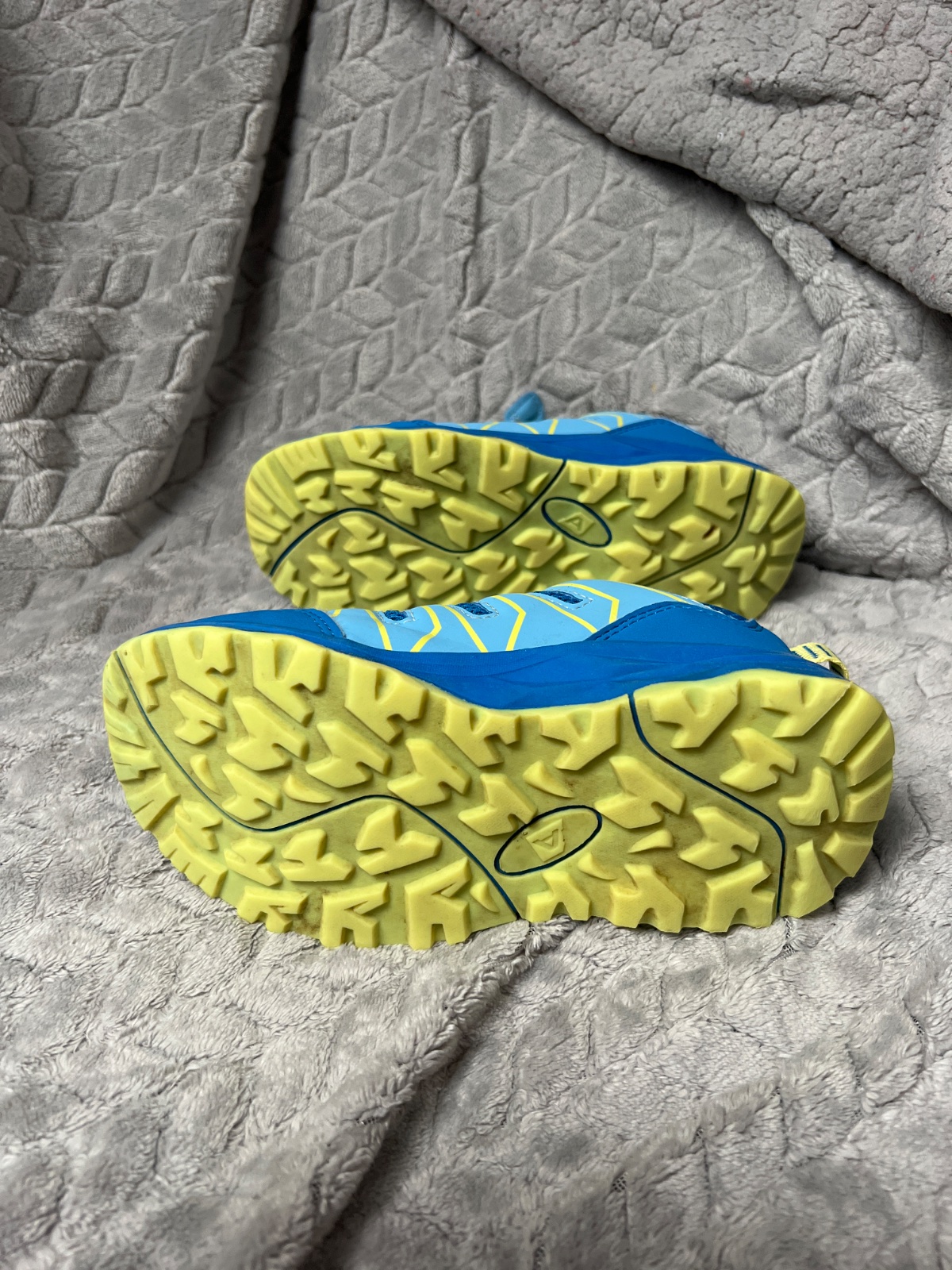 Nosené synom hlavne na turistiku v lete, zachovalé a stále pekné. Podarilo sa mu jemne šuchnúť špičku na skale (foto) a nohavice mu zodrali jednu časť pri viazaní (foto).Stav zohľadňujem v cene. Inak bez poškodení, podrážka krásna.