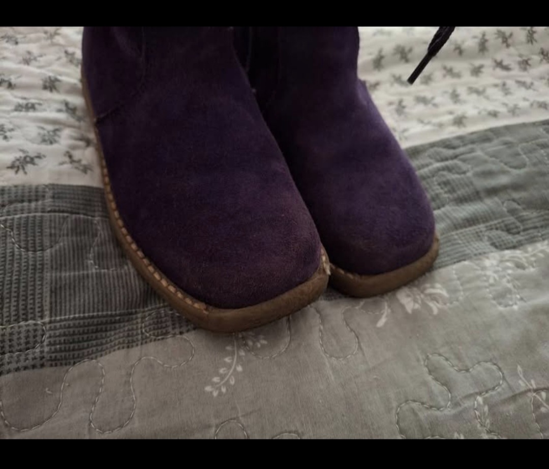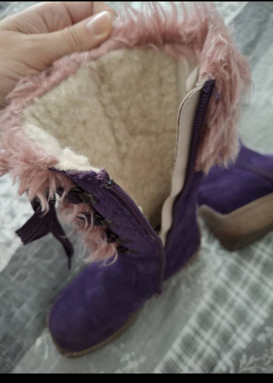 Fialové kožené čižmičky, sú zateplené. Kupované nové, nosené len mojou dcérou jednu zimu. Špičky jemne šuchnuté. Vnútorná dĺžka 17cm.