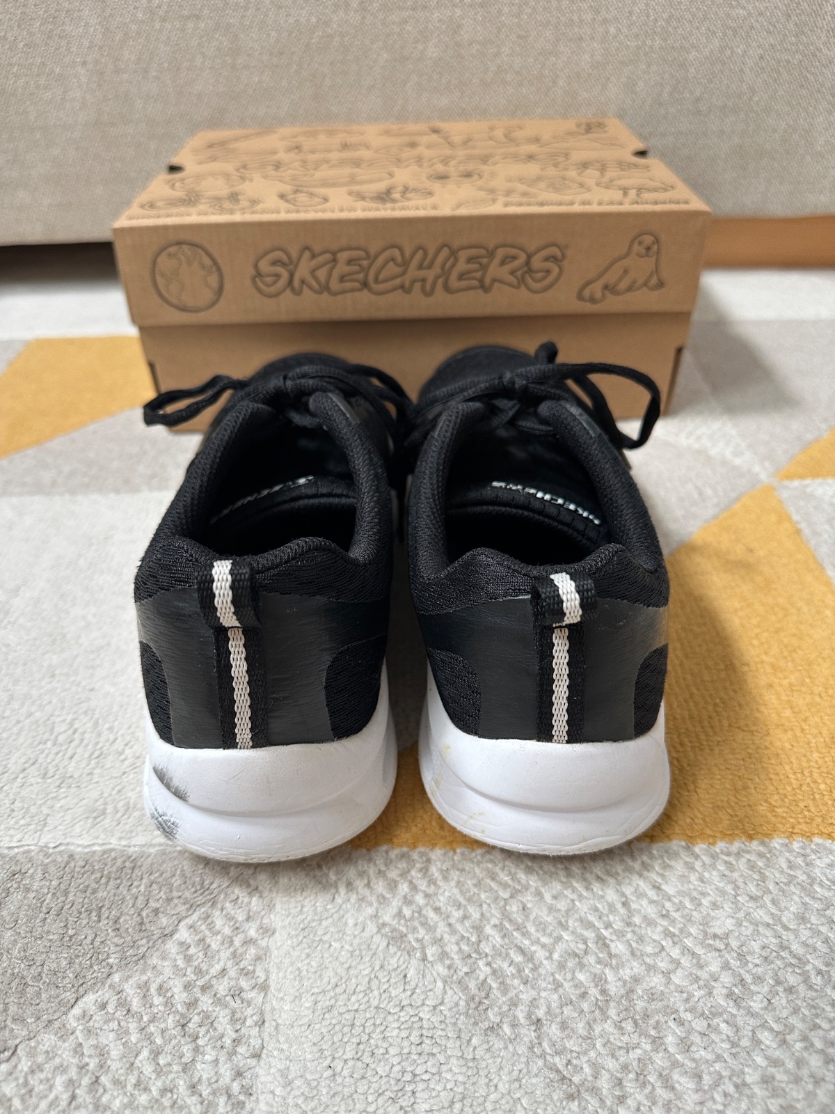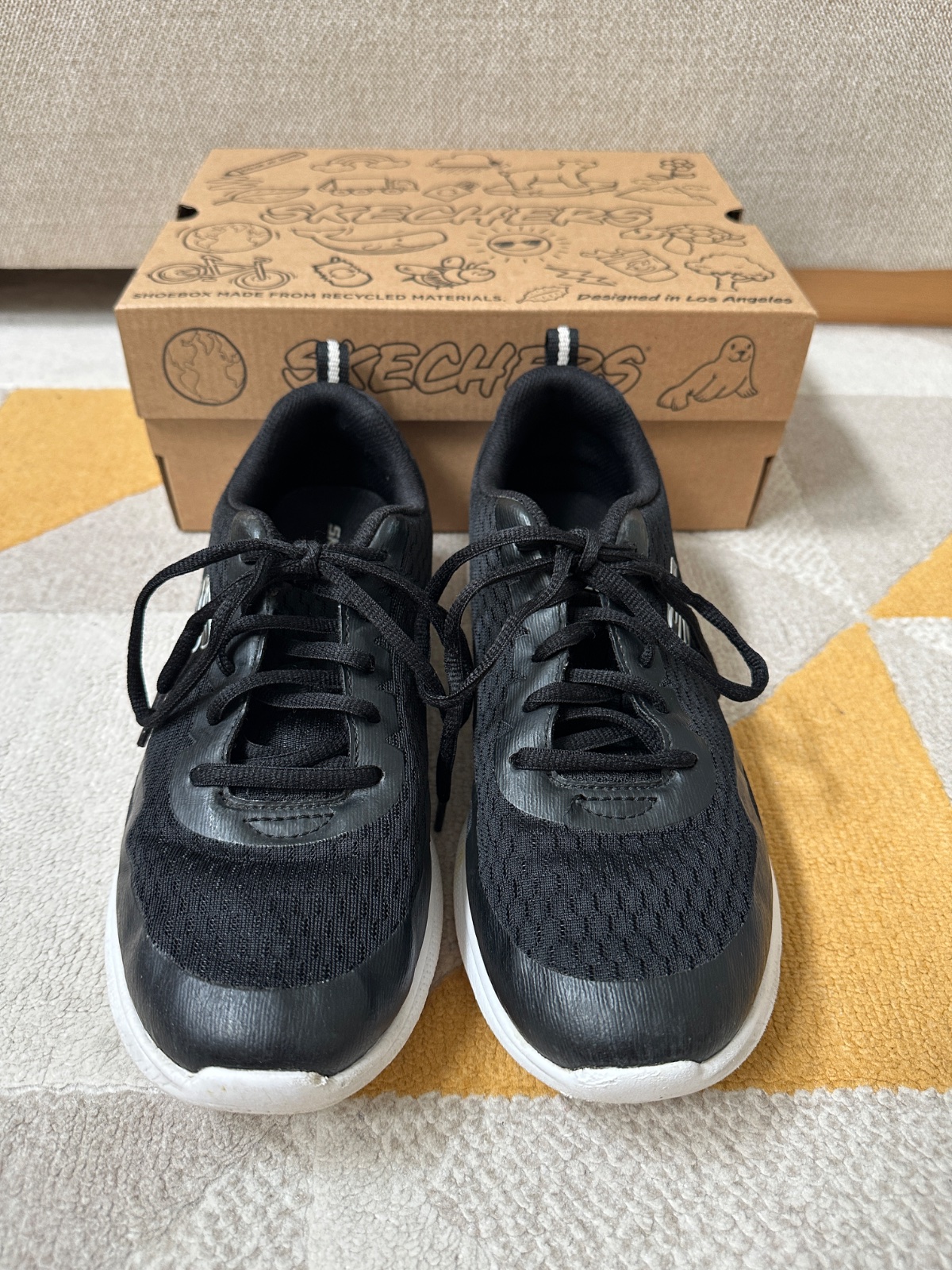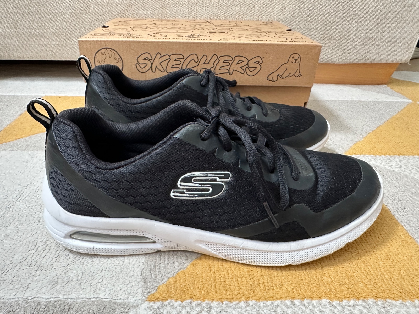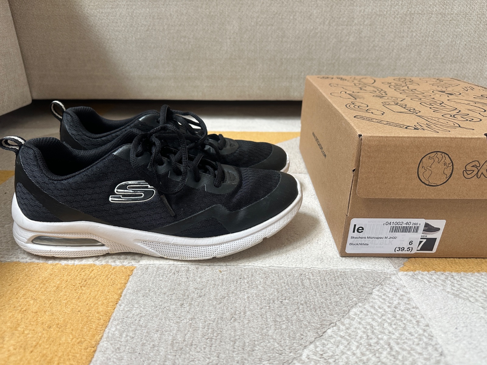 Skvelé a pohodlné tenisky Skechers, veľkosť 39,5. Super stav, nosené len na telesnú (telocvičňa + školský dvor). Podrážky sú umyté, len tá zelená od trávy neide moc dole. Pôvodná cena 55€.
