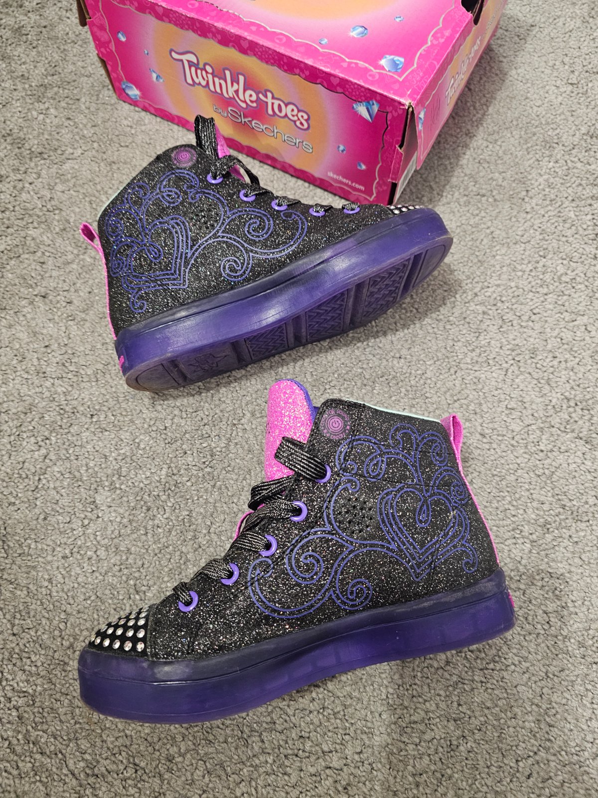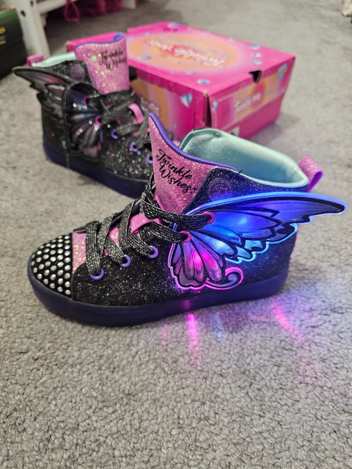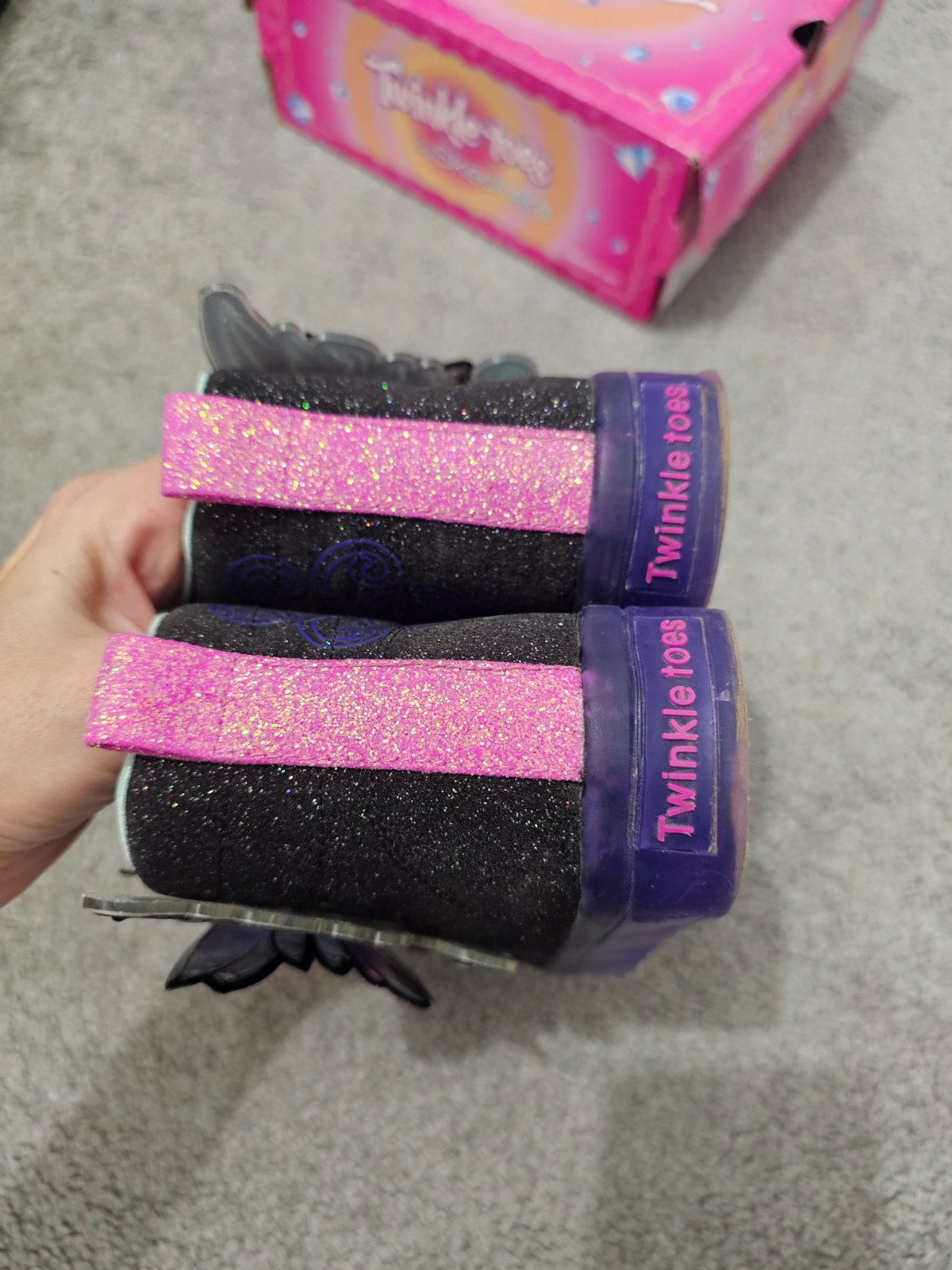 Predám prenadherne skechers. Mám k nim aj čarovnú paličku, s ktorou keď sa dotknú topánok tie vydajú zvučku a zasvietia( svietia aj pri chôdzi, ale da sa to vypnúť). Boli obuté len 4x a aj keď sú v top stave na opätku jednej z nich je mini poškodenie čo som odfotila. Nové stáli 59e