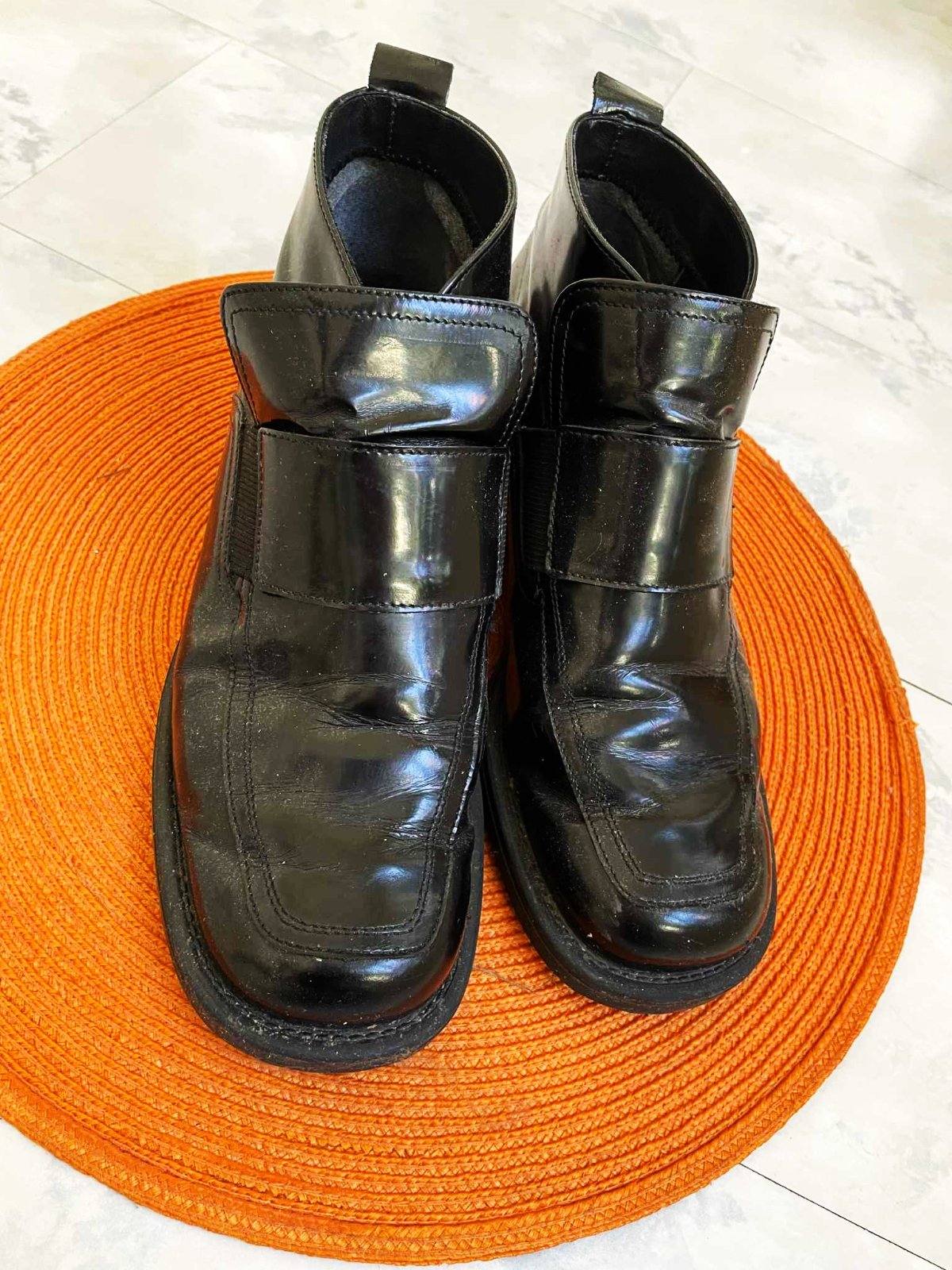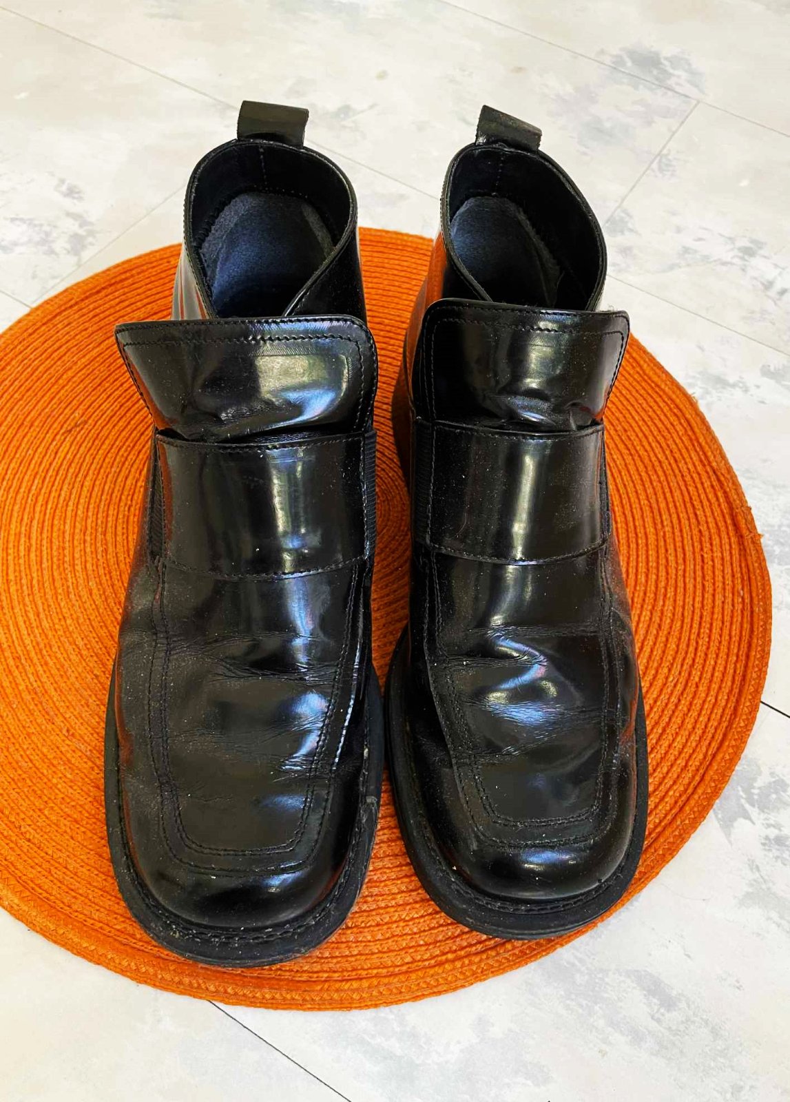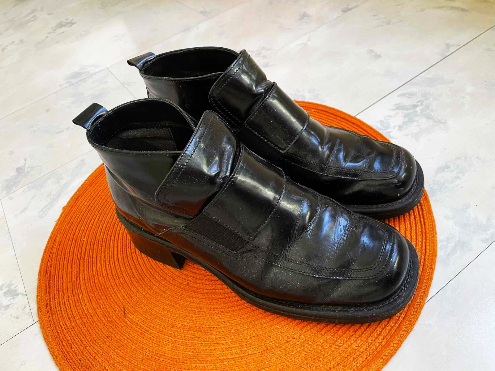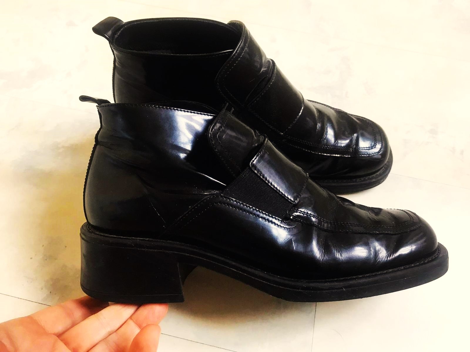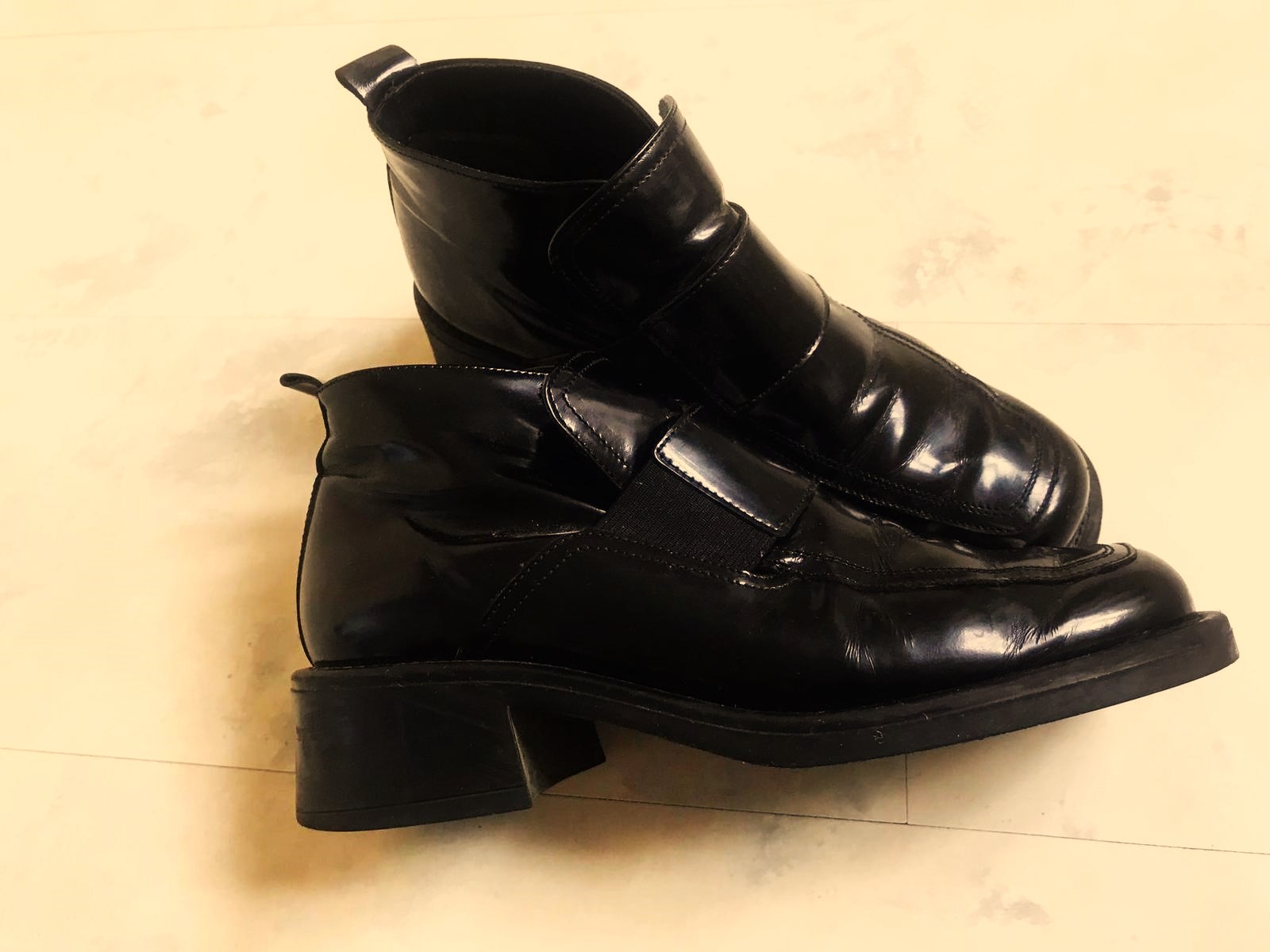 moderné zachovalé kotníkové jesenné topánky,na bokoch gumička pre pohodlné obúvanie, jemne zateplené,výborný podpätok,super ku hrubým pančuškám a sukni,ale aj inak - k rifliam