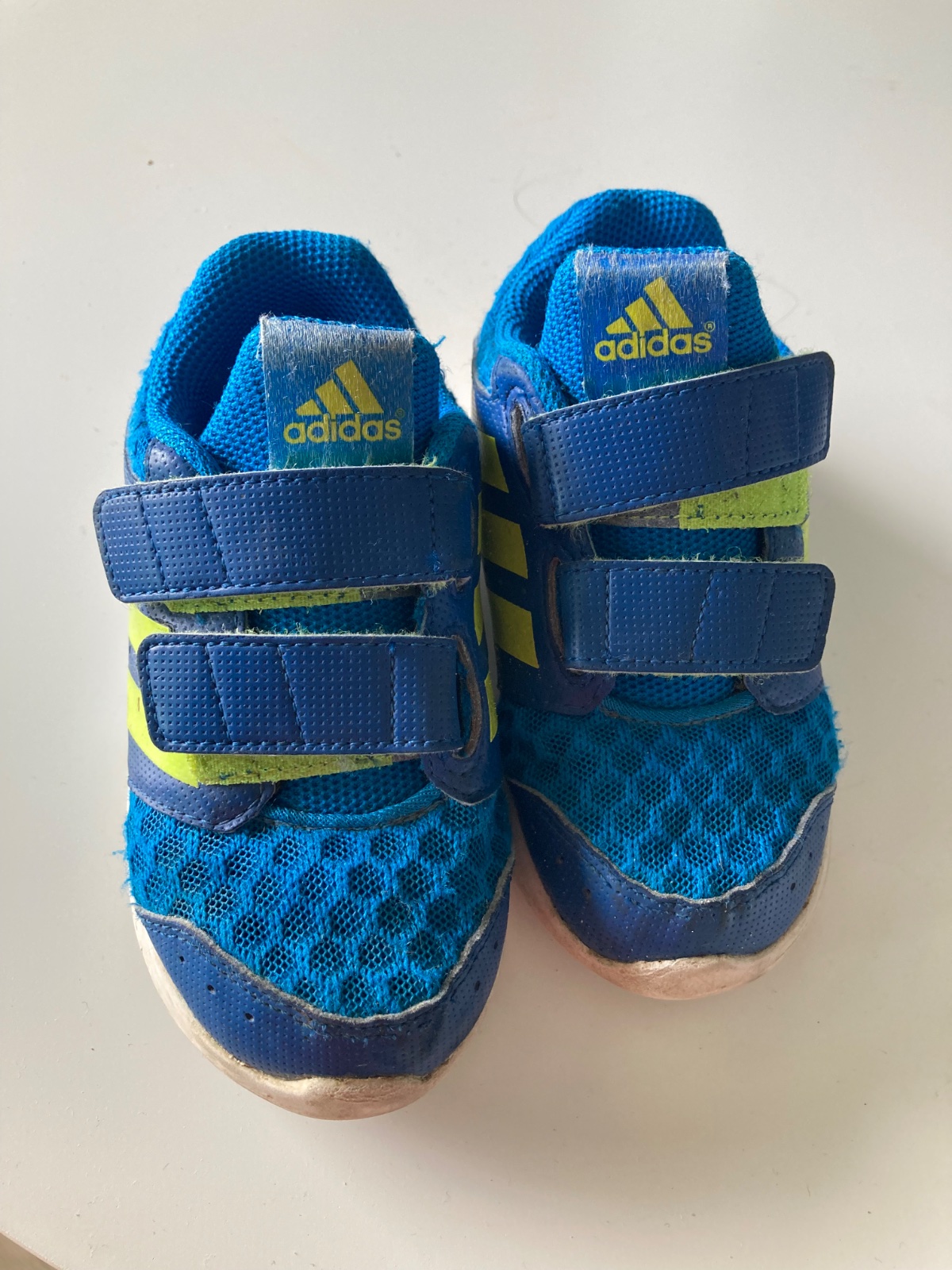 Tenisky ADIDAS, v perfektnom stave, bez poškodení, krásna farebná kombinácia: modrá + neónovozelená, farby na foto sú reálne, ľahučké tenisky, ľahko sa obúvajú Veľkosť: 24, vnútorná dĺžka 15cm