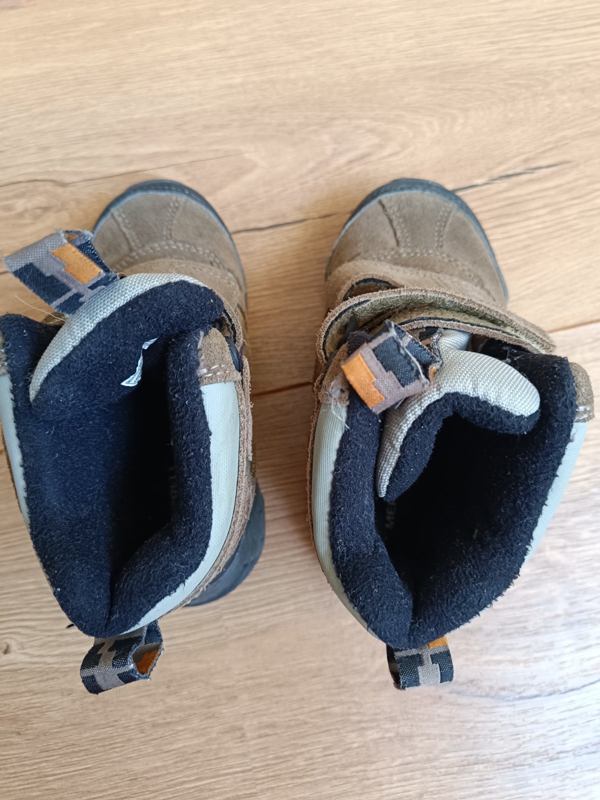 Topanky su vyrobene z nepremokaveho materialu v hnedej farbe s hrubou podrazkou, so zapinanim na suchy zips.