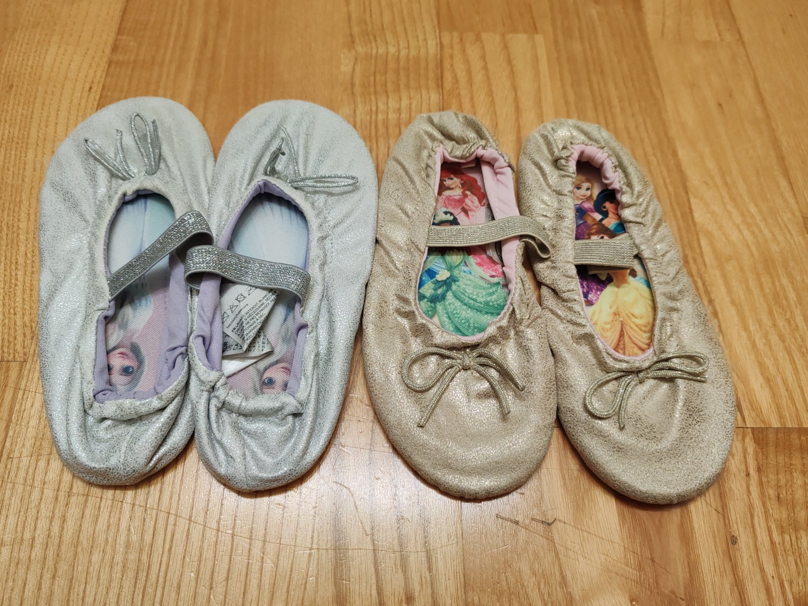Zlaté a strieborné baletné cvičky, veľkosť 30/31, motív Disney a Frozen. Cena spolu.
