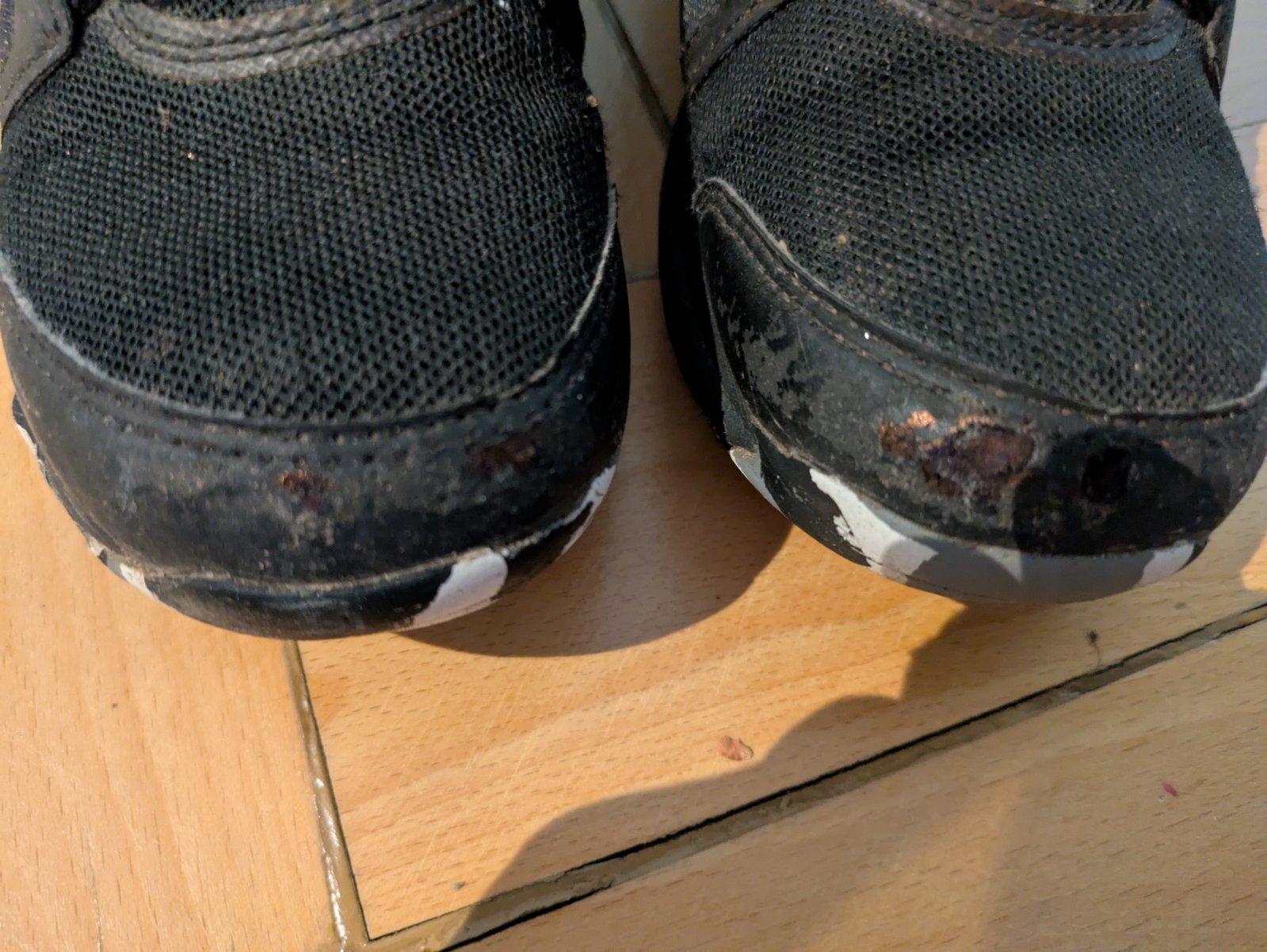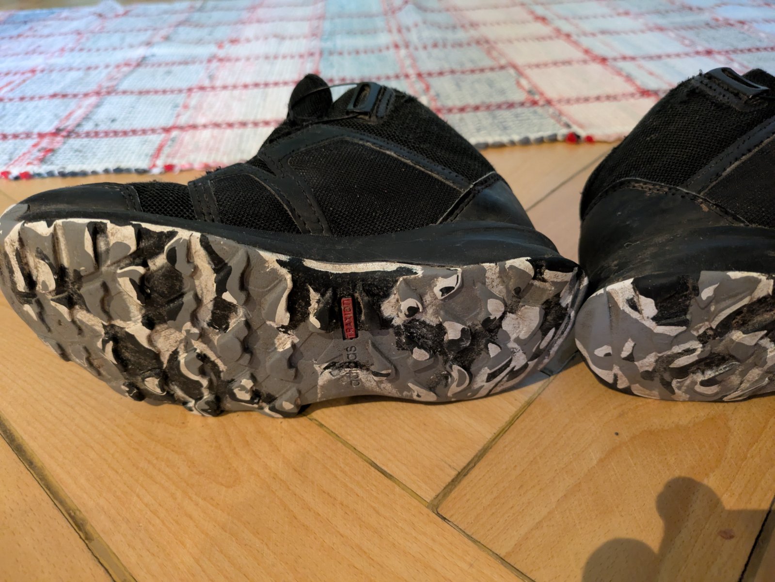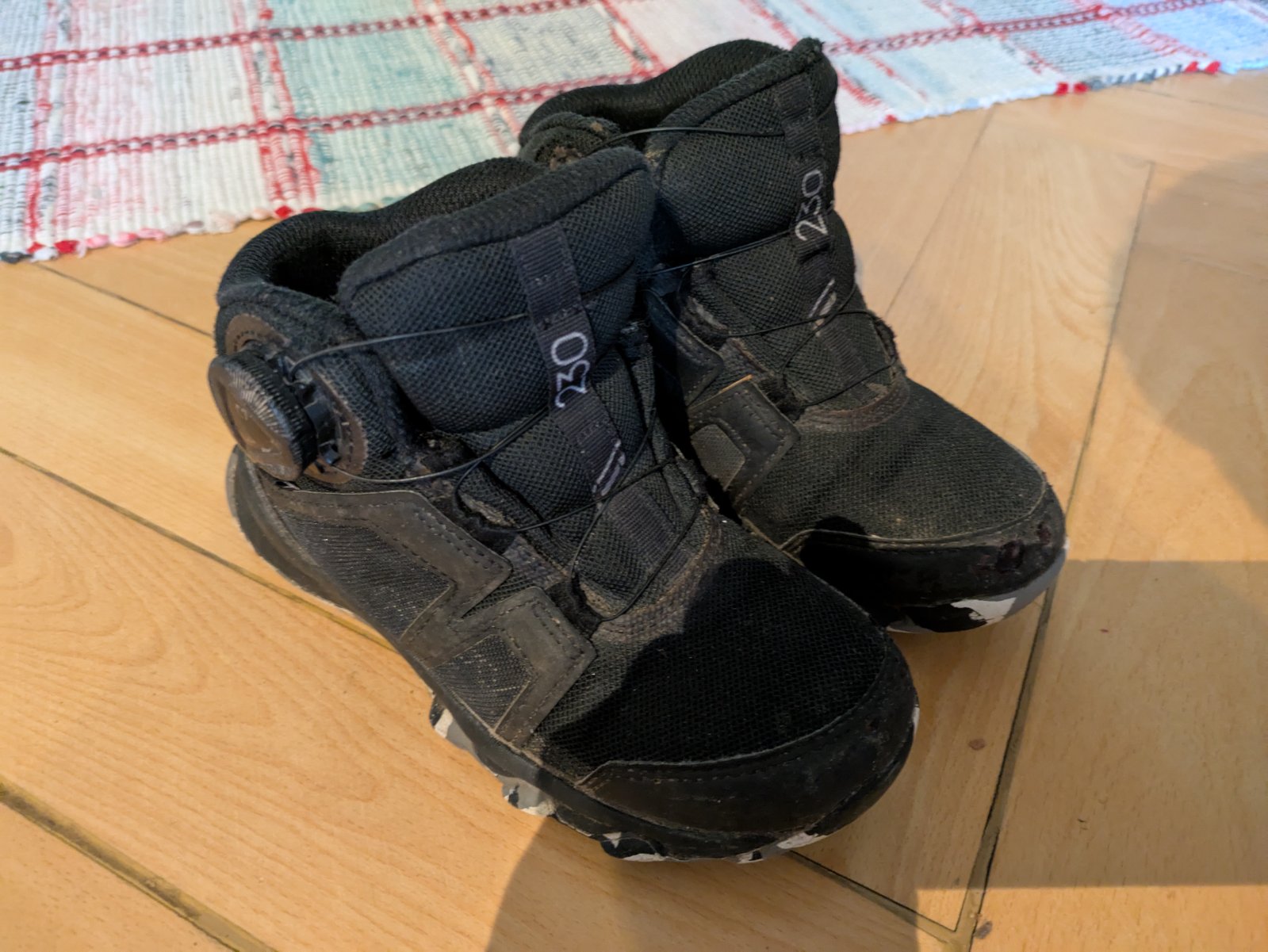 Vela pouzivane, ale este stale v dobrom stave - iba maju osuchane spicky, vid foto. A stale su nepremokave (uplne ze macanie sa v mlakach neznesu ale vlhku travu v pohode). Super zapinanie na boa koliesko. Vd 18.5, vid foto