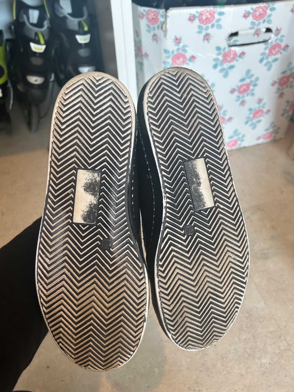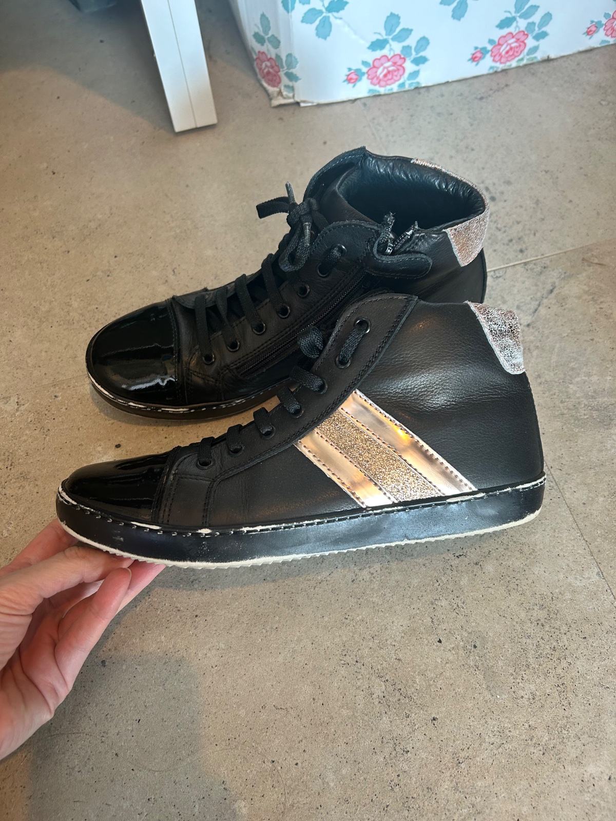 Krasne topanky na prechod po dcerke. velmi malo nosene, len zial trosku sa zosuchala podrazka. ale myslim ze to nevyzera zle..je to akoby to tak malo byt ma topanockach:) Kupovane v pandorf v AT.
