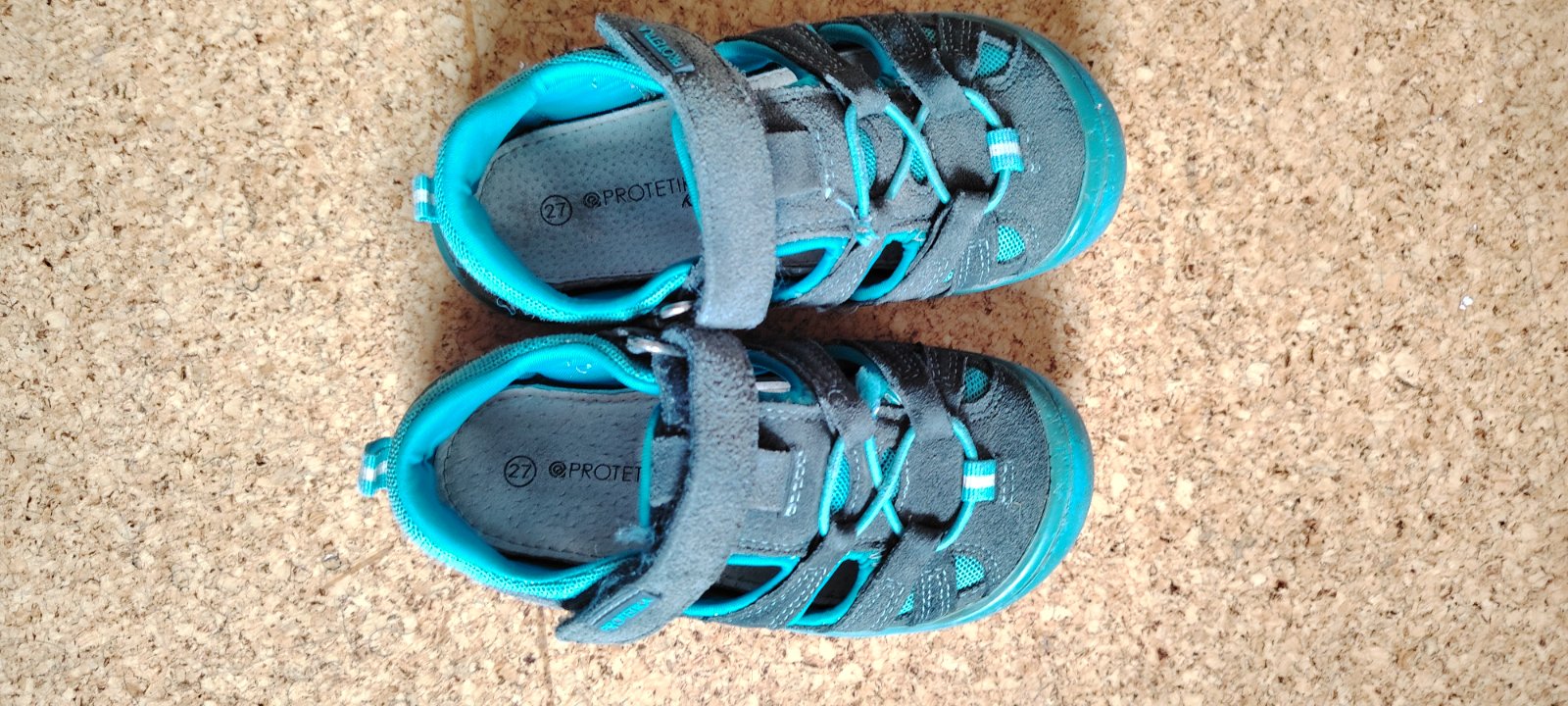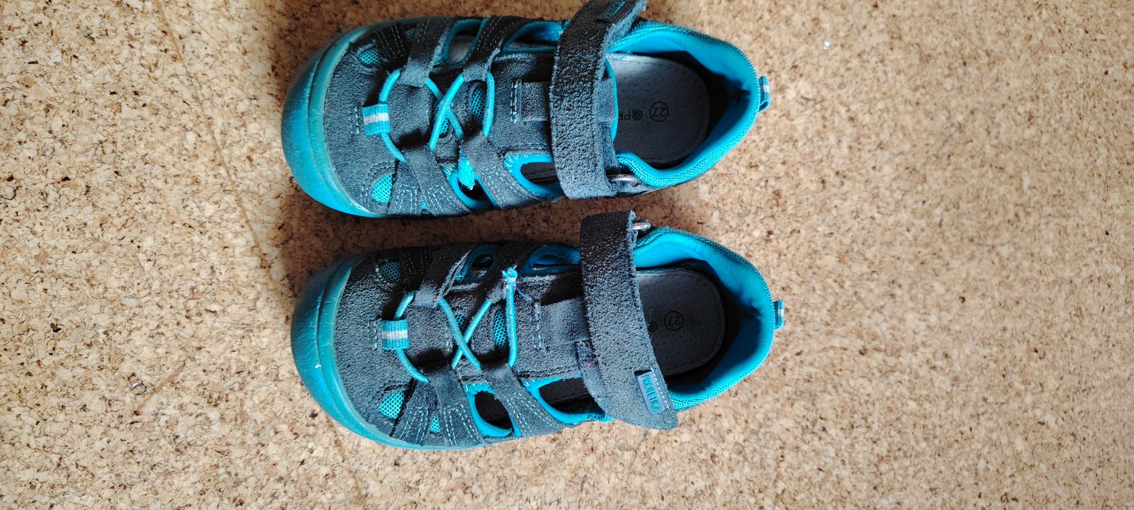 Sandálky nosené, farba čistením vyblednutá. Vnútorná dlzka 17cm. Na dvor určite ešte poslúžia.
