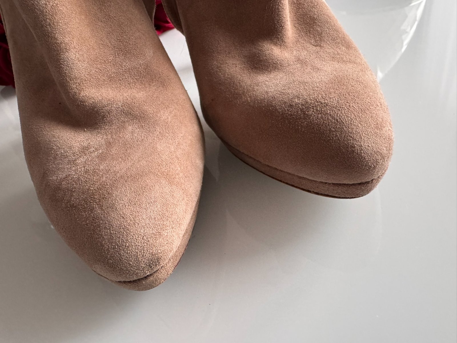 Dámske členkové topánky Zara z béžového semišu s vysokým opätkom a platformou.