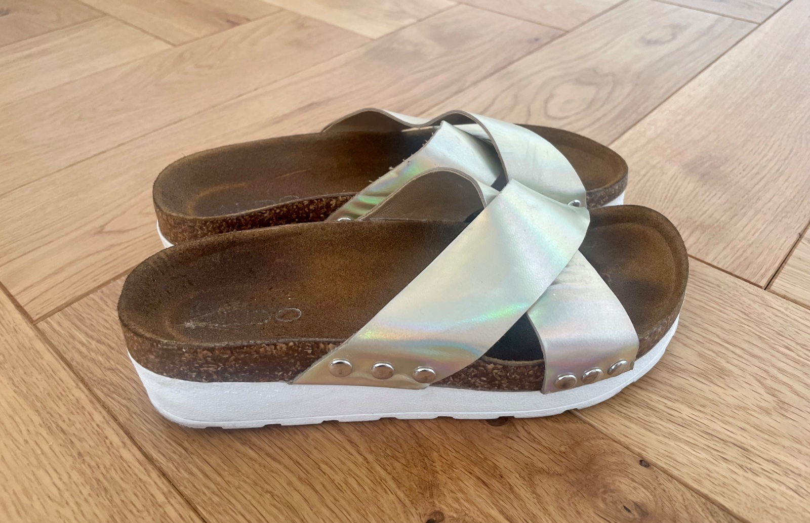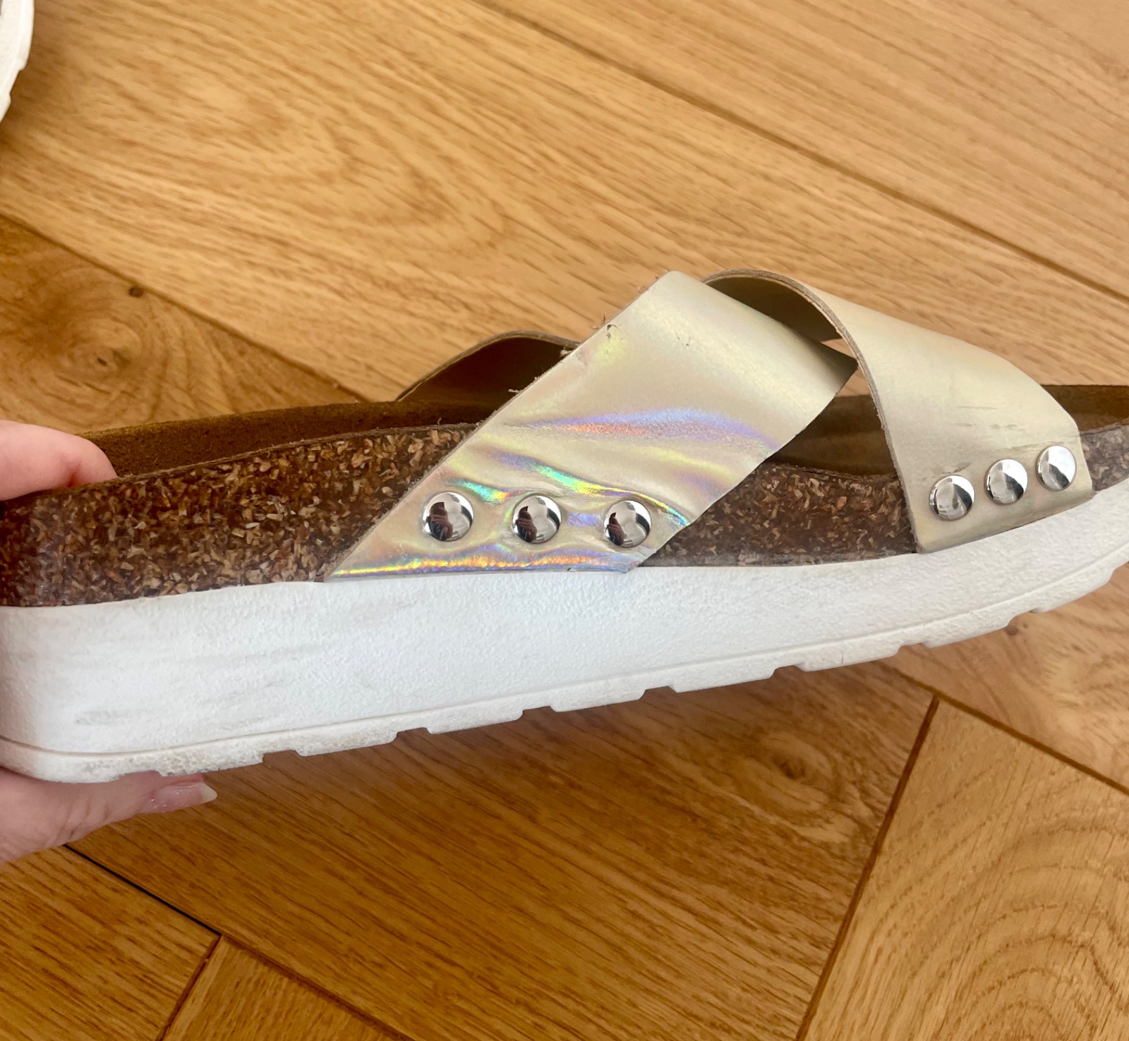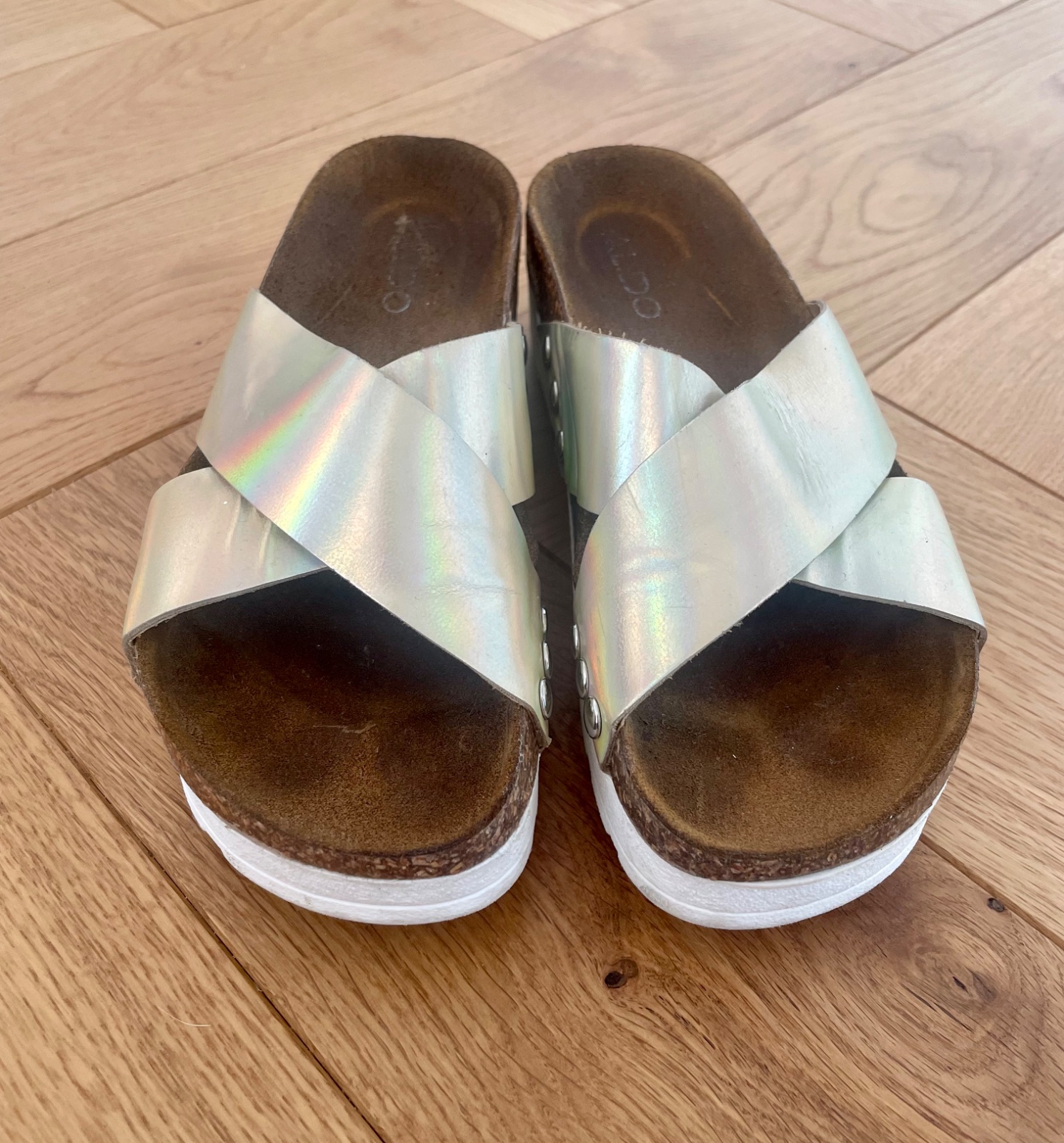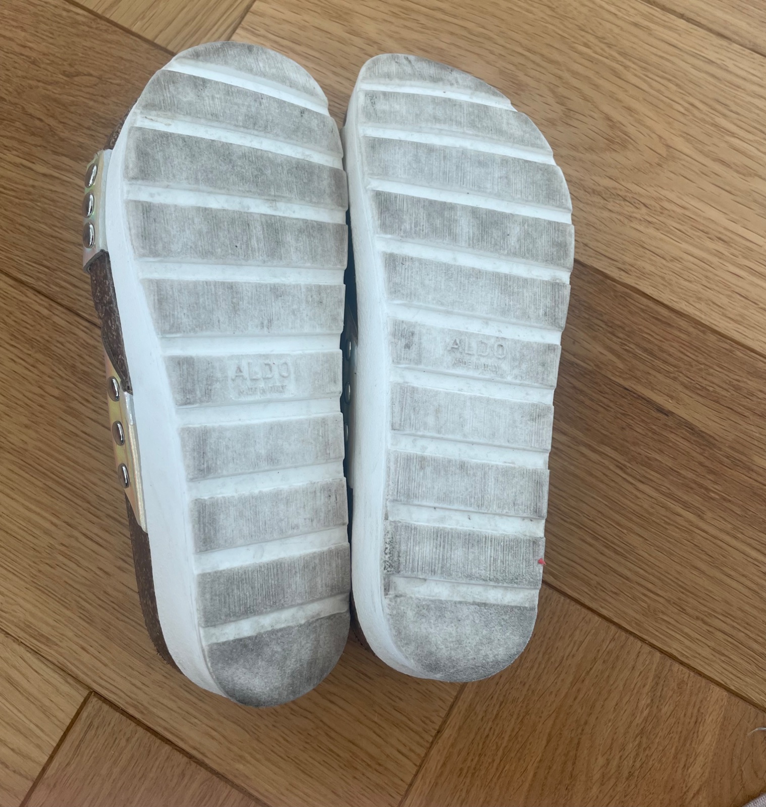 Par krat obute kozene slapky, su zlato-metalicke. Maju nizku platformu. Znacka Aldo