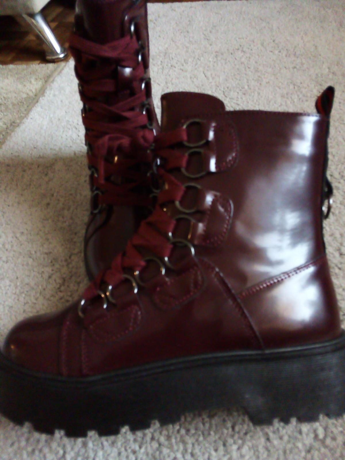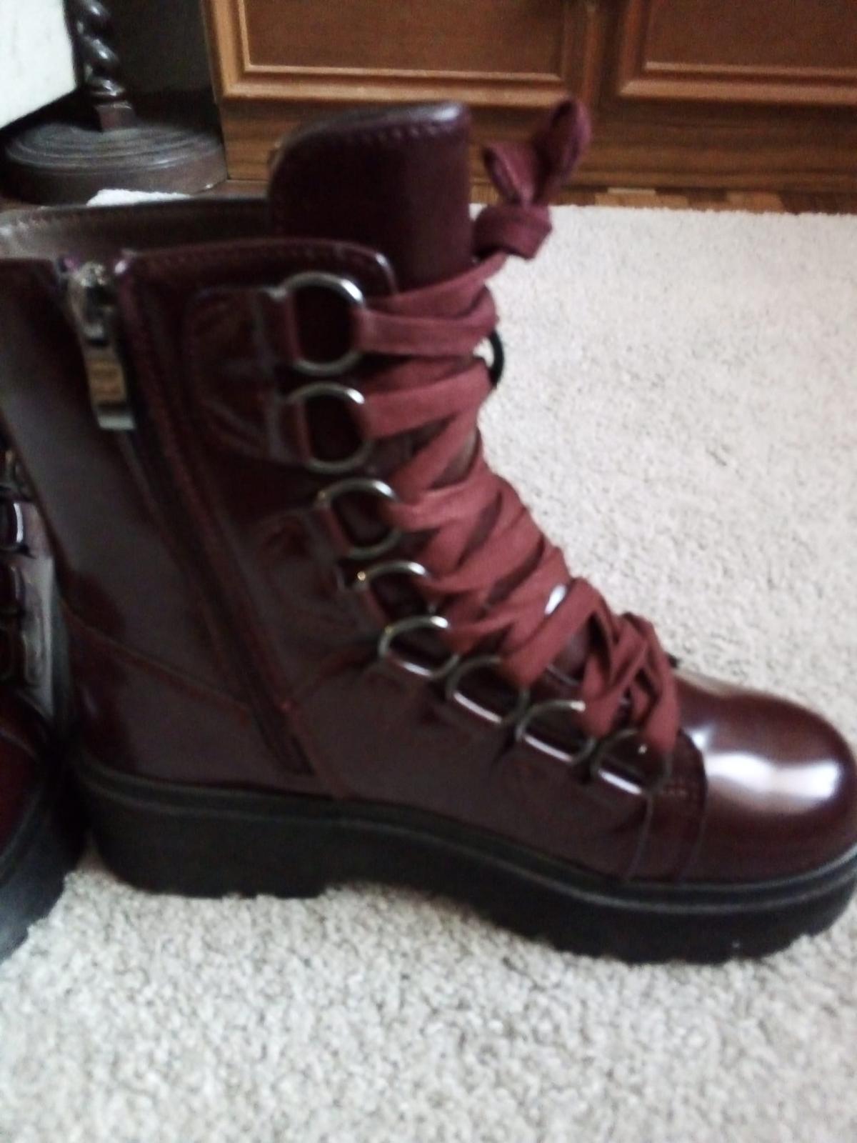 Bordové topánky so zapínaním na zips a šnurovaním. Eko koža, gumená podrážka. Len vyskúšané. Vnútorná dĺžka 23 cm.