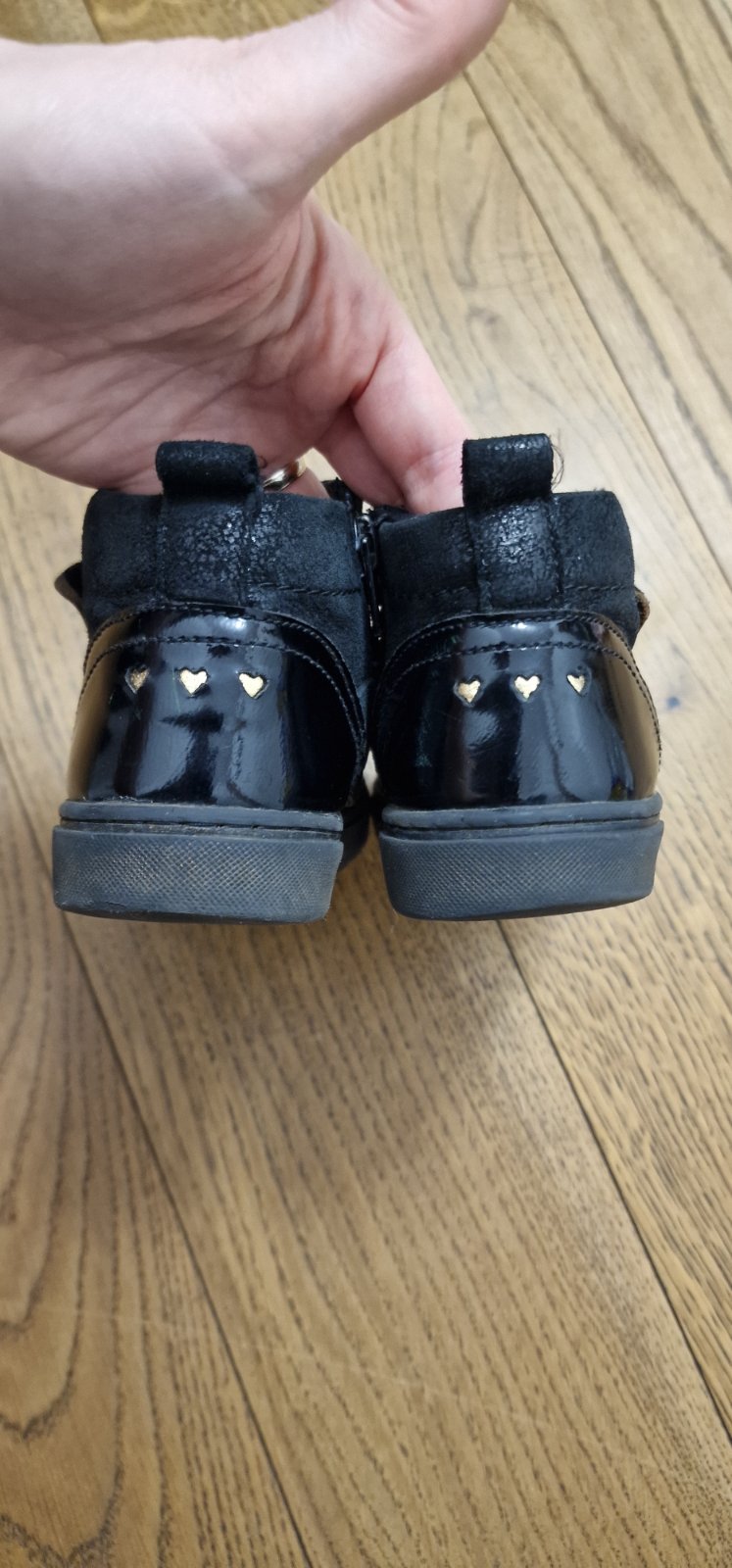 Jesenné alebo jarné vyvýšené topánky na suchý zips. Topánky sú kožené, je už vidieť používanie. Na špičke mierne okopane. Vhodné na dvor, pre nenáročnú maminku.