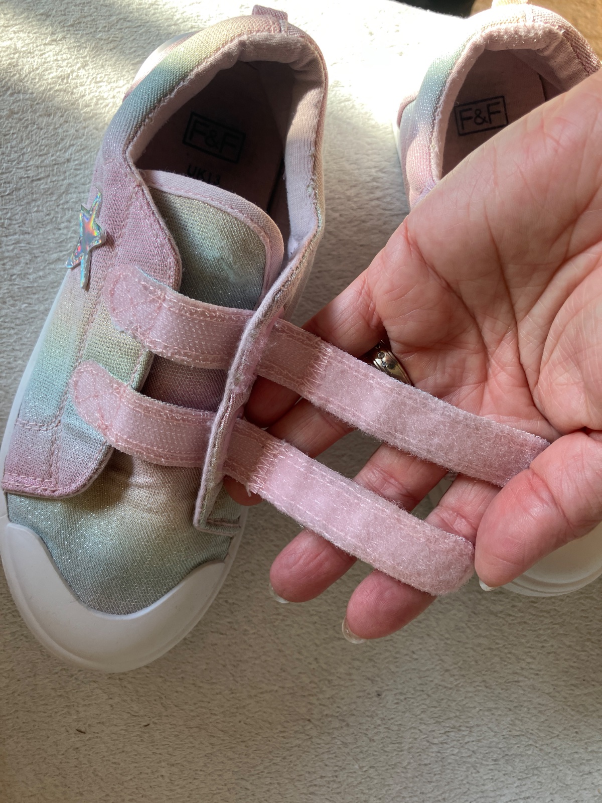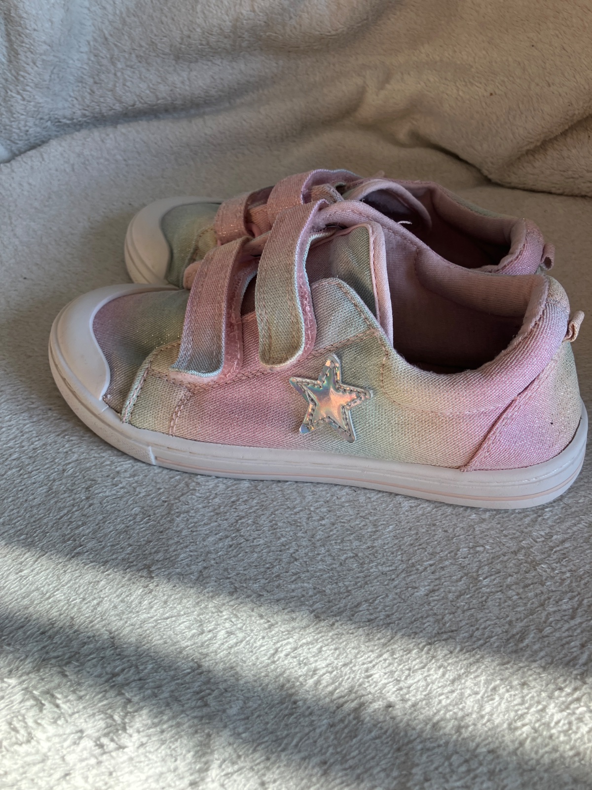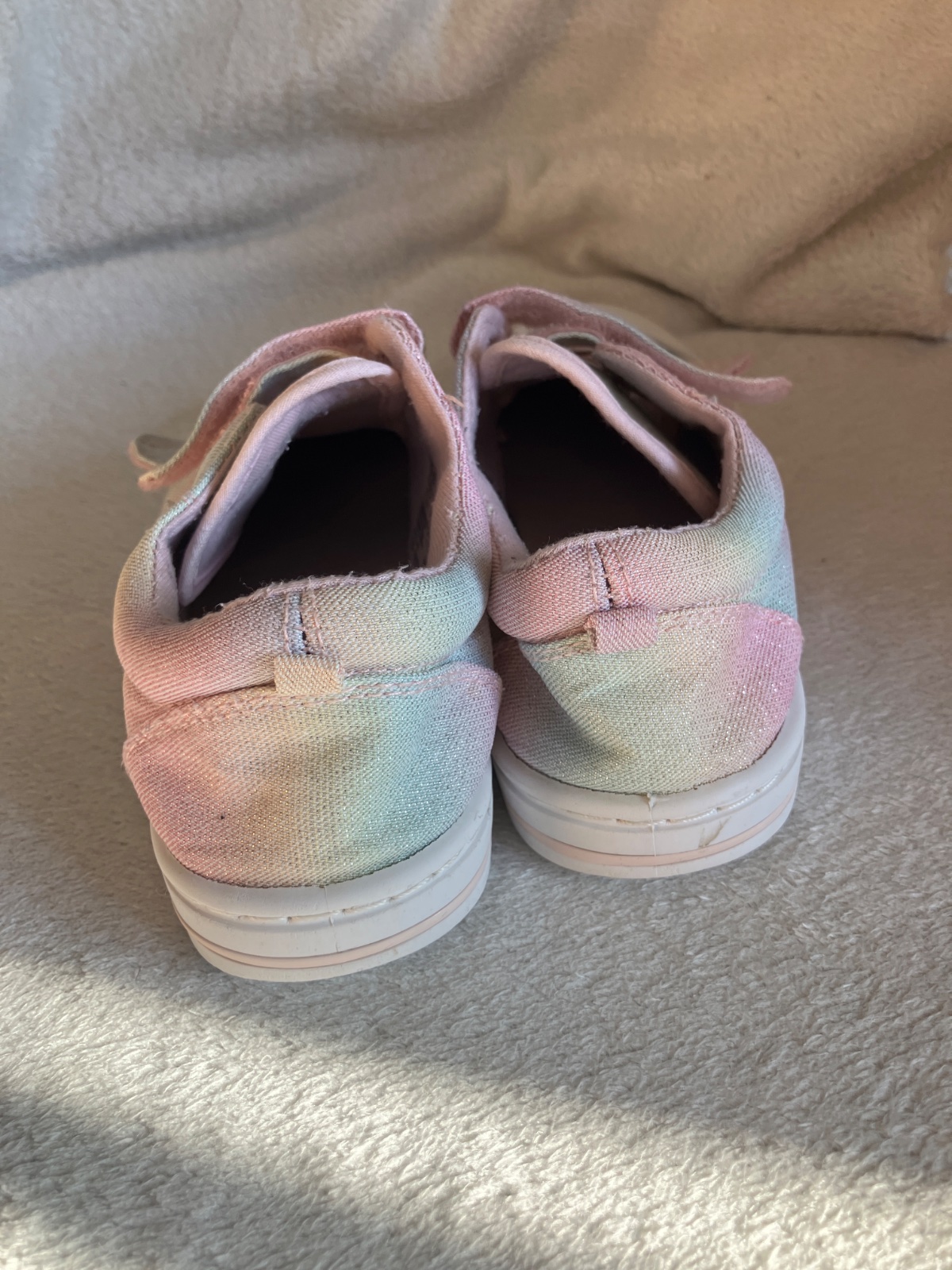 Duhove tenisky s trblietkami, velkost 32, vnutorna dlzka 20cm. Suche zipsy drzia, paty nezoslapane, spicky neokopane. Nosene do skoly. Na podrazke trocha zosuchane. Mam k nim duhovu jednorozcovu mikinu, krasne sa doplnaju.