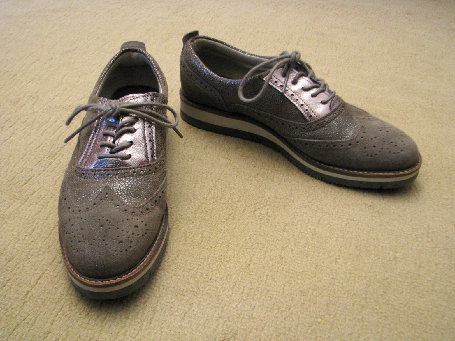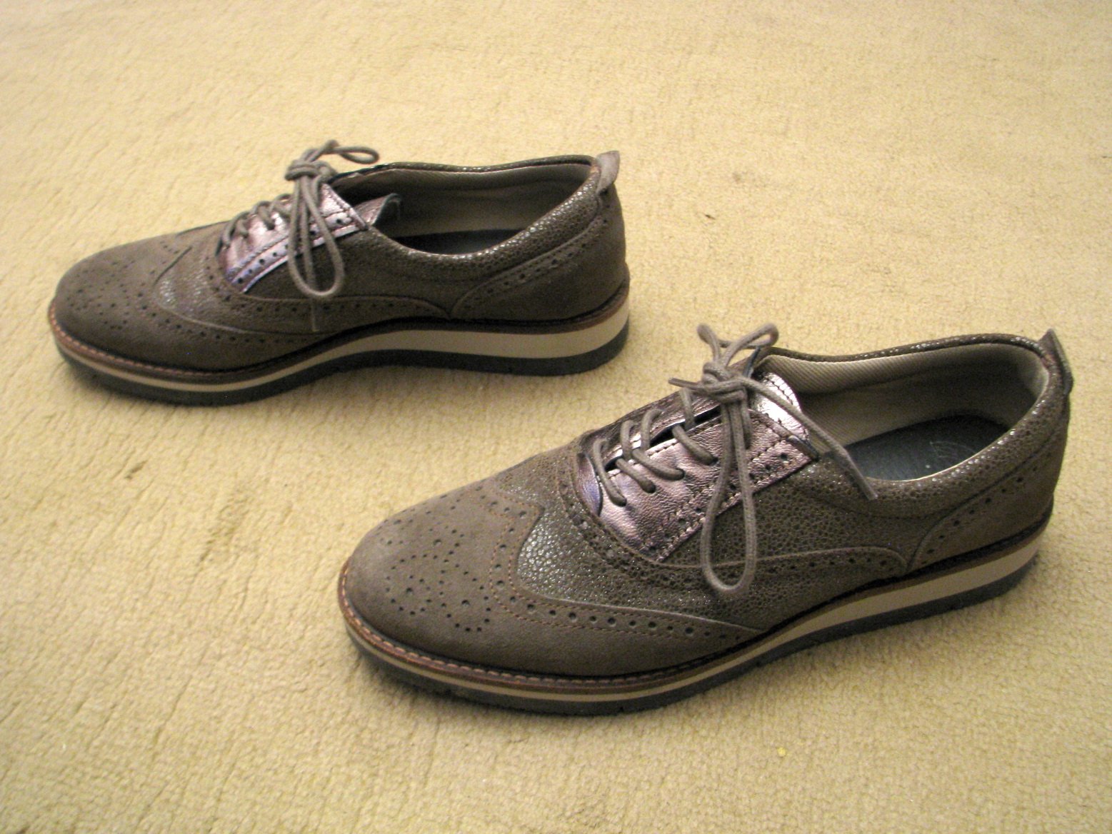 Hnedé šnurovaie poltopánky z pravej kože, na prechodné obdobie. Koža má okolo šnúrok metalickú povrchovú úpravu. Vnútorná stielka je textilná, vložka tiež kožená. Minimálne nosené, výborne zachovalé, bez poškodení. Veľkosť 40, v prípade záujmu premeriam.