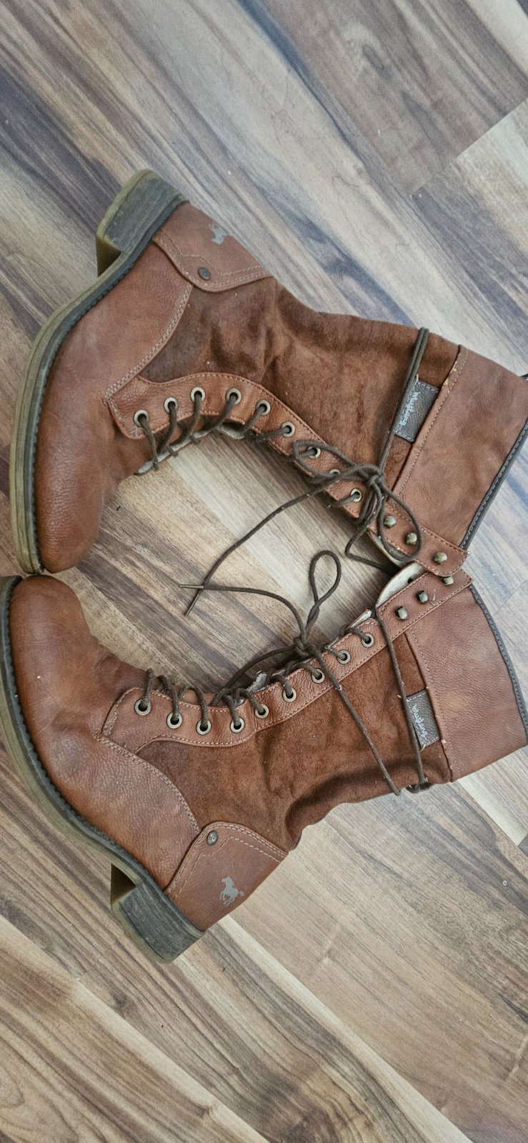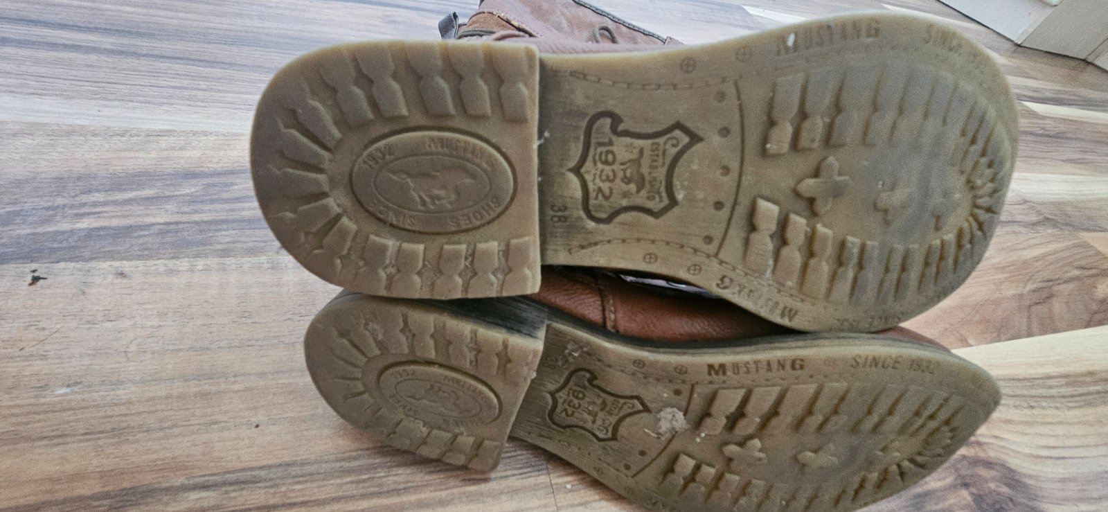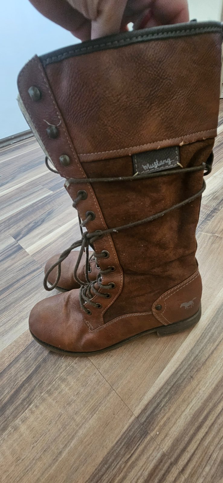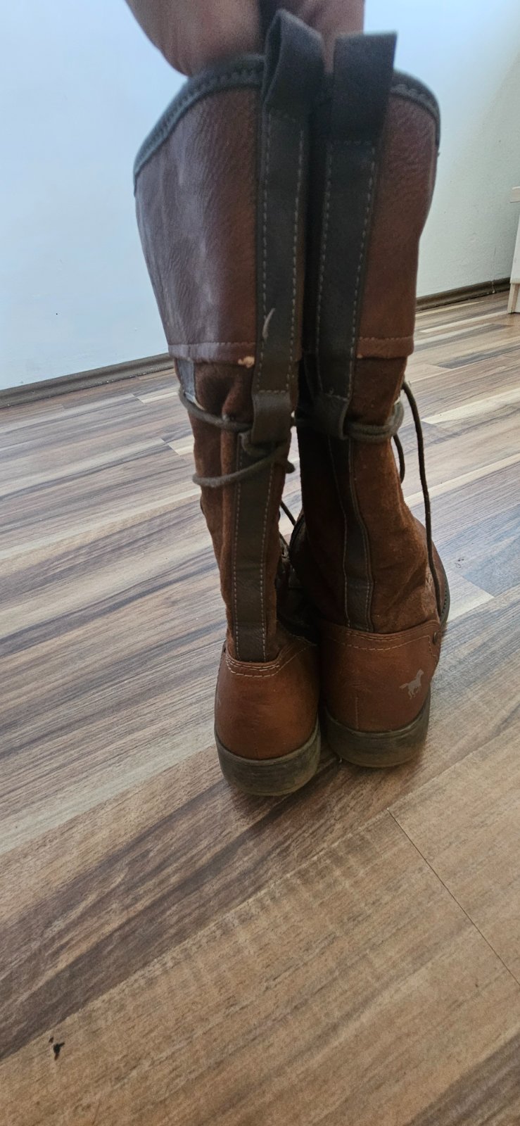 Štýlové vysoké čižmy v koňakovej hnedej farbe. Kombinácia hladkého materiálu a brúseného efektu v hornej časti. Majú typické Mustang detaily (kovové nity, logo koníka). Sú na nízkom podpätku, takže ideálne na celodenné nosenie.