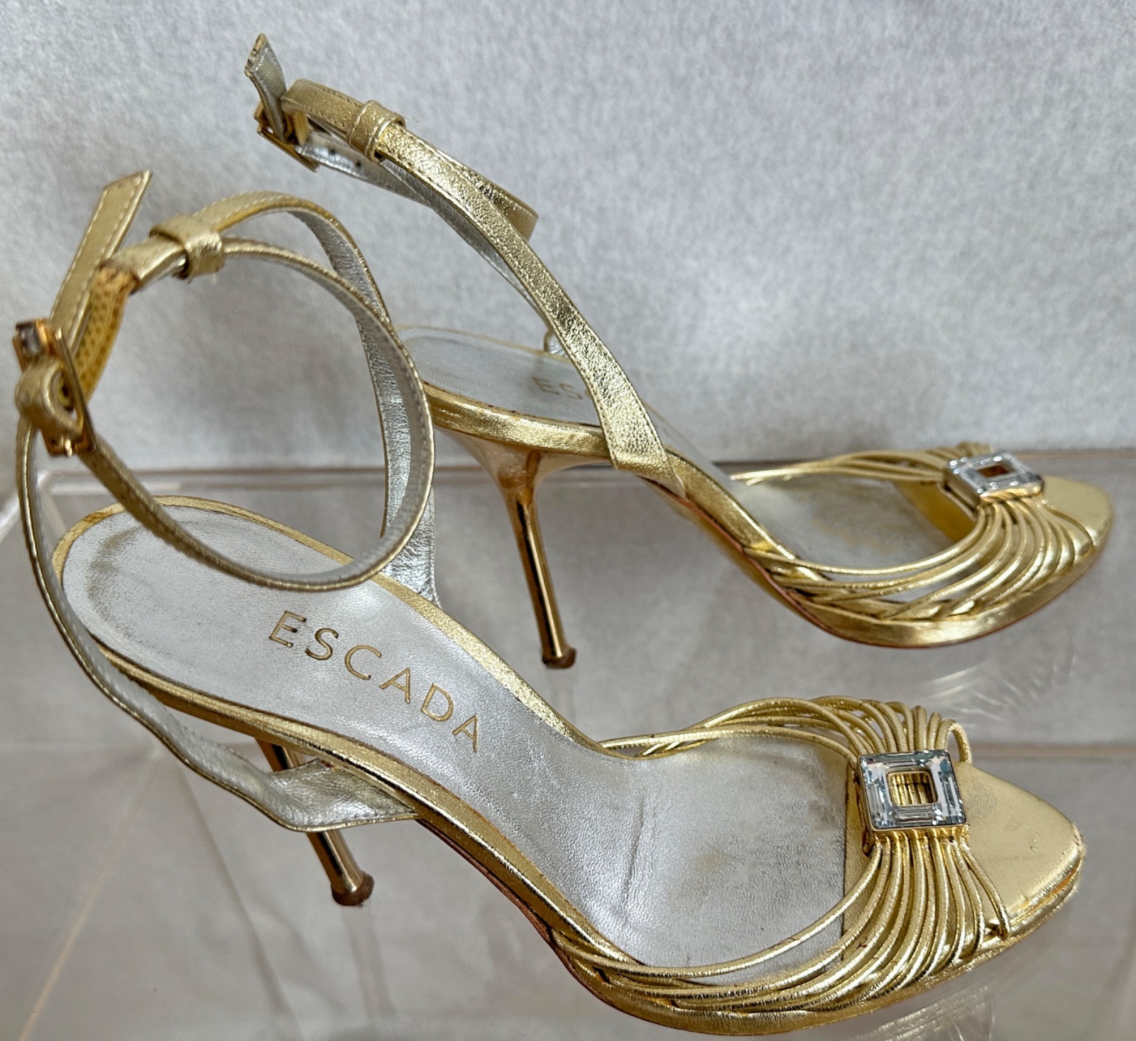 Kvalitné kožené sandálky s opätkom luxusnej značky Escada. Zapínanie na nastaviteľný remienok okolo kotníkov, kožené podrážky, aj interiér topánky je celokožený. Uvedená veľkosť 36 1/2.