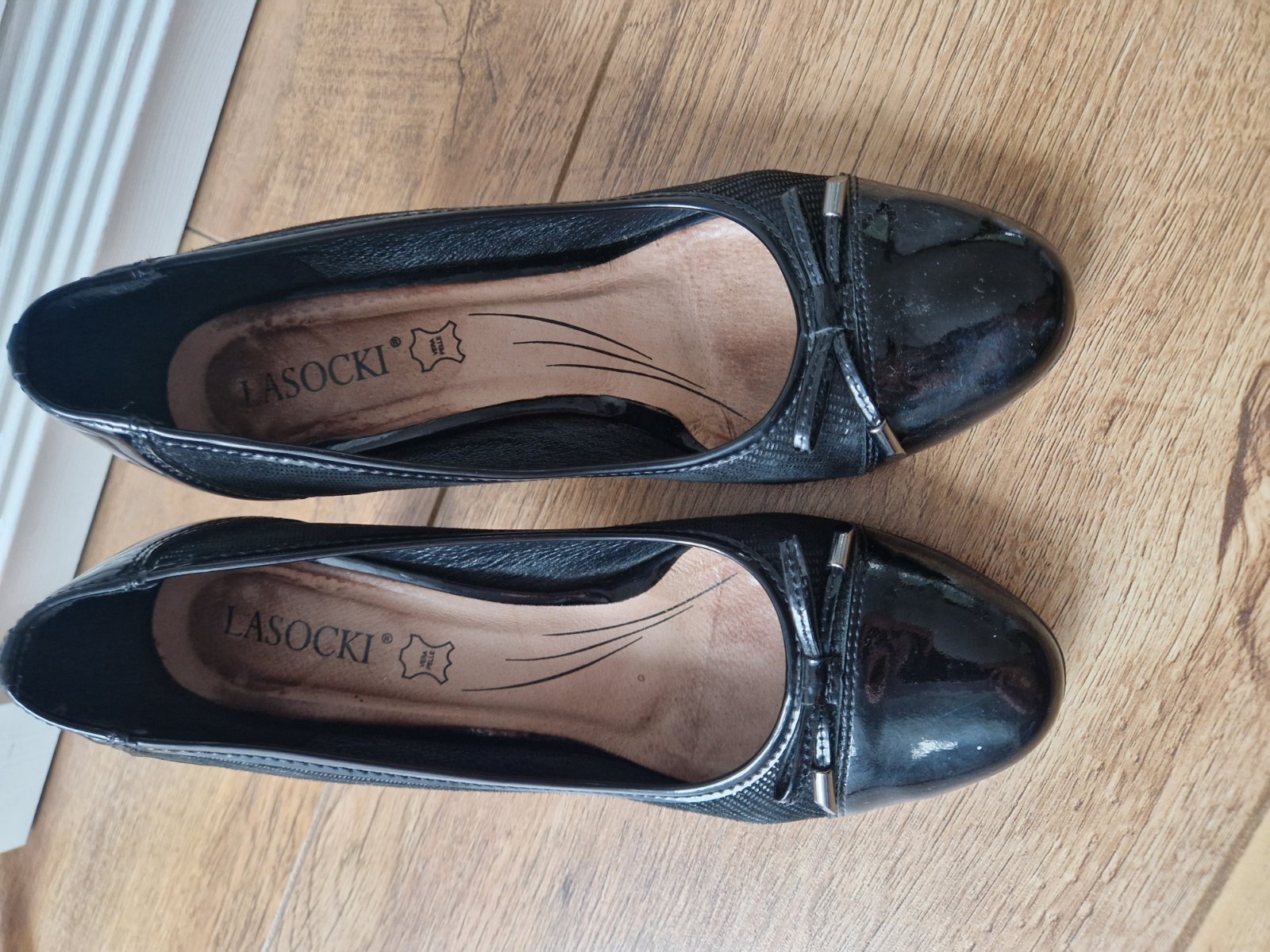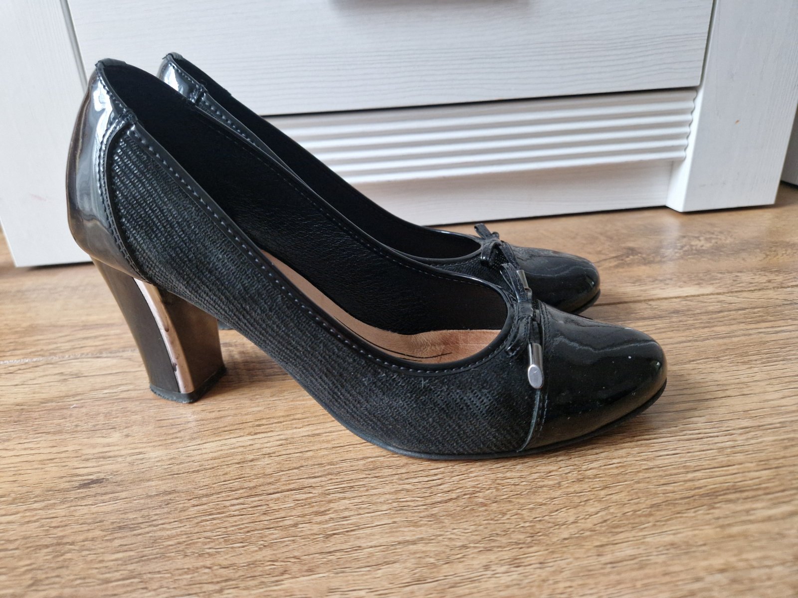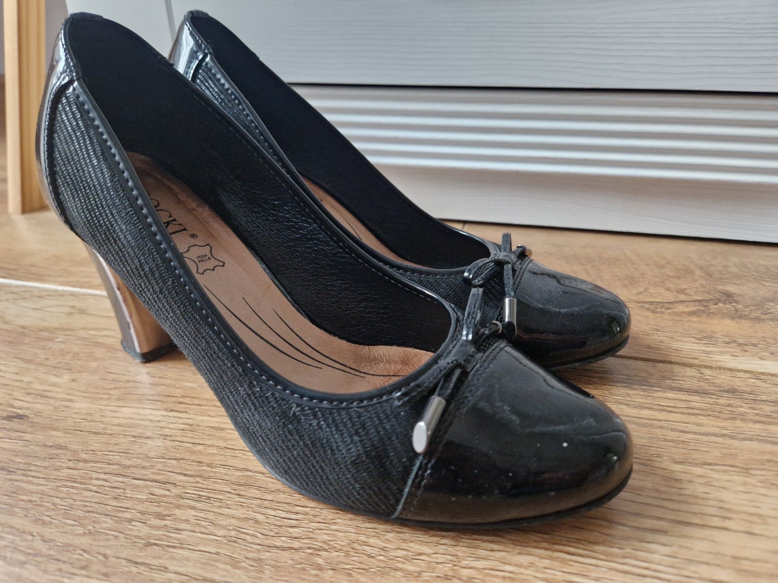 Vpredu a vzadu lakované, po bokoch brúsená koza. Obuté raz na svadbe. Mne sú veľké. Kedze menšie nemali a ja som súrne potrebovala topánky, dala som do nich kožené vložky a päticky. Náhradné opätky...