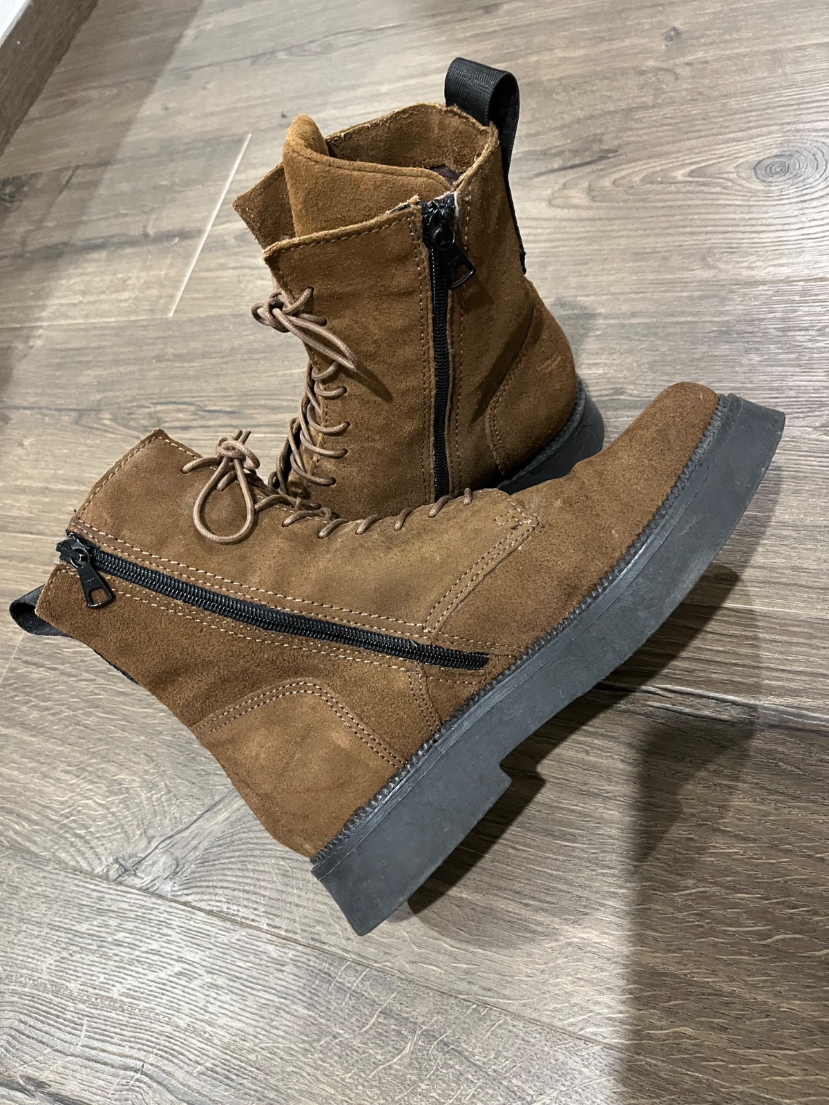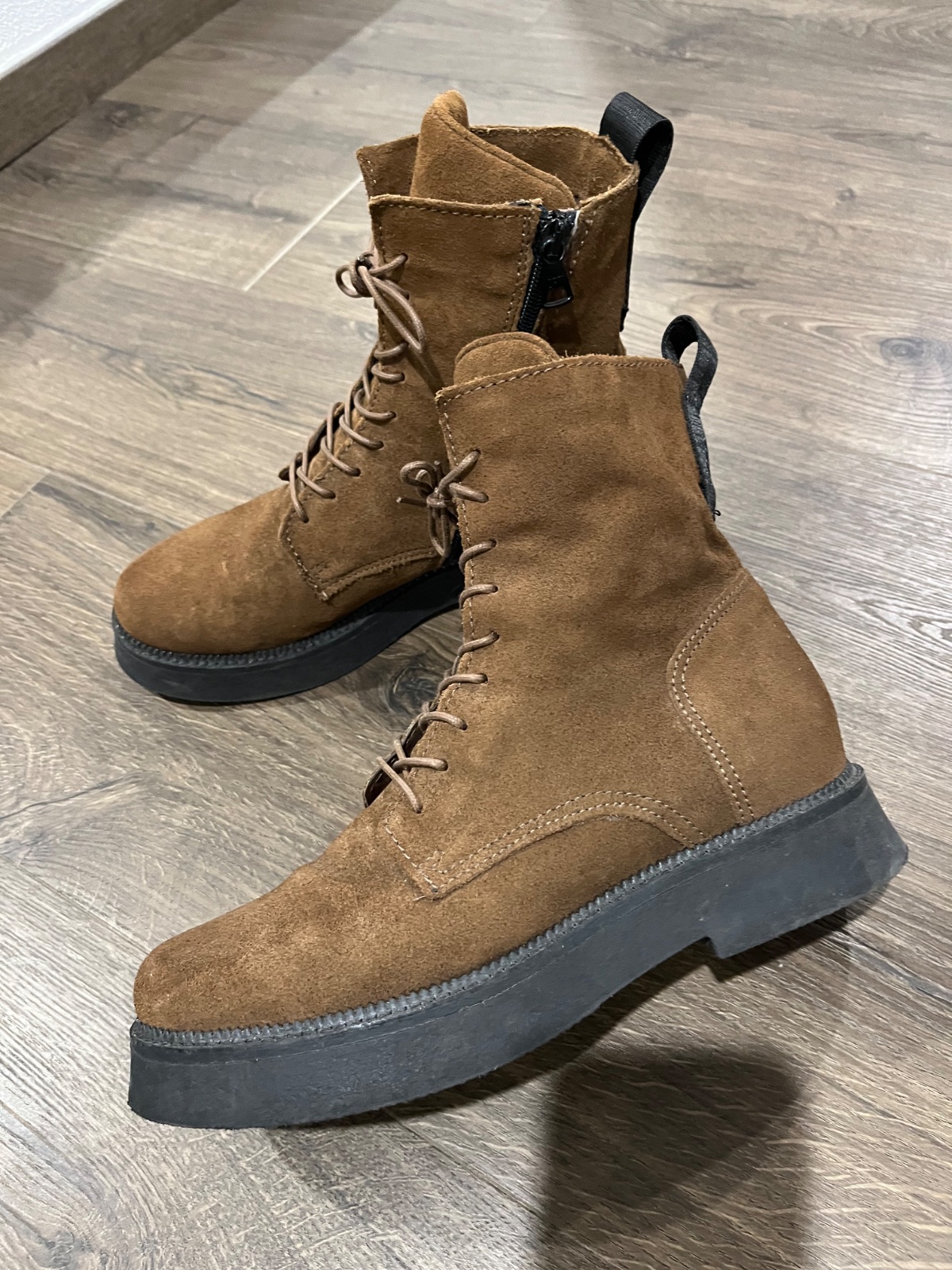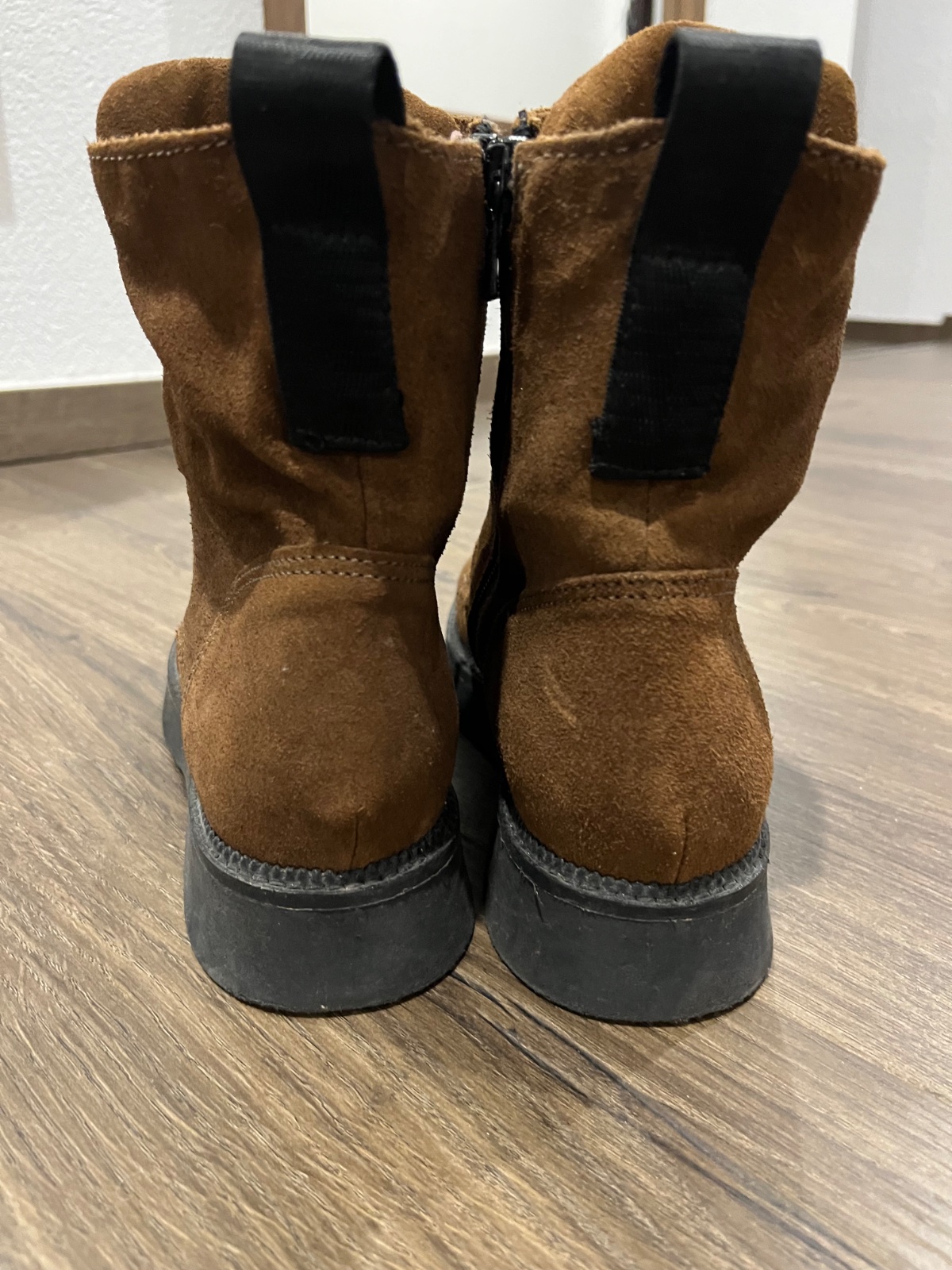 Super prechodne cizmy z brusenej koze zn.MJUS,pohodlná podrážka.Vdaka brusenej koži a zosilneniu jazyku sa krásne prispôsobia nohe,pogumované šnúrky.Mala som ich možno 2x obute,stav ako nové bez poškodení.Farba niečo medzi bledo a tmavou hnedou.PC v zľave 90€V cene je zahrnuté poštovné za balík na postu.