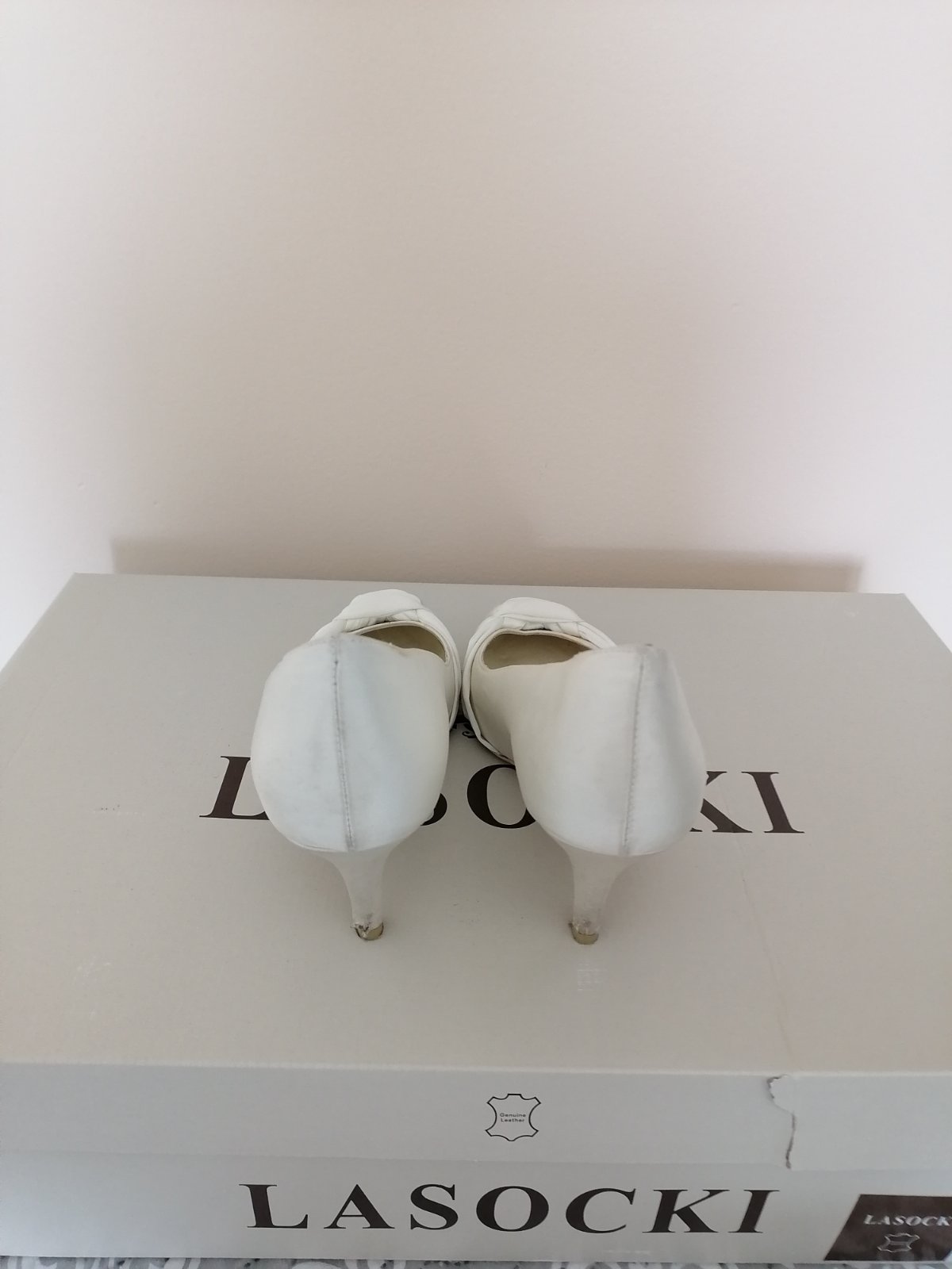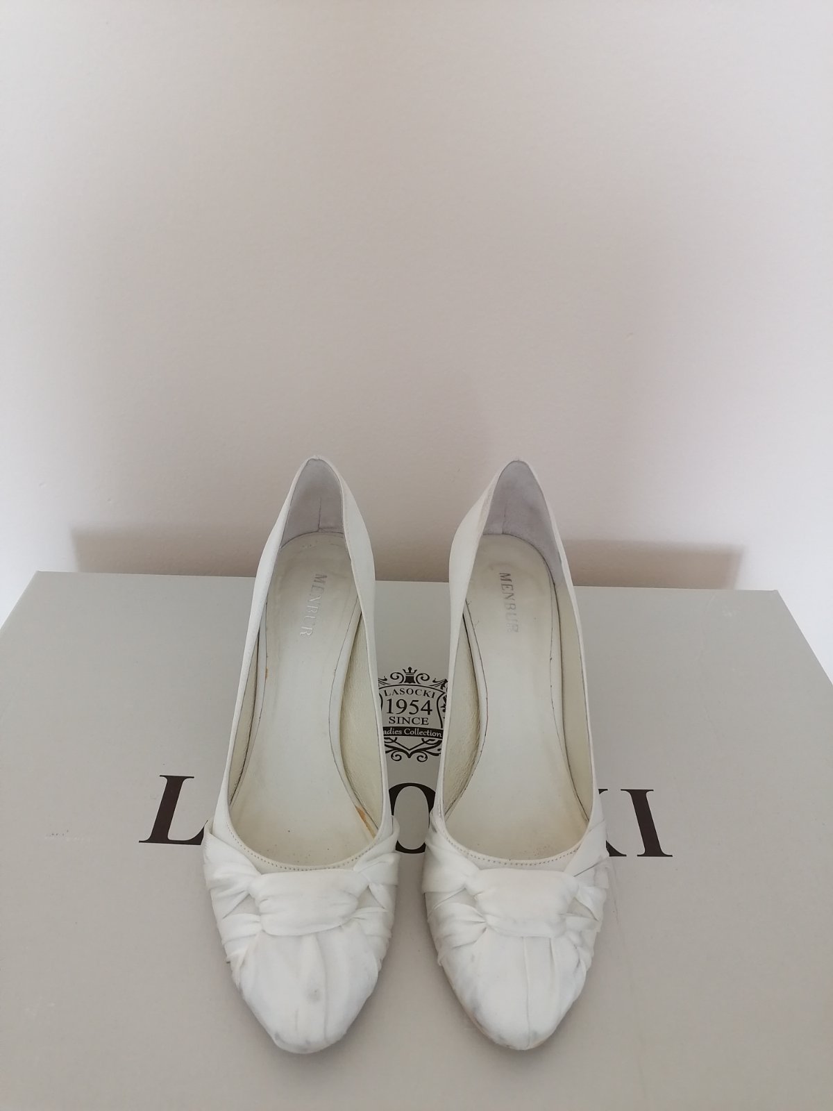 Svadobné topánky, značka witt. Jemnučko špinavá látka navrchu. Veľkosť opätku 8cm, ale platforma má 2cm.