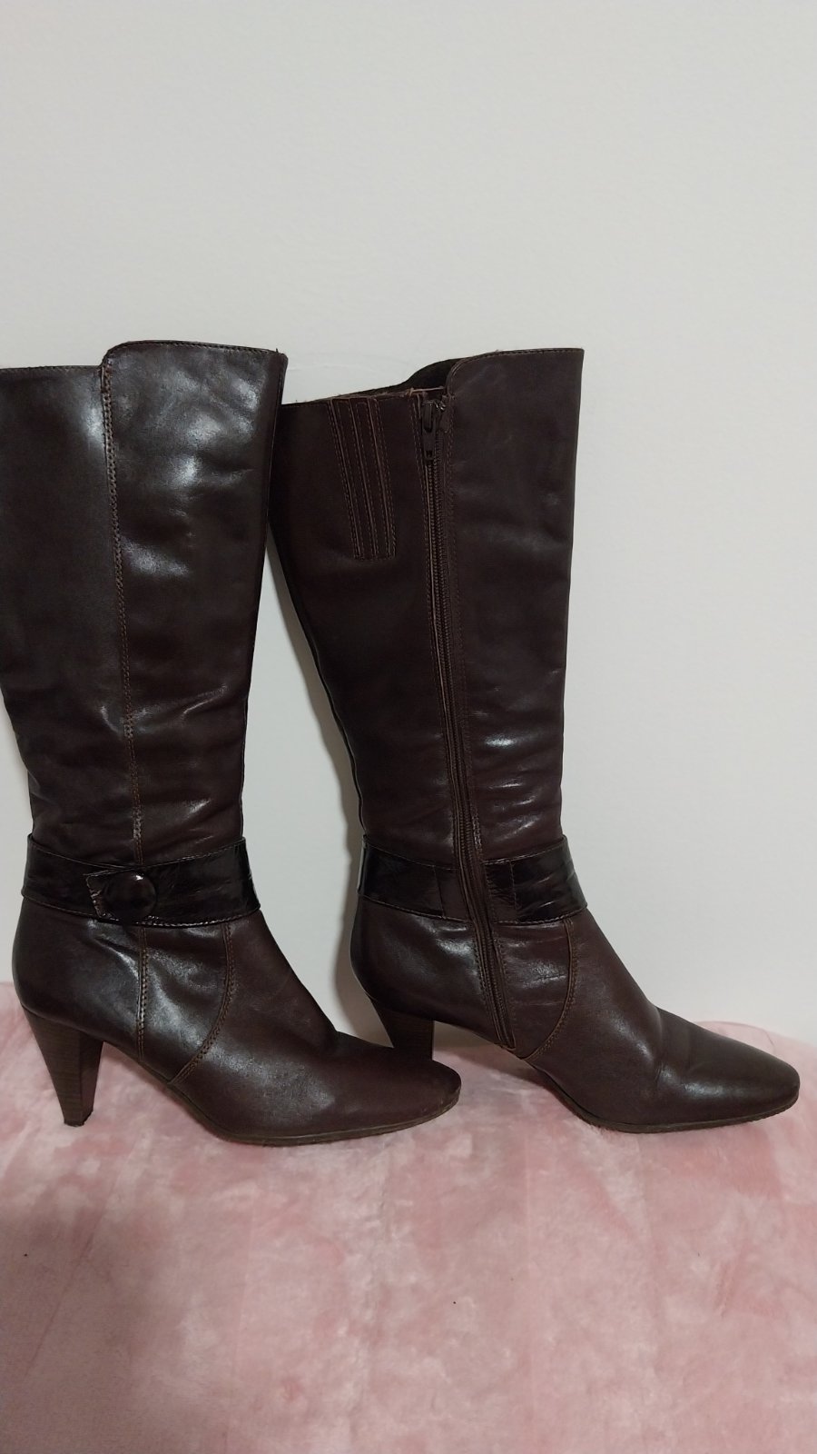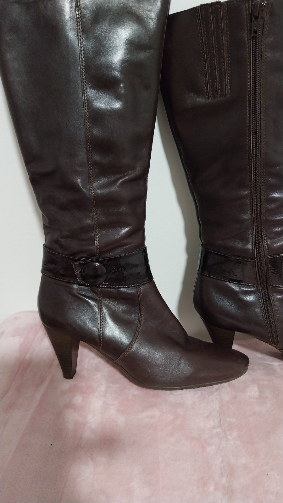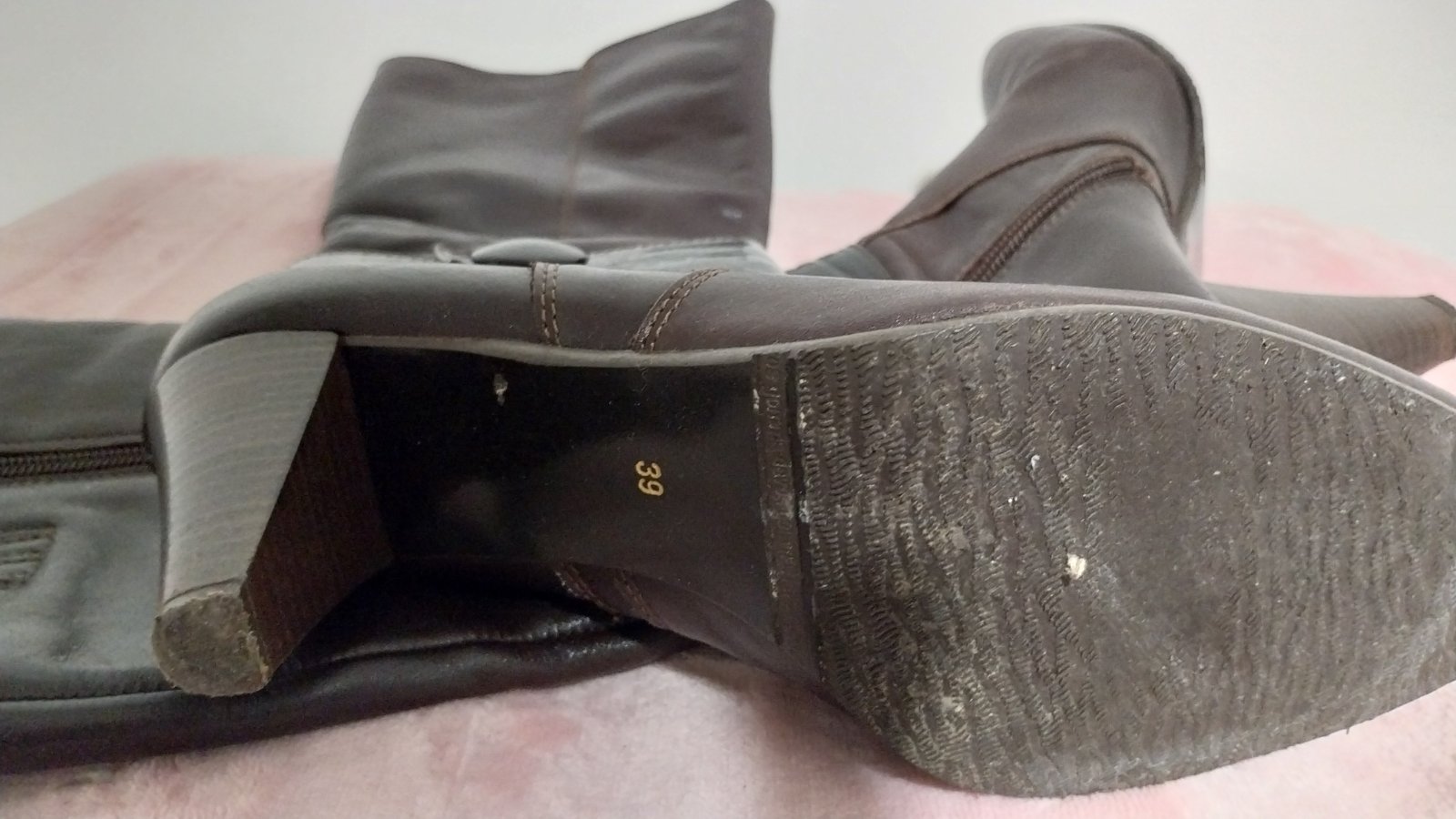 Hnedé čižmy na podpätku v TOP stave. Obuté veľmi málo. Nepoškodené. Jediná malička kozmetická vada je na podpätku - viď foto. Veľkosť sedí.