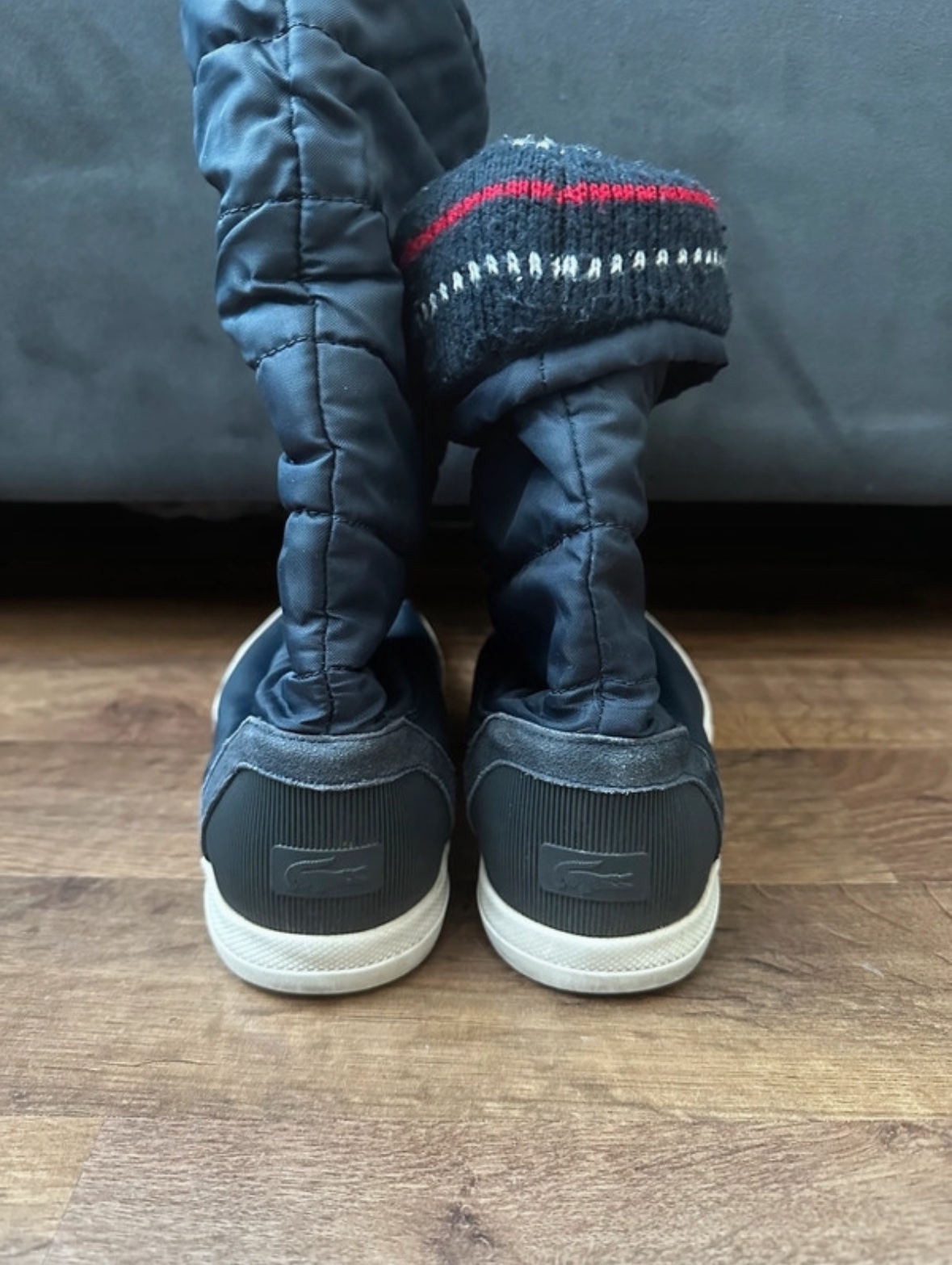 Predávam šuštiakové snehule značky Lacoste veľkosti 40,5. Na posledných dvoch fotkách vidieť poškodenie, ale pri bežnom nosení to nie je vidno.