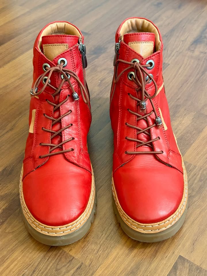 Predám kotníkové topánky zn.BAŤA, vyrobené z kvalitnej pravej kože, krásna červená farba, zapínanie na praktický bočný zips, elastické ozdobné šnúrky, protišmyková podrážka. Vnútro je celé tiež vyrobené z pravej kože, ktorá poskytuje priedušnosť a pohodlie počas celého dňa. Veľkosť 40, dĺžka koženej stielky 25,7 cm, výška podpätku 3 cm. Sú ľahké, mäkké ako papuče a majú elegantný vzhľad. Pôvodná cena bola 119 EUR. BA alebo poštou+poštovné.