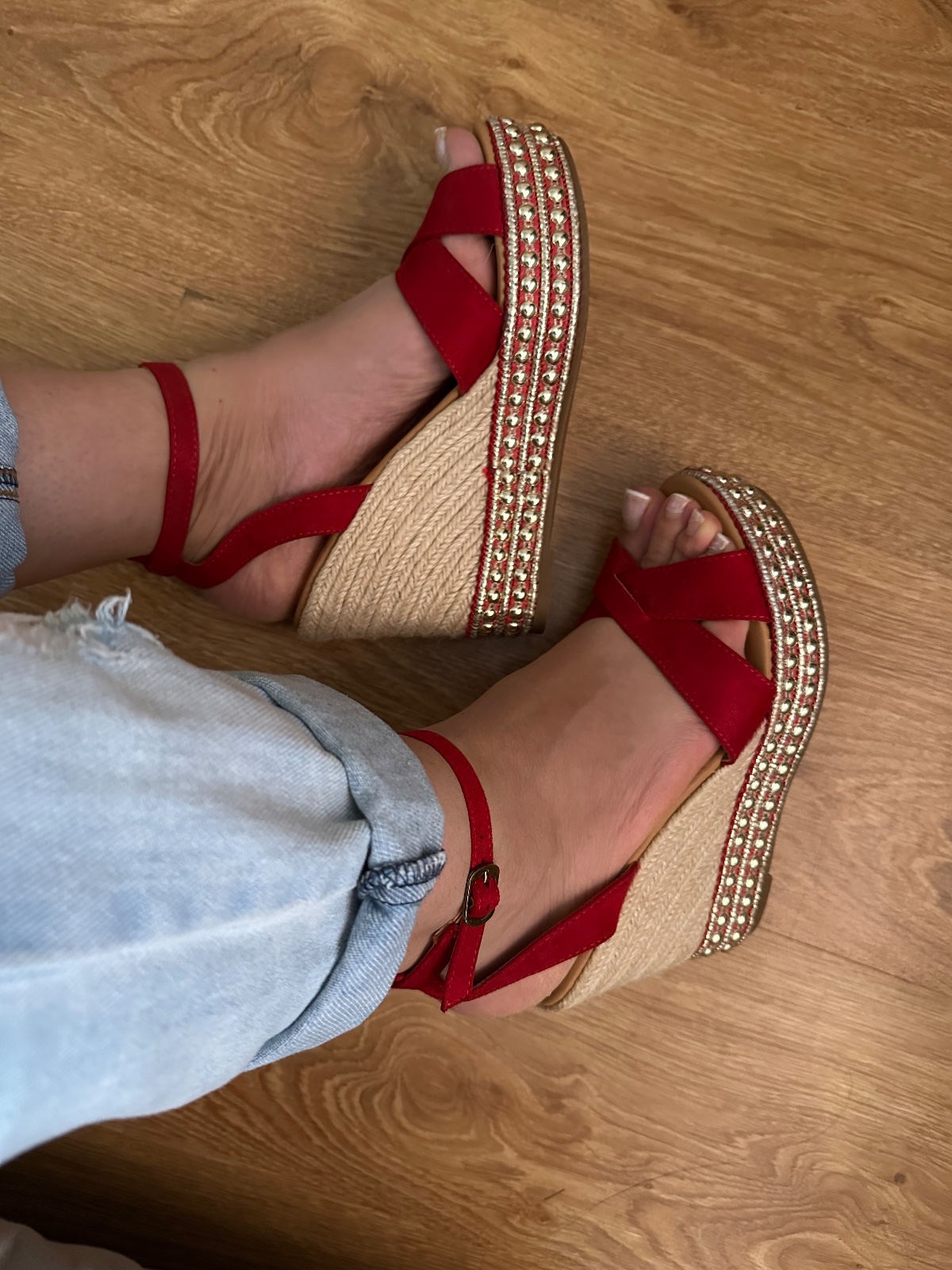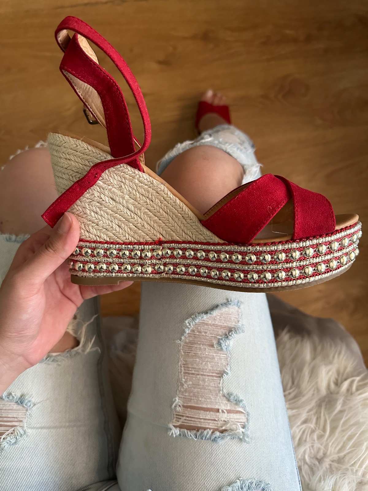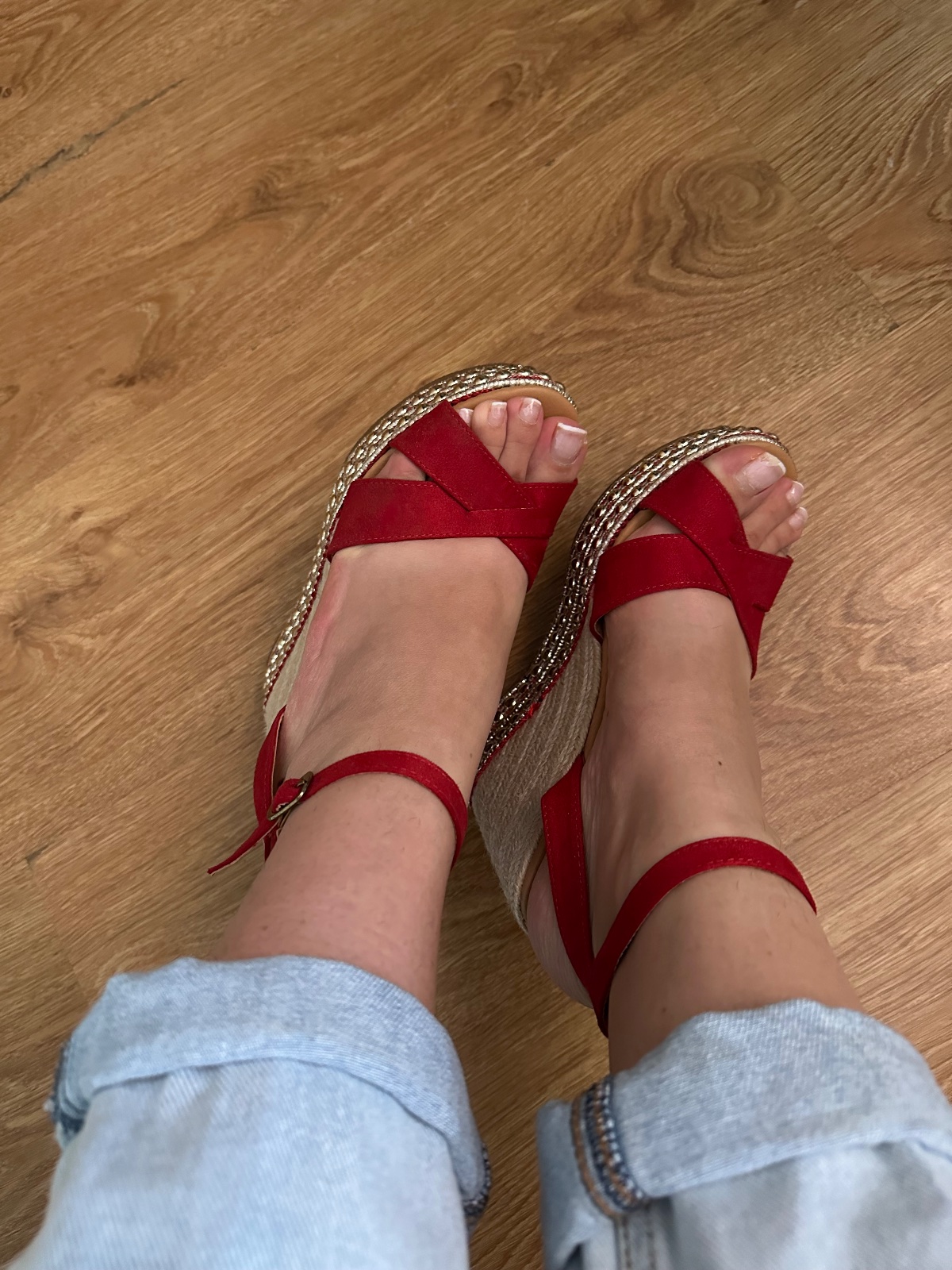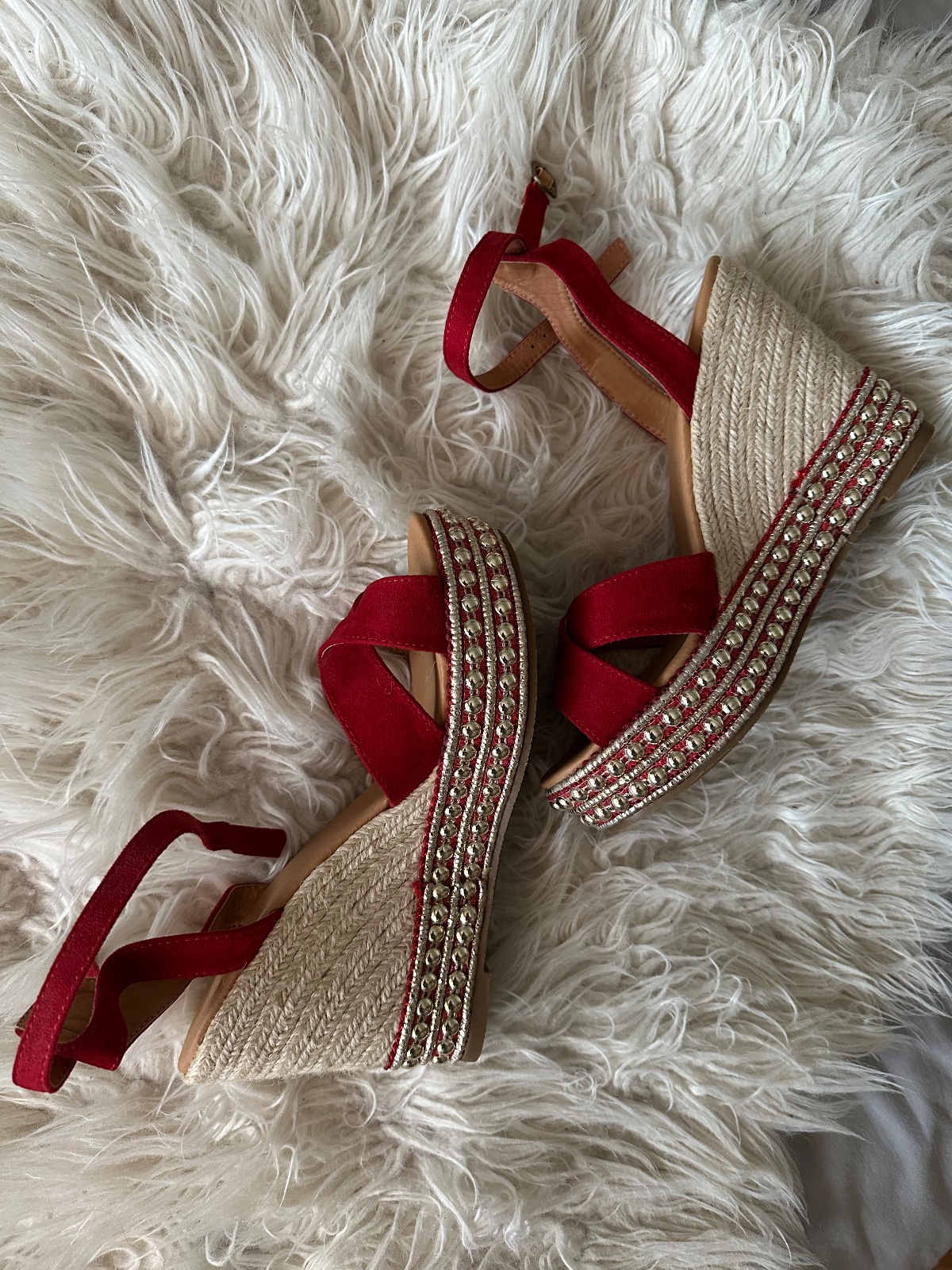 Vsuvky sú kožené s klinovým opätkom, ktorého výška je cca 6cm. Farba je matná červená. Na topánke je uvedená veľkosť 39, ale rozmerovo je to skôr 38, dĺžka topánky je 25 cm.