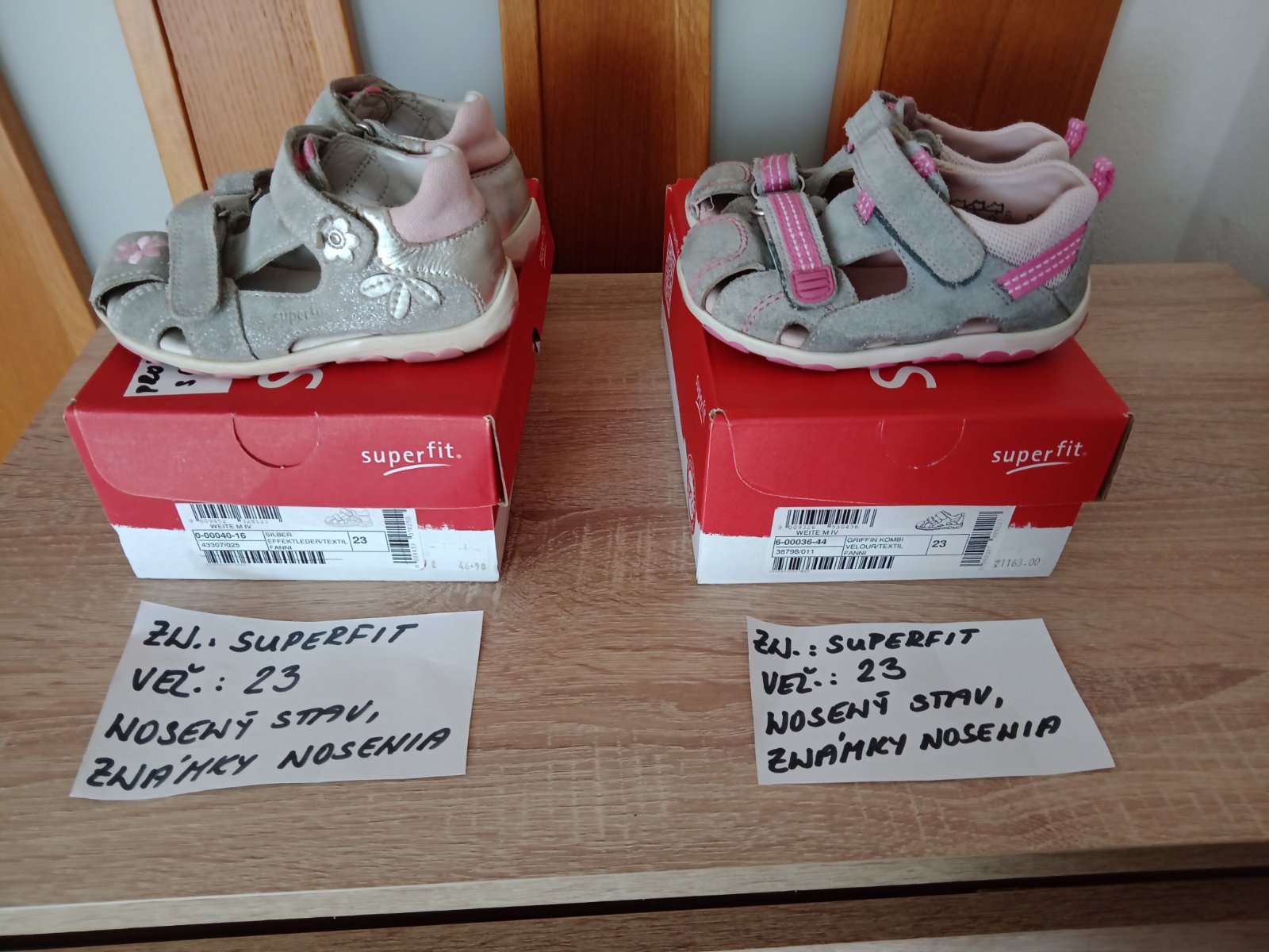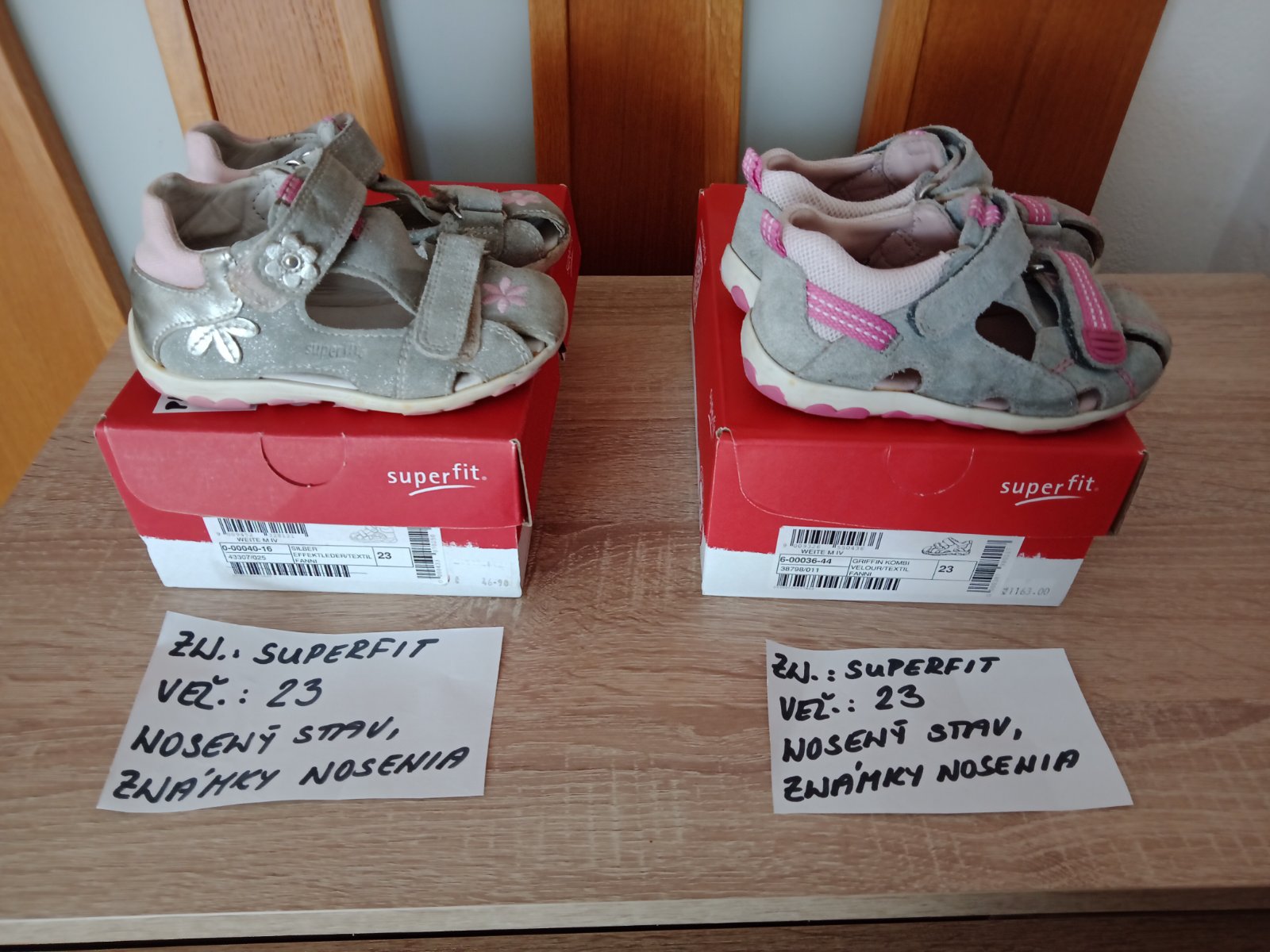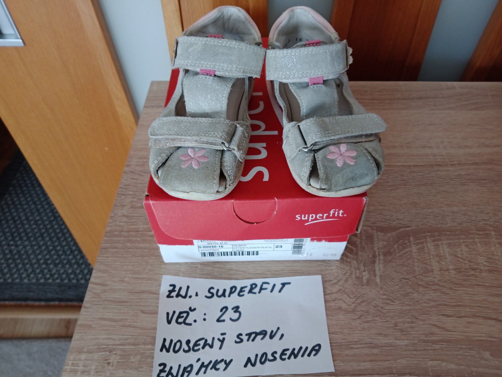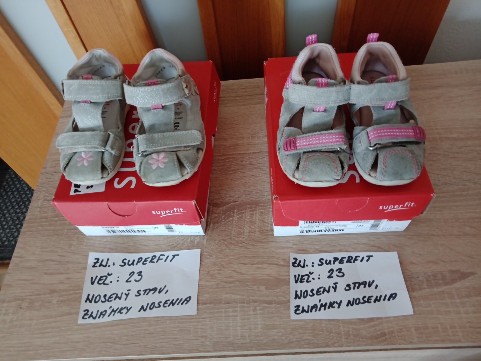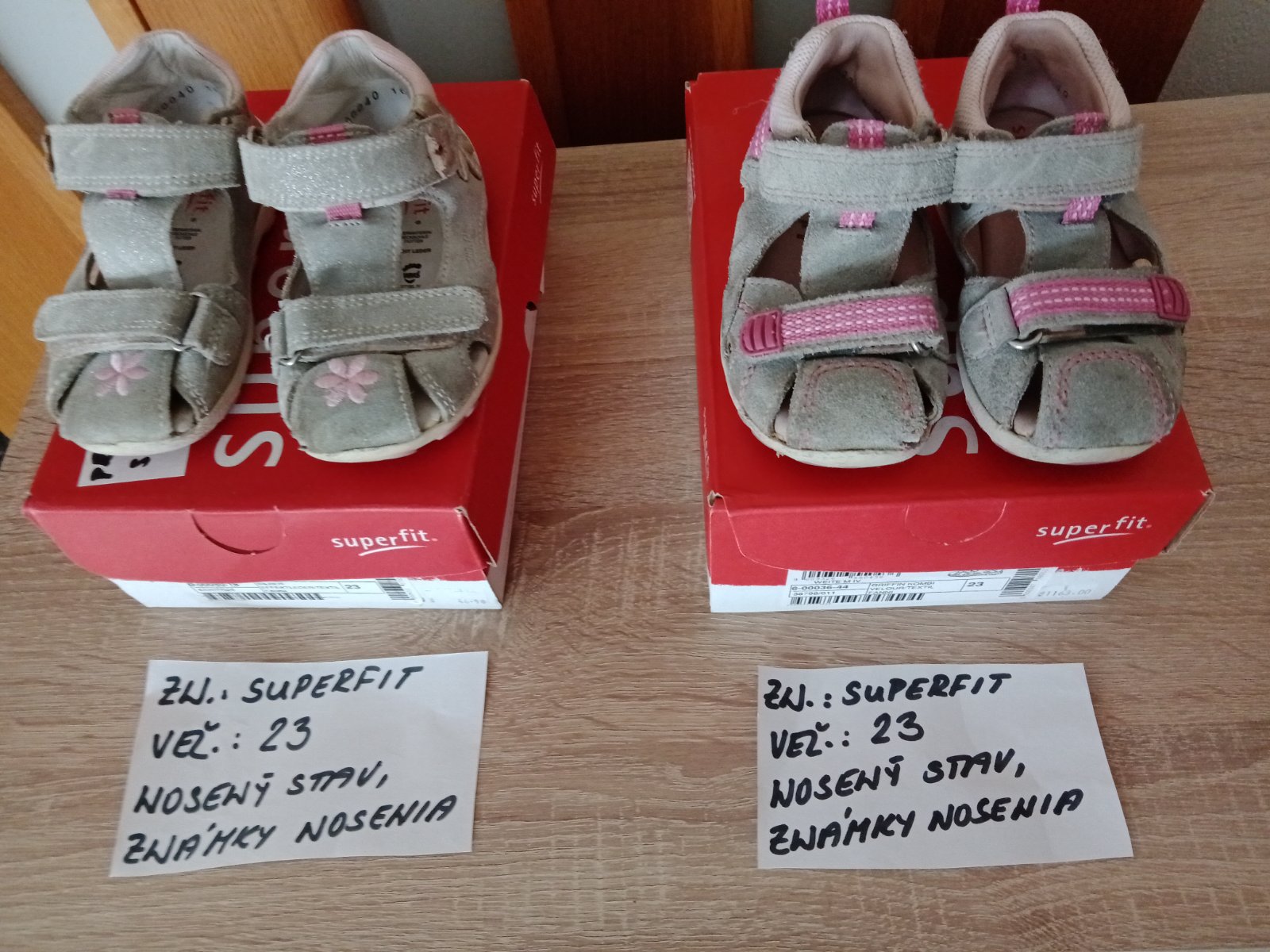 Dievčenské sandále zn.Superfit veľ.23,v nosenom stave,sú na nich známky nosenia hlavne vpredu,na jednej sandále každého páru je trošku poškodenie(natrhnuté),ale nepara sa to ďalej. na nosenie po záhrade,alebo po dvore možno ešte niekomu poslúžia.Cena za pár 5eur.