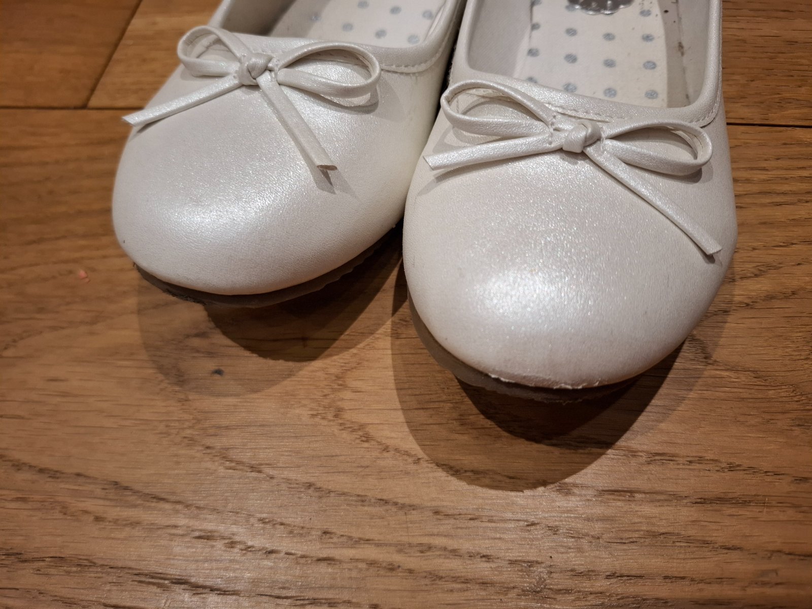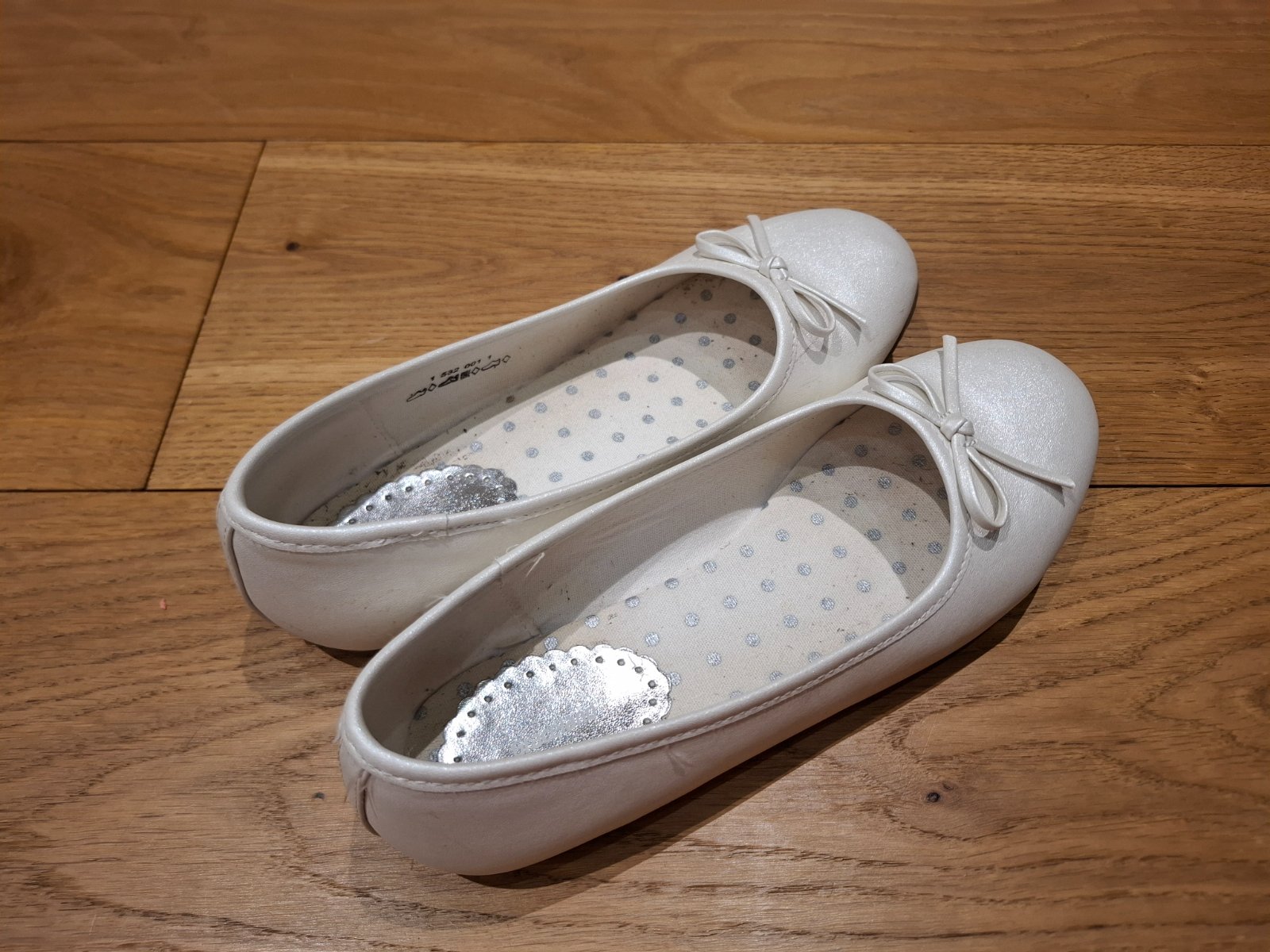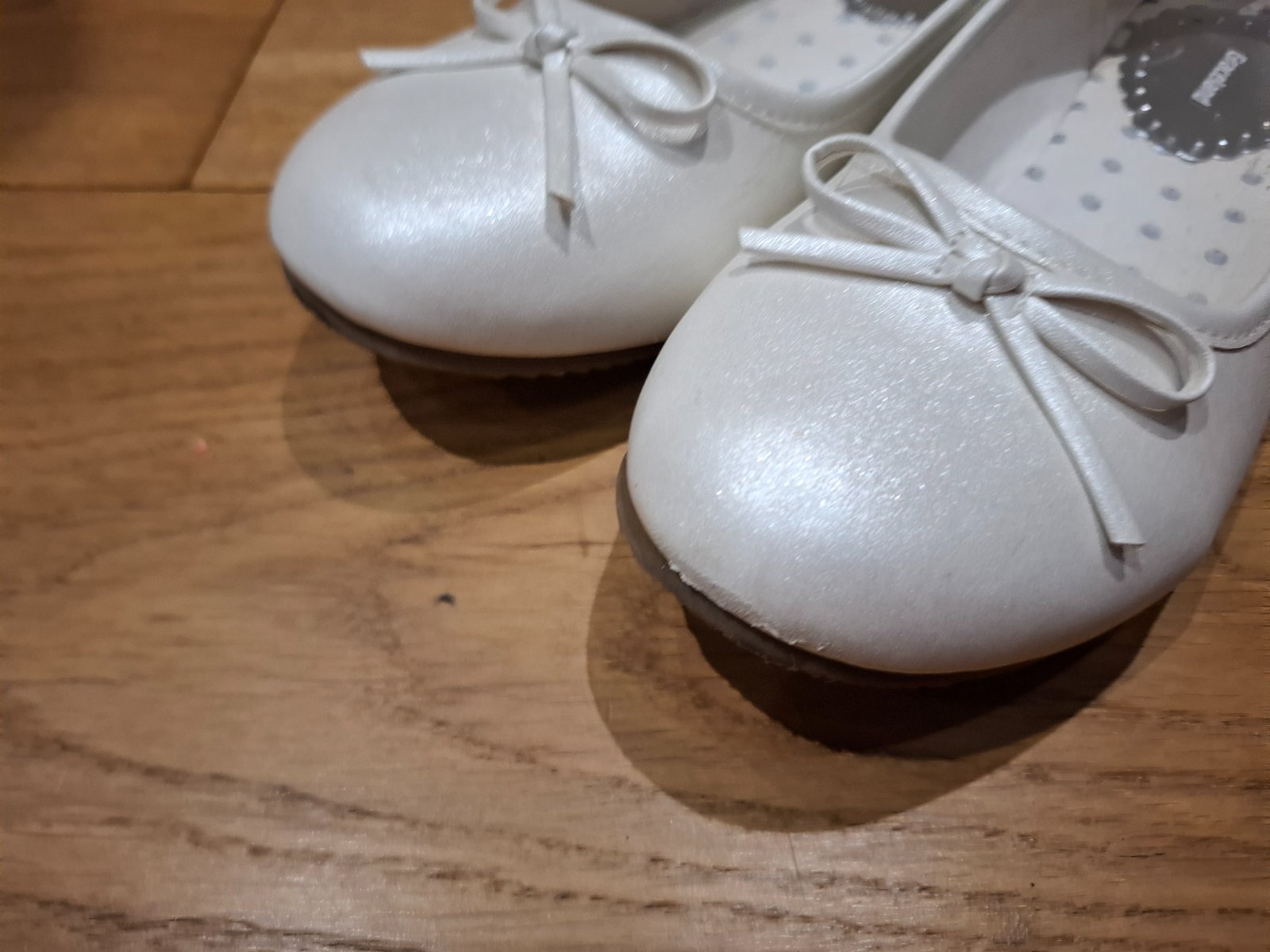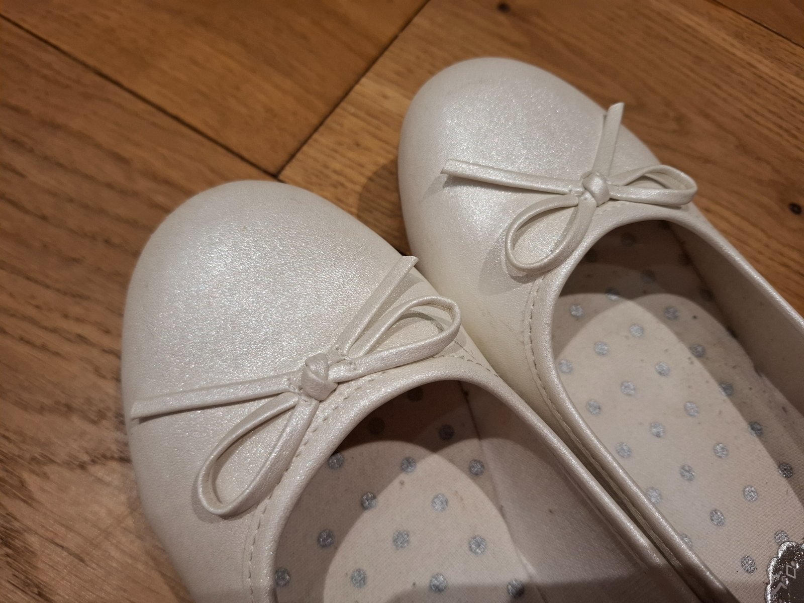 Biele perleťové balerínky použité na 1. svätom prijímanií a jednej oslave. Na jednej je jemne odretá špička, no ani to nevidno - viď foto.