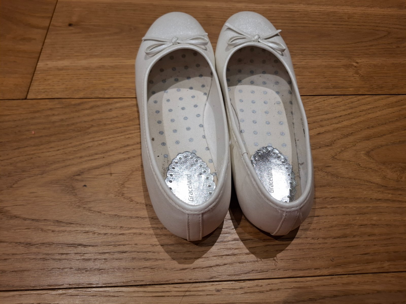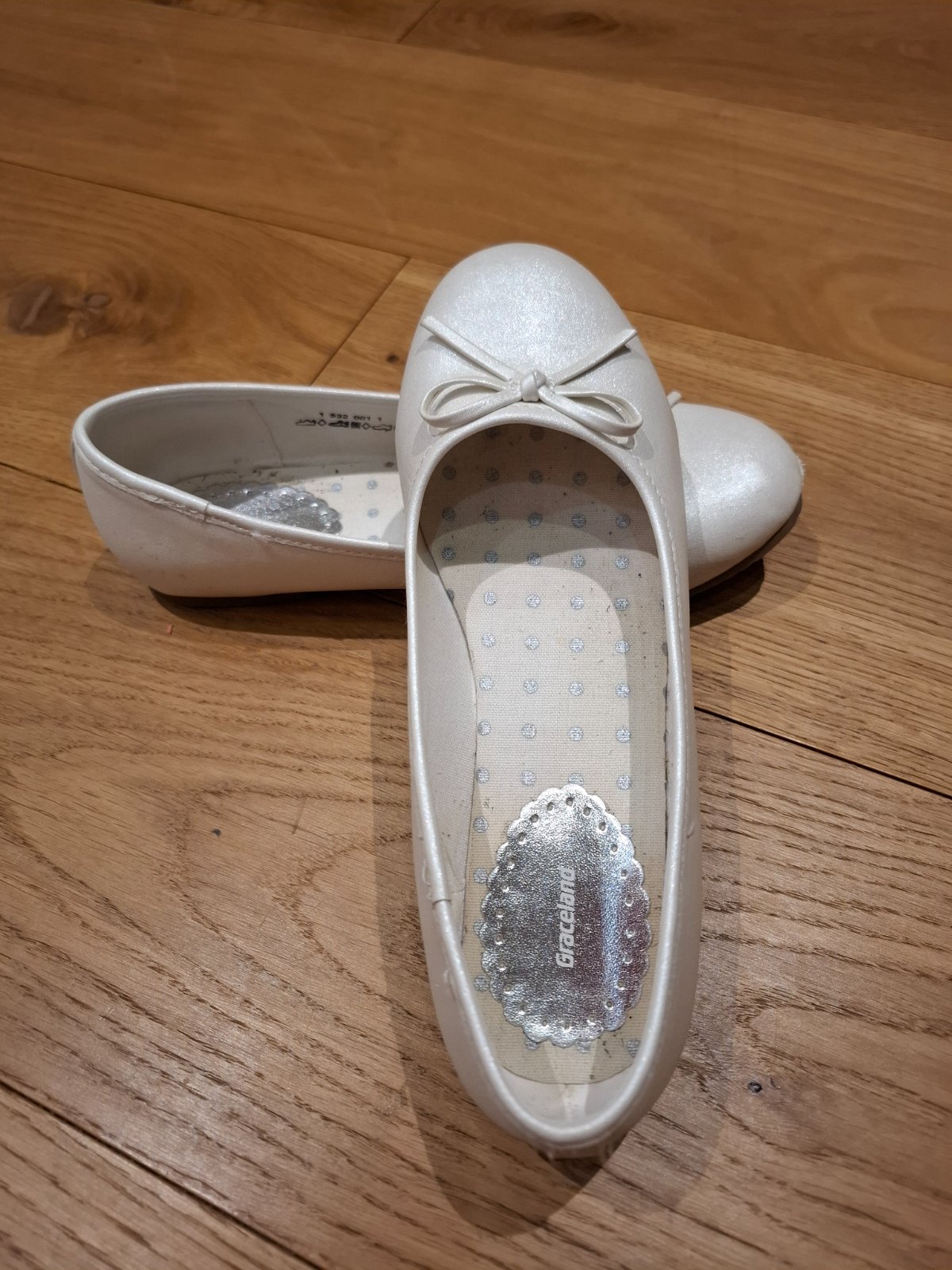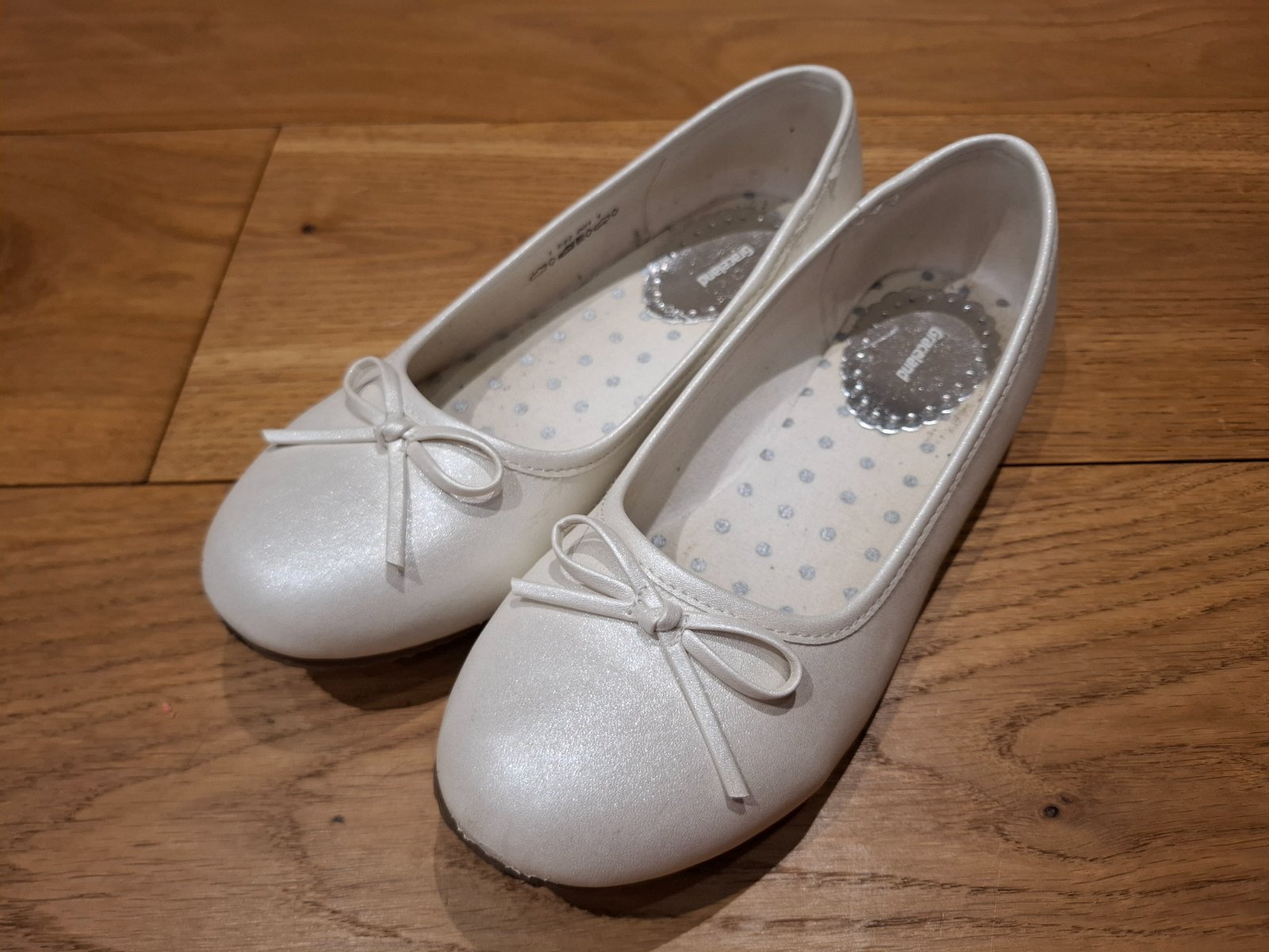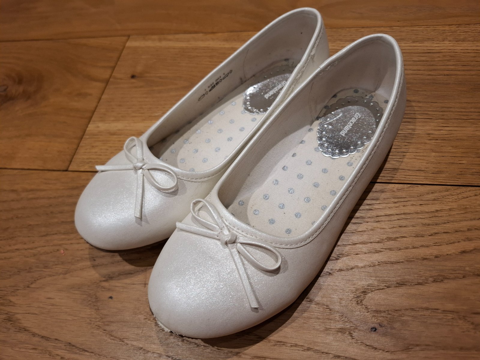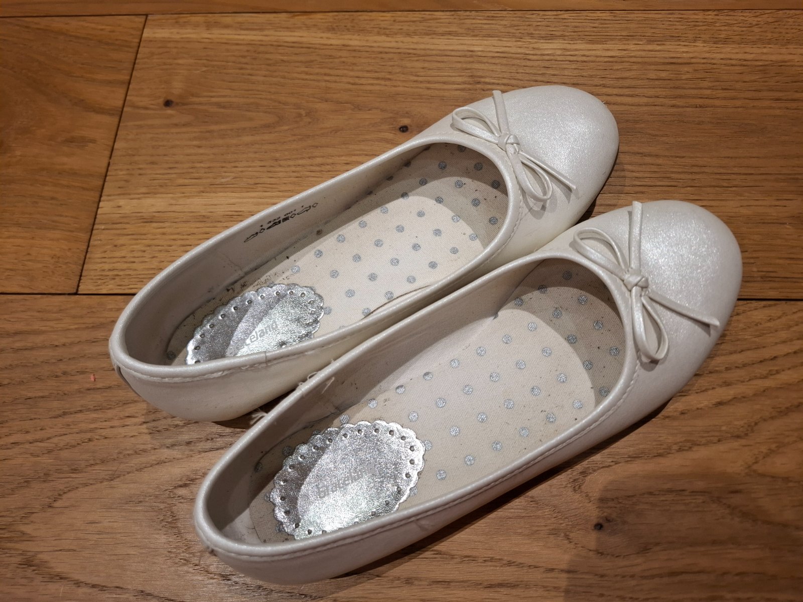 Biele perleťové balerínky použité na 1. svätom prijímanií a jednej oslave. Na jednej je jemne odretá špička, no ani to nevidno - viď foto.
