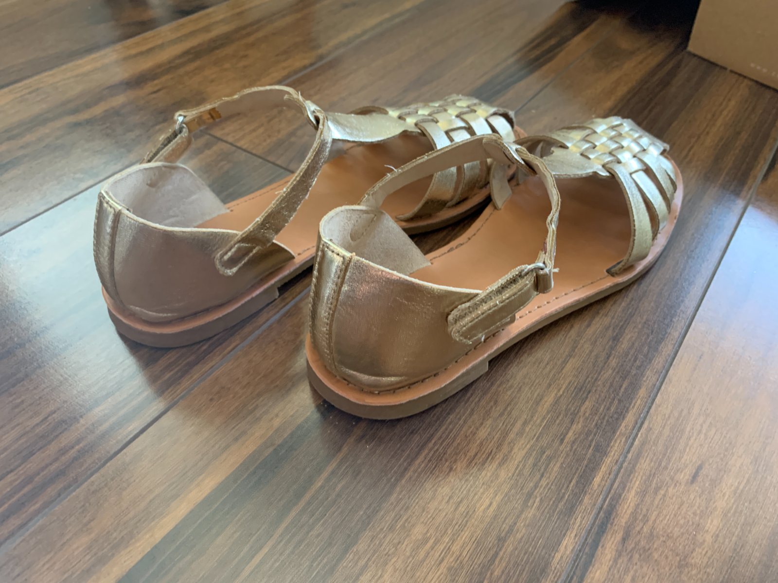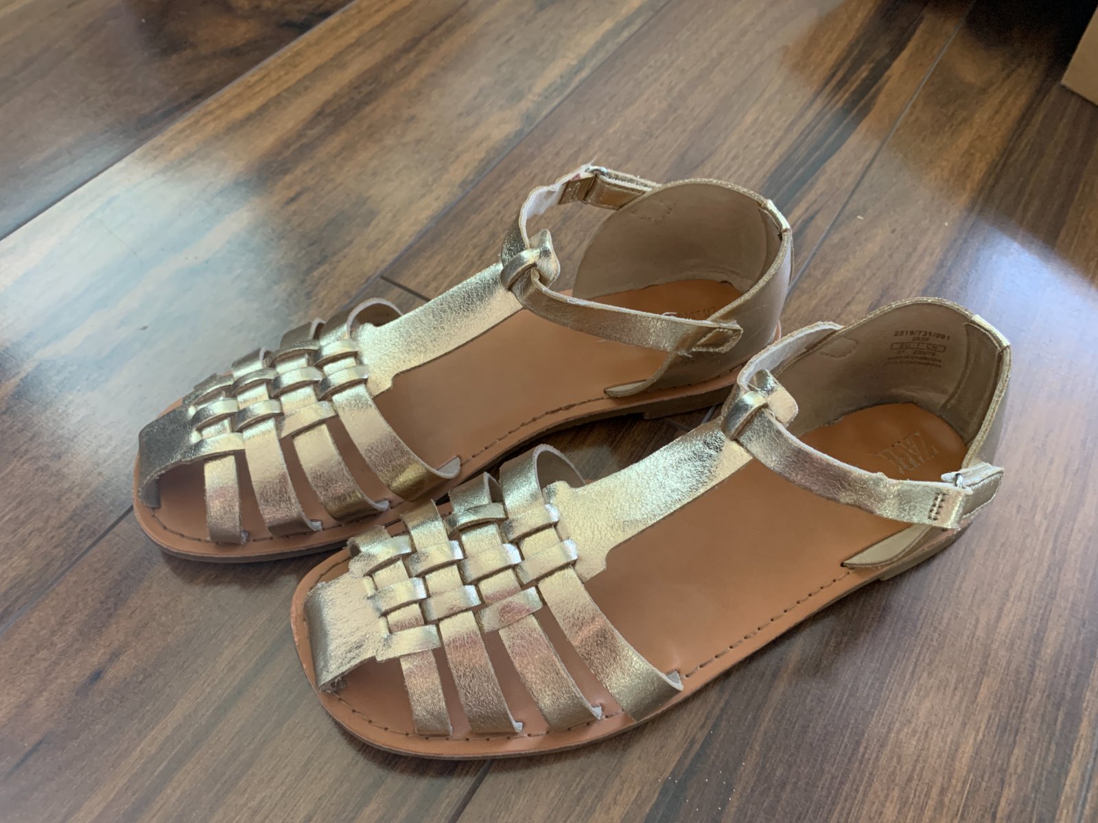 Zlaté sandálky, veľ. 37, nosené ale v super stave, žiadne odreniny, akurát sa nám vnútro remienka odlepilo, bolo to tiež zlate ale pri nosení nevidno- viď posledné foto. Cena: 5,00 EUR + pošt.