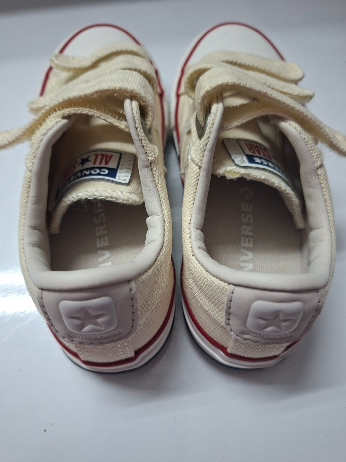 Platene / latkove detske tenisky, tramky zn. Converse All Star. Vpredu gumena cast. Farba - natural / ivory, kremova (nie biela). Uvedena velkost: US 11, UK 10,5, Eur 28, 17cm, ale sedia skor na ve...