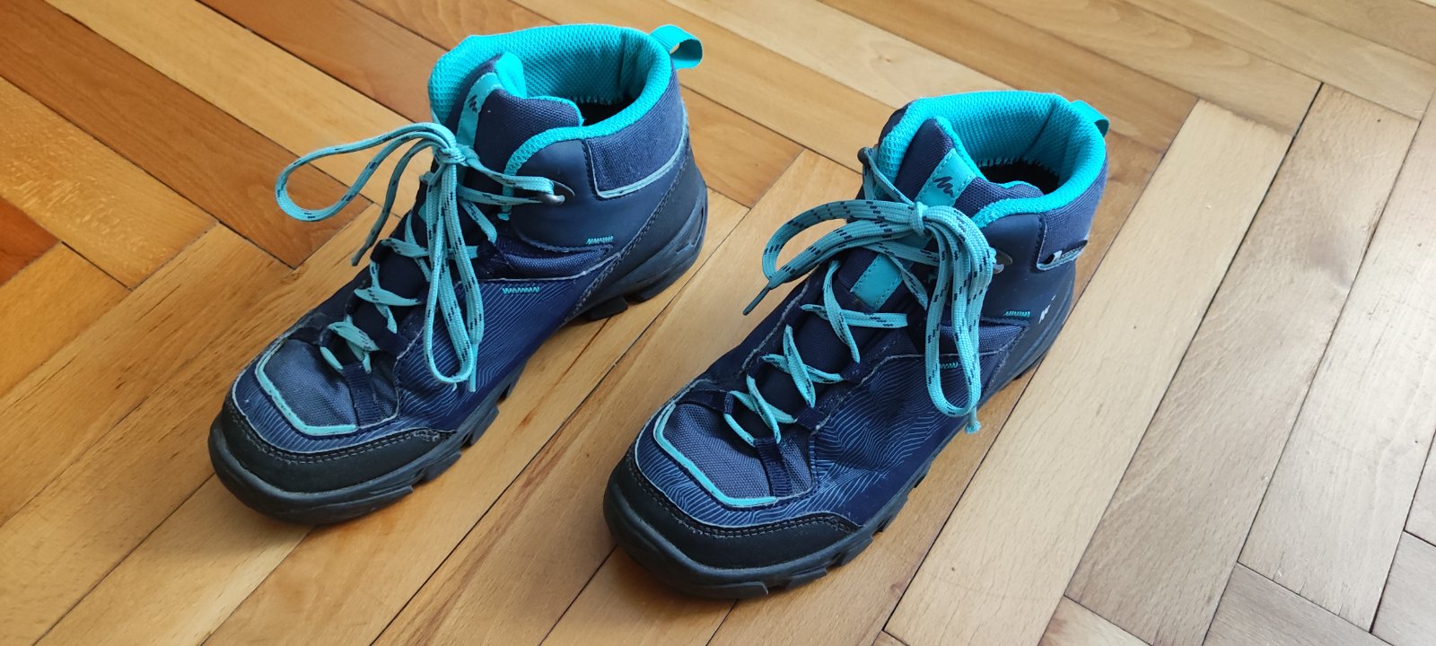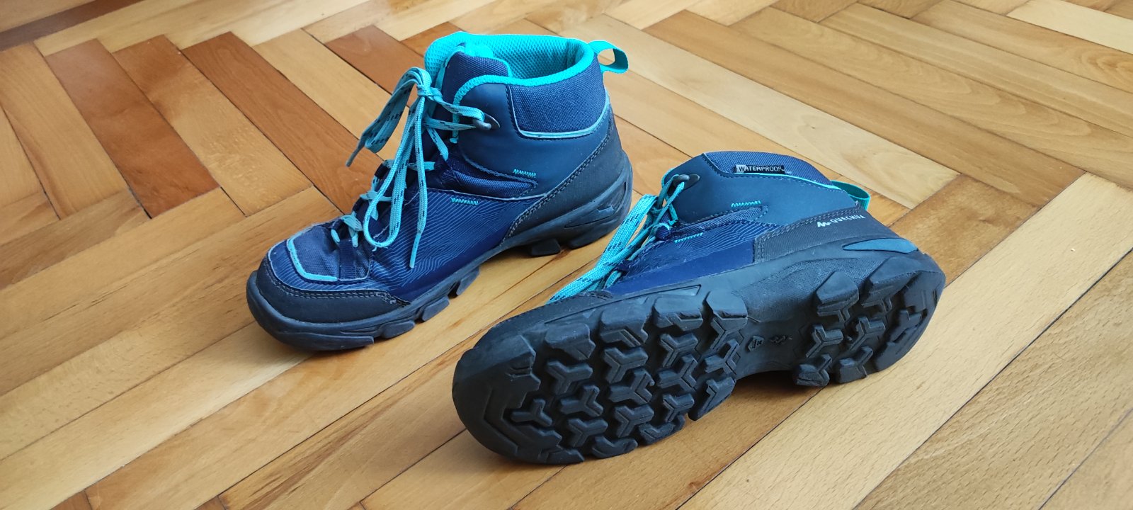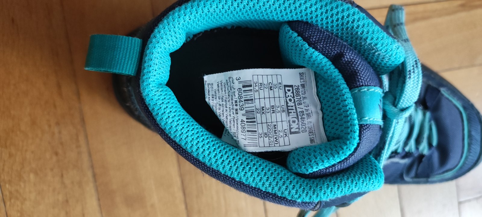 Predám detskú turistickú nepremokavú obuv značky QUECHUA (Decathlon), veľkosť 35 (vnútorná dĺžka - cca 22 cm), obuv je polovysoká, tyrkysovej farby, podrážky zaisťujú stabilitu v každom teréne. Topánky majú bežné známky nosenia.