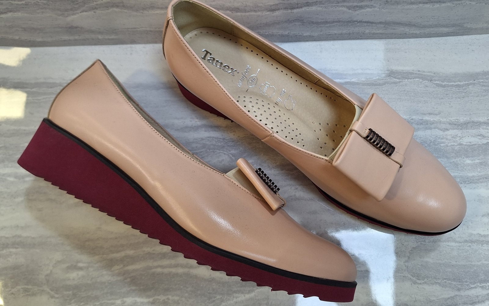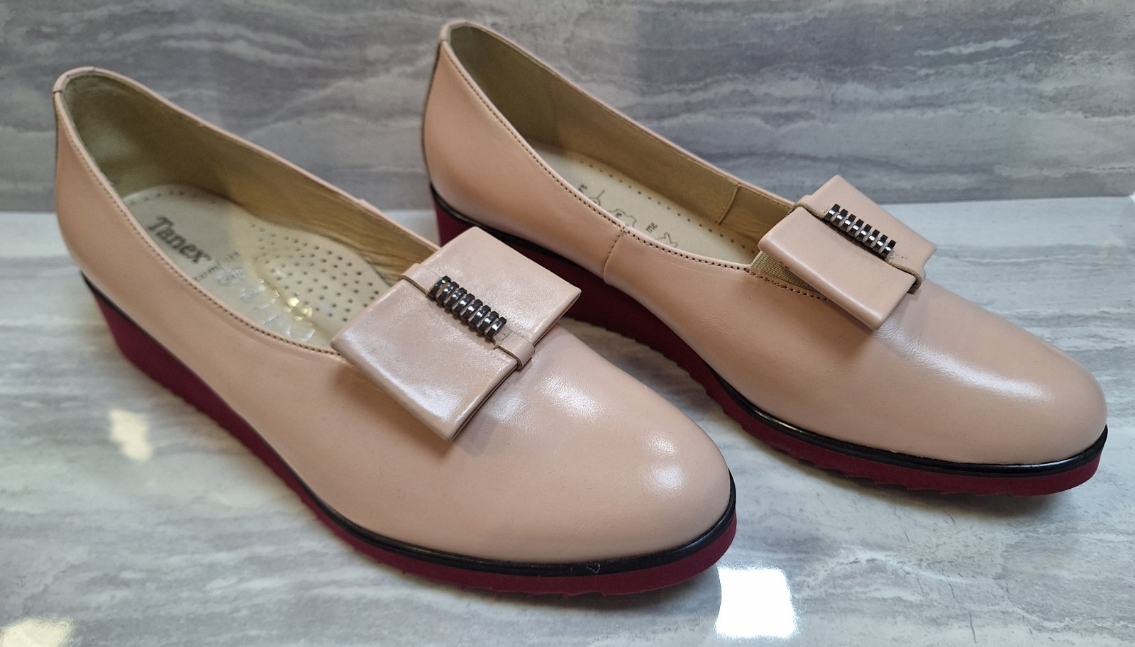 Dámske kožené topánky na platforme 3 cm v jemne ružovej farbe s bordovou podrážkou.