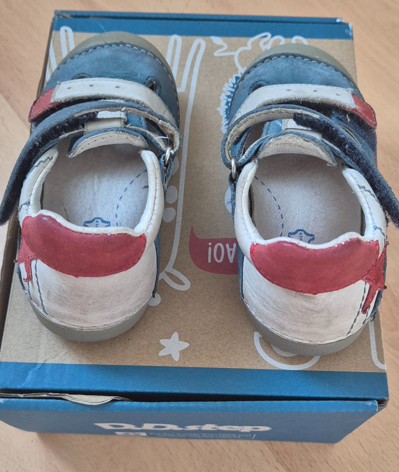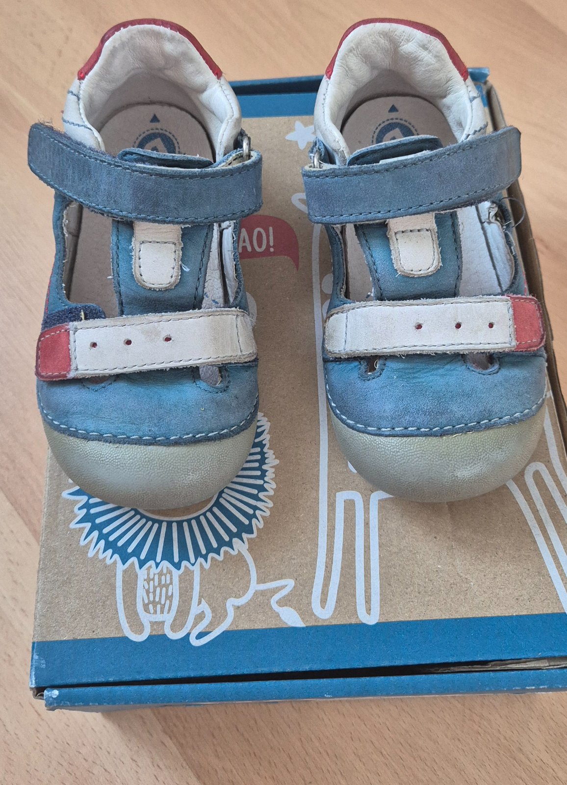 Sandalky kozene s obrazkom leva. Nosene malo, lepaky dobre drzia ale pouzivane na prve kroky, obe spicky su šuchnute. Cena 5 eur plus postovne.
