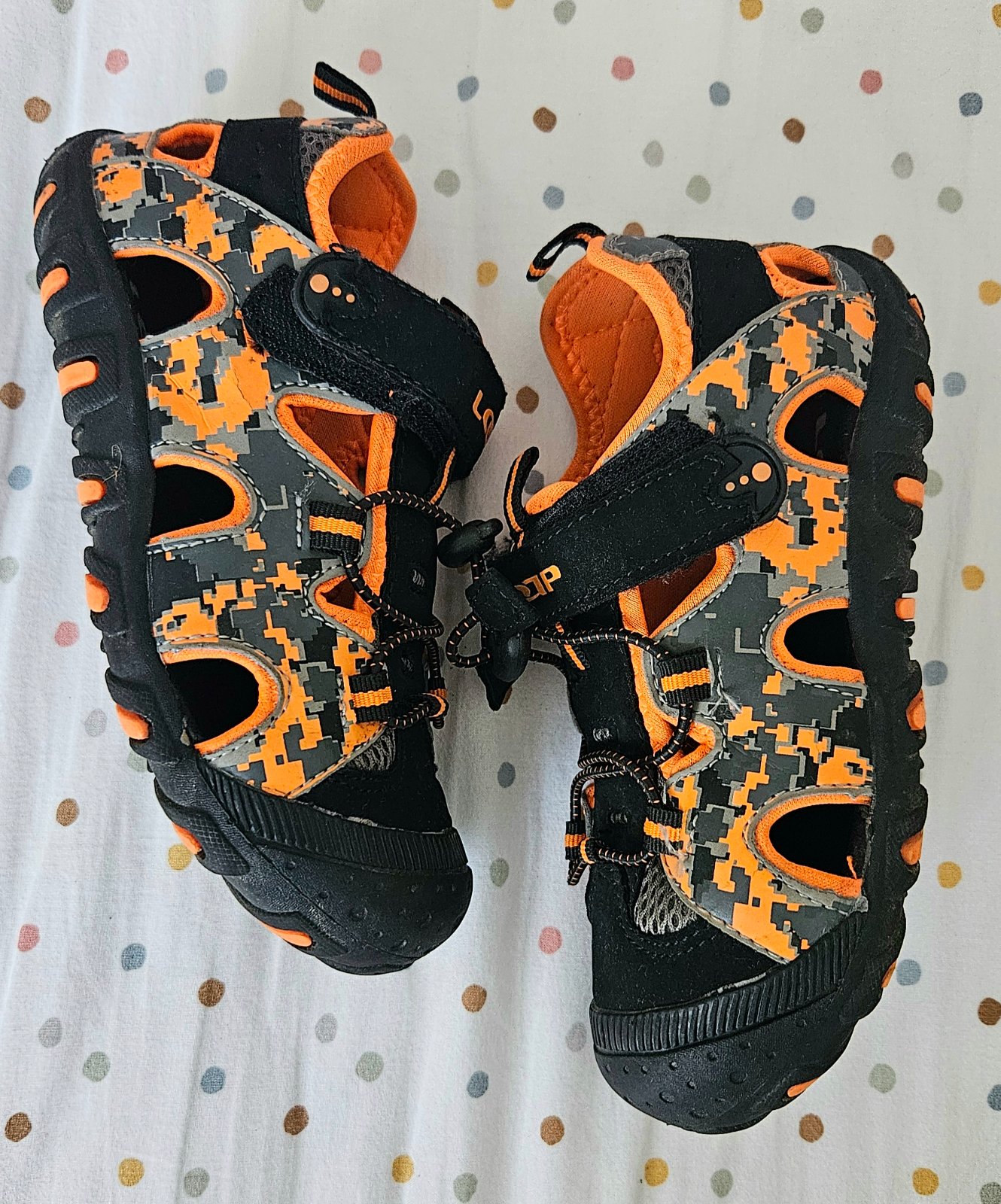 Detské sandále držia nohu pevne, ale zároveň umožňujú jej ľahkému odvetrávaniu pomocou bočných otvorov. Zapínanie topánok je na suchý zips. Podrážka je vzorovaná. Málo nosené, vynikajúci stav bez poškodení. PC.35€
