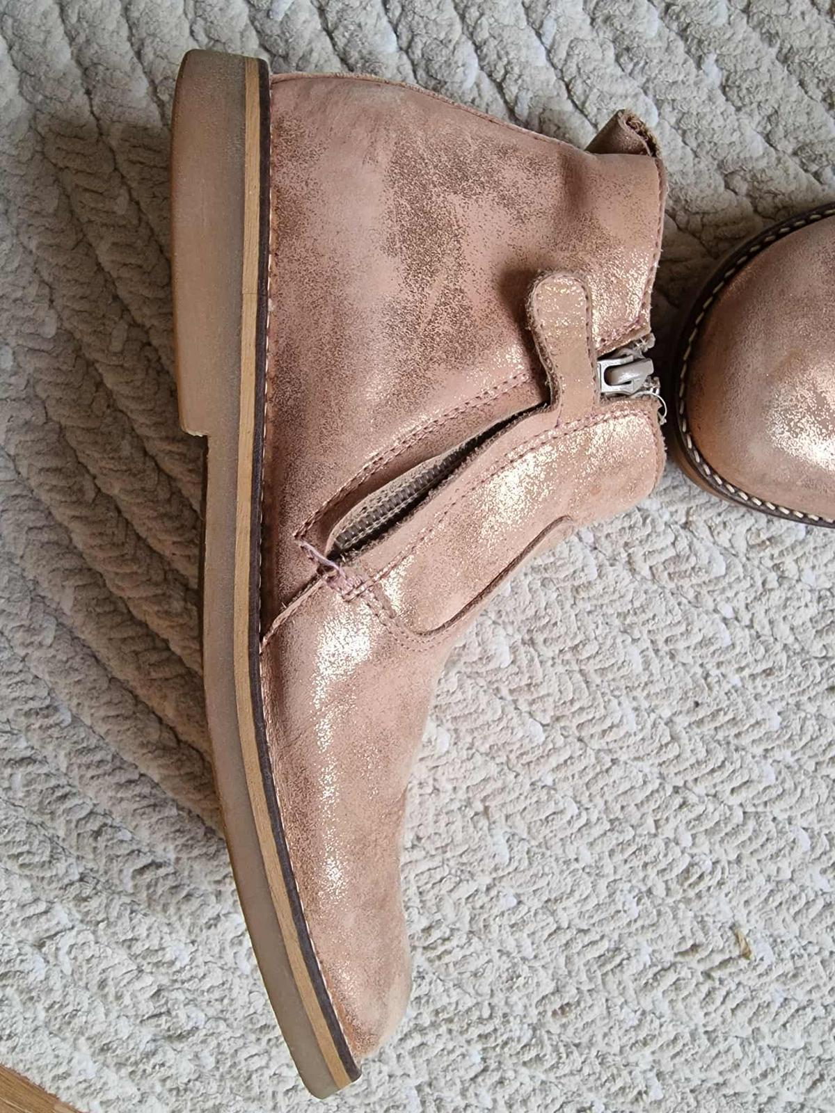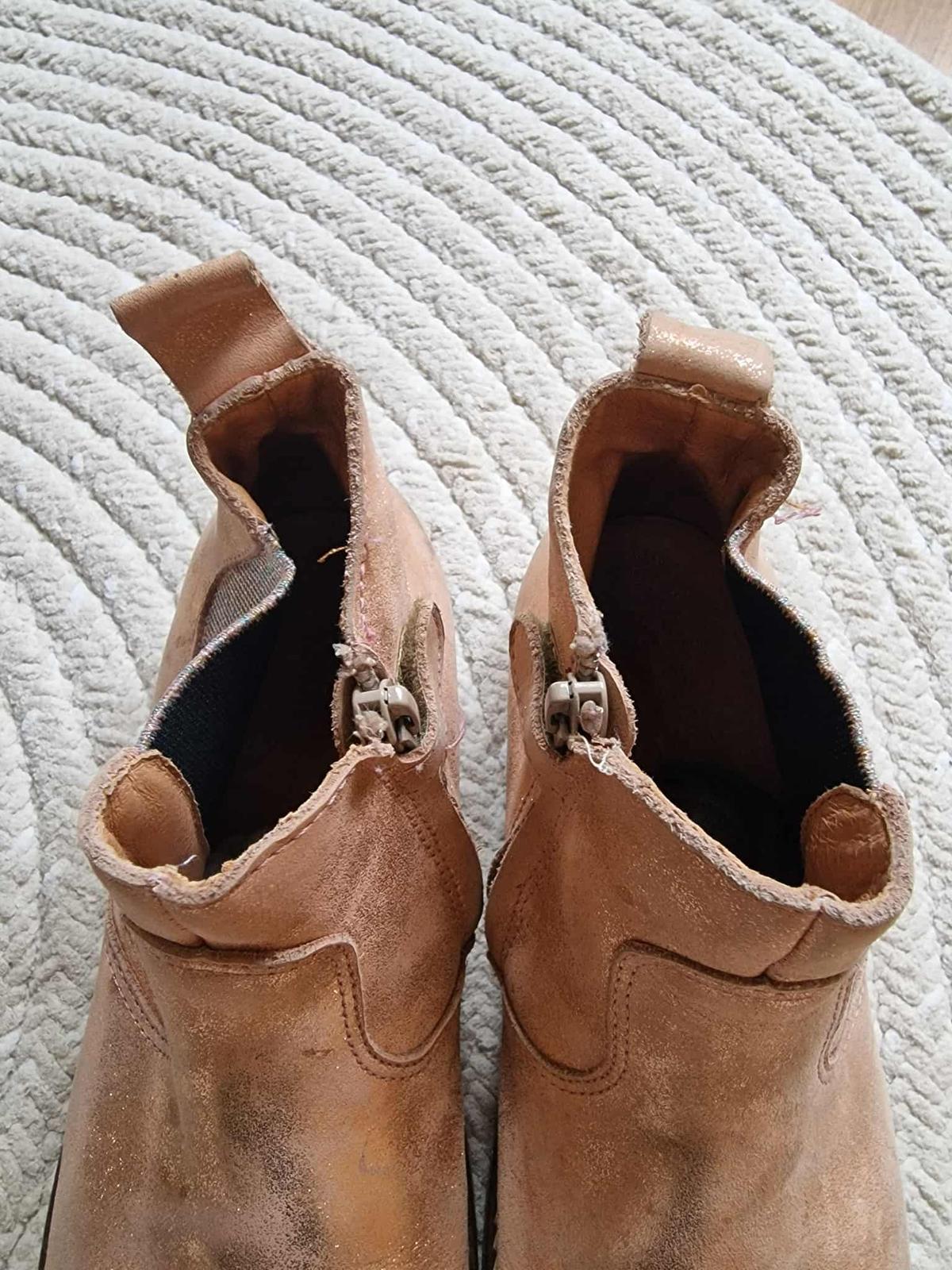 Krasne zimne, kozene clenkove cizmicky. Barefoot. Zateplene jemnou jahnacou kozusinkou. Nosene 1 sezonu, kupovane nove. Farba metalicka /s leskom. Velka spokojnost.