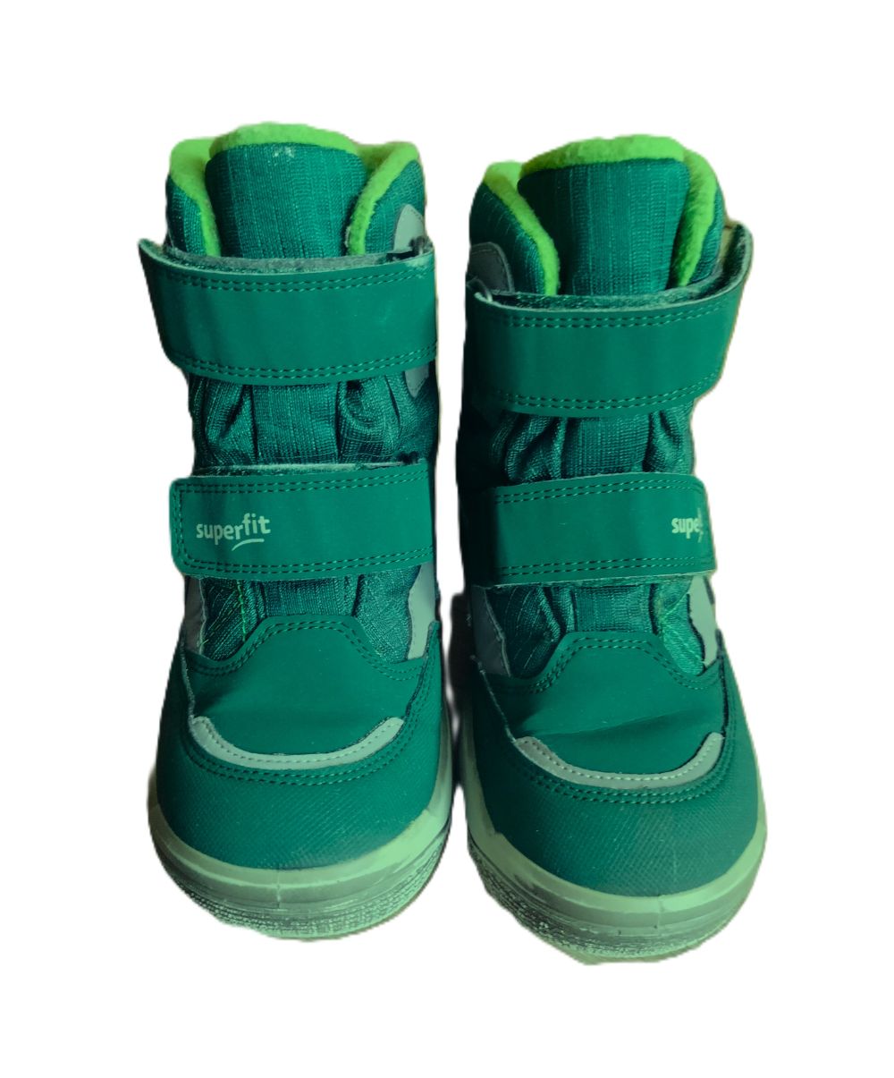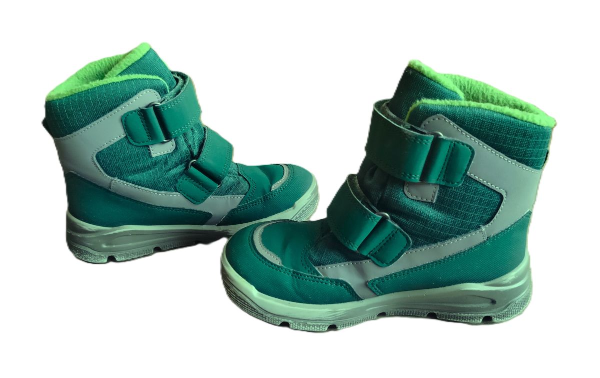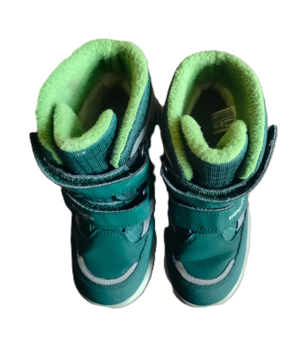Kvalitné teplé čižmičky peknej sýtozelenej farby nosené krátko jedným dieťaťom. Jediné poškodenie je mierne oškretá guma z vnútornej strany, čo pri nosení nevidieť (viď posledná fotka). VD je 19,5cm.